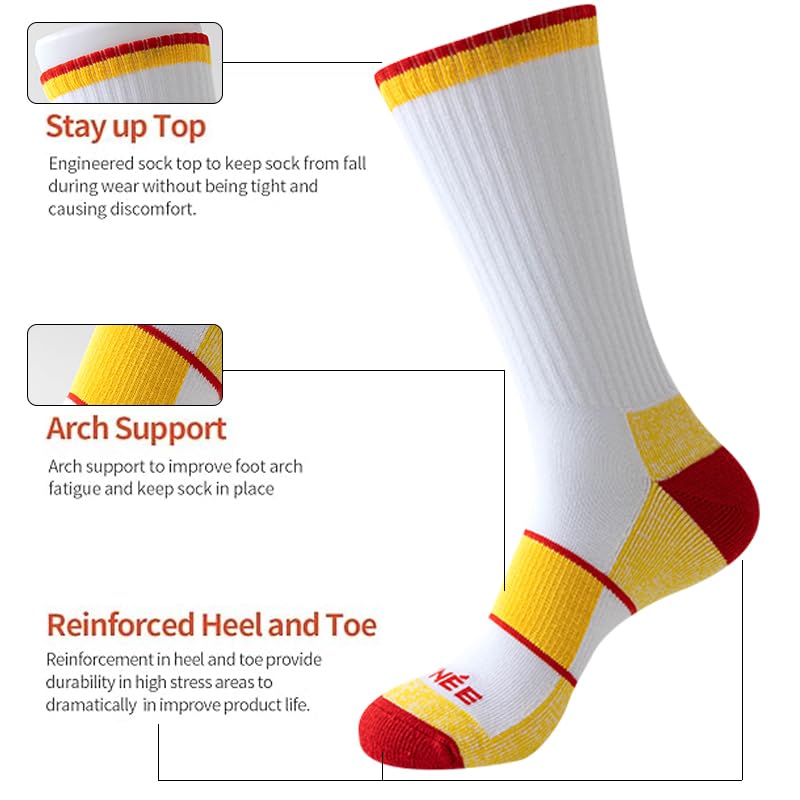 PERFORMANCE: Arch support to improve foot arch fatigue and keep socks in place. Reinforced heel and toe provide durability in high stress areas to dramatically in improve product life. Deep engineered heel pocket to keep fit during wear.
