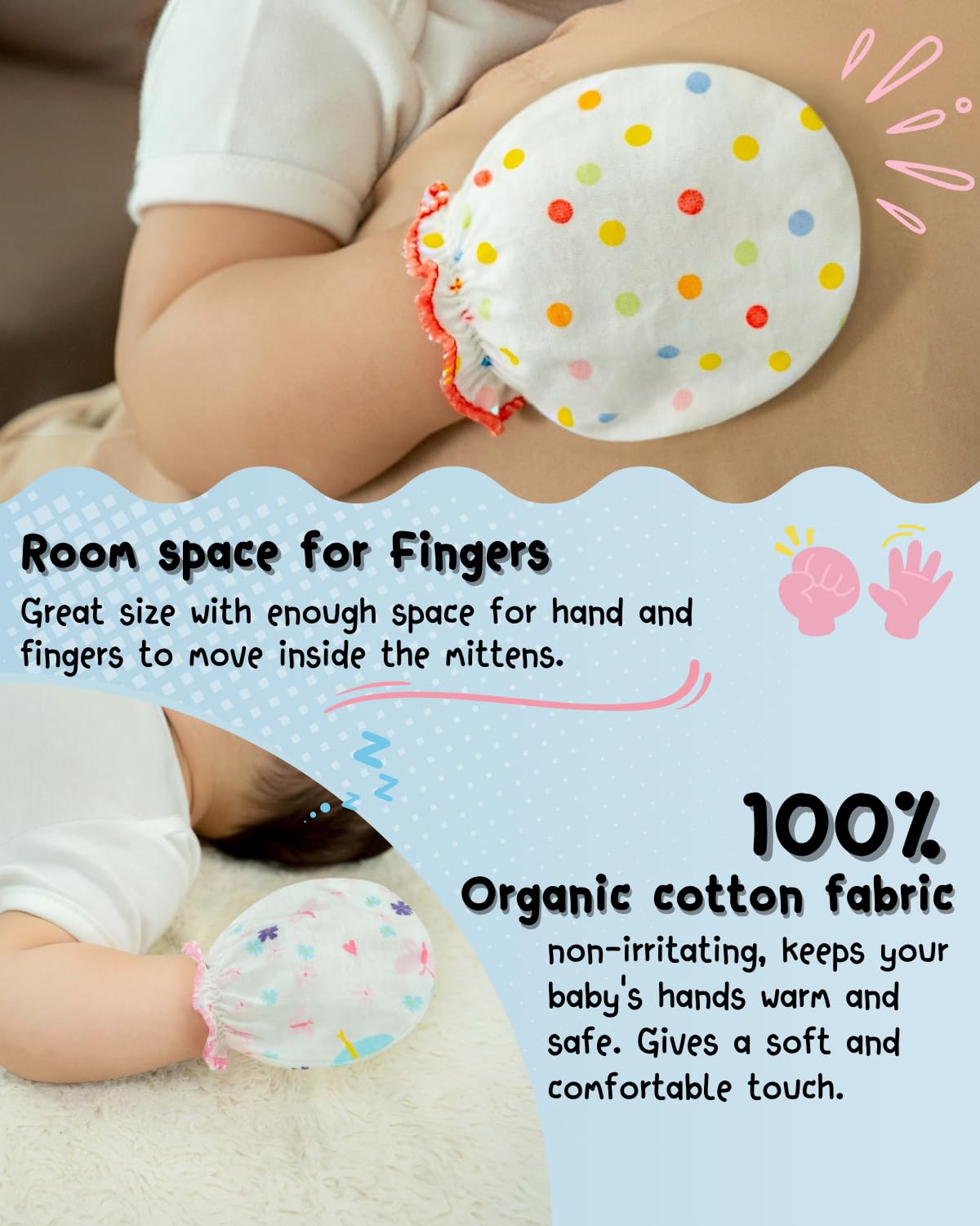 RATIVE newborn mittens made from 100% organic cotton. Protects your baby from scratching their face. and is most friendly to baby's skin.