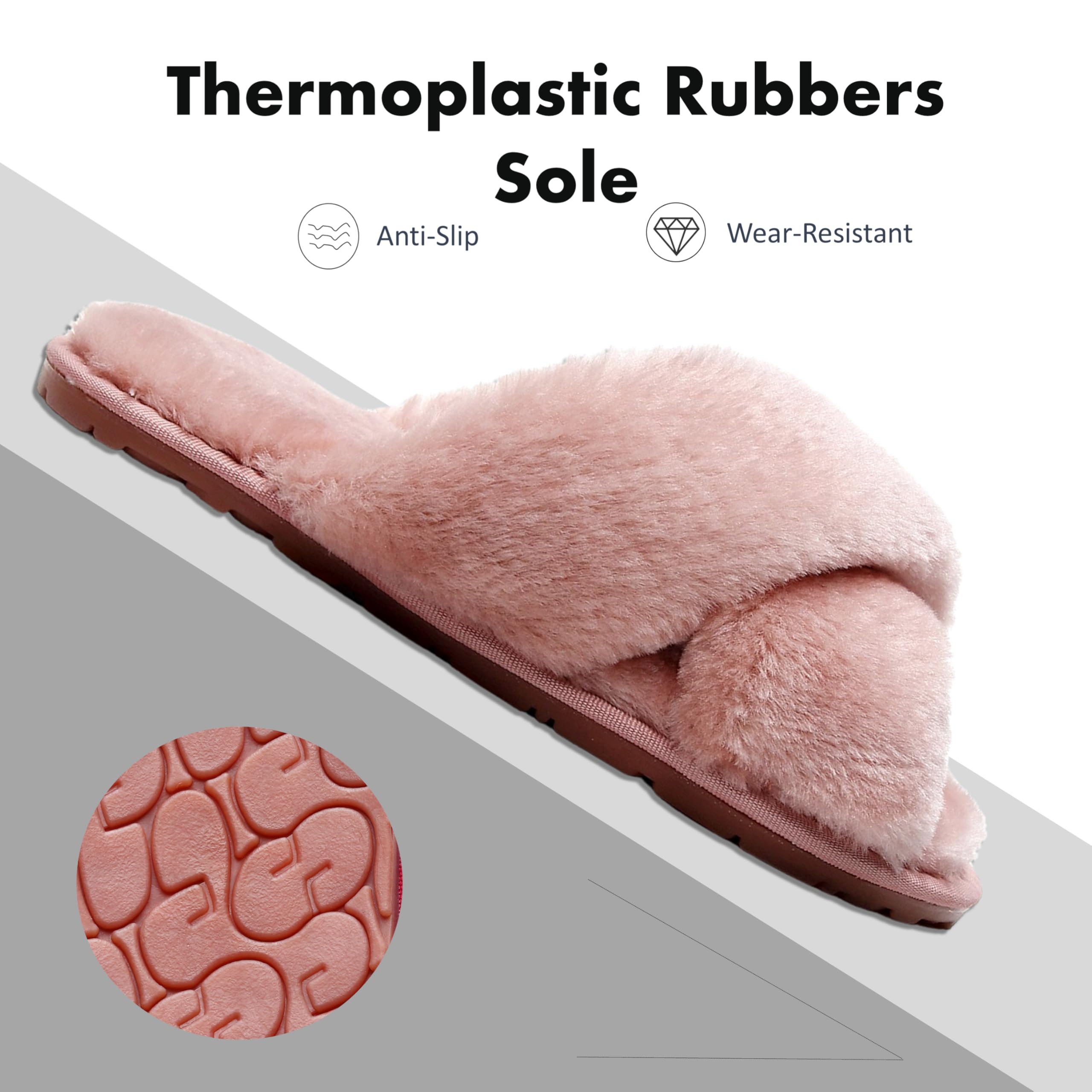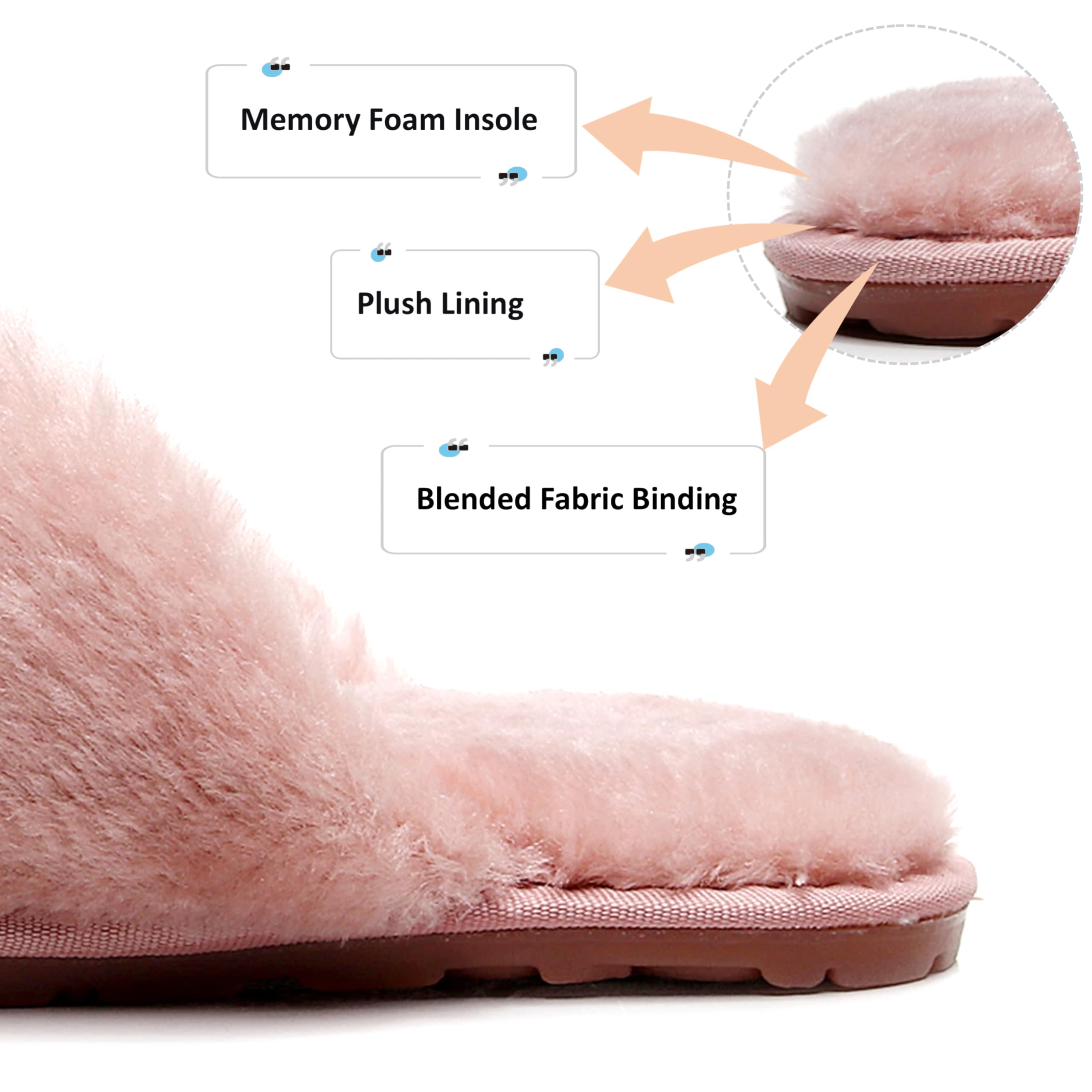 FUZZY PLUSH UPPER: Indulge in pure coziness with our house slippers, the open-toe design and fuzzy faux fur offer a snug feel; The air cushion layer insulates against cold floors, while the knitted structure enhances durability, preventing tears for lasting relaxation