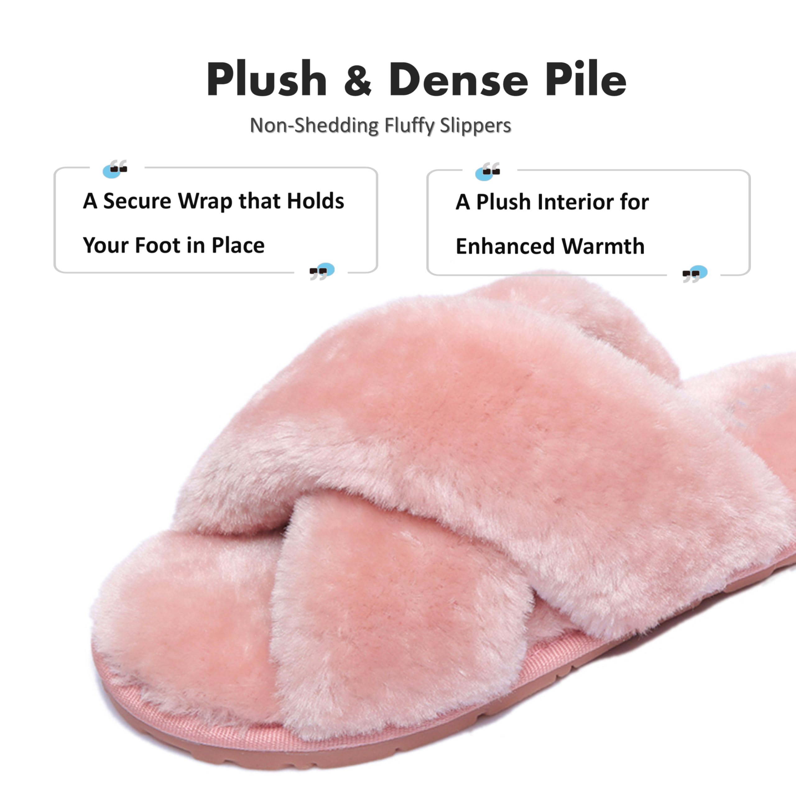 CRISS CROSS FASHION DESIGN: Elevate your style with our Black cross band slippers, boasting a chic criss-cross design crafted from soft faux fur and lined with plush terry cloth; The added touch of fashion-forward glitter trim makes these slides a perfect choice for ladies seeking both glamour and warmth