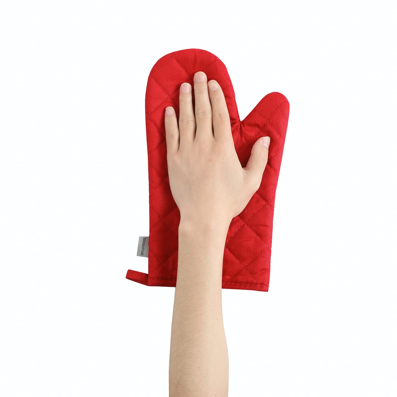 HEAT RESISTANT&HEAVY DUTY:This oven mitts heat resistant 500 degrees because of the glove is filled with 410g/m ² cotton,double thicker than normal 200g/m ² glove,so it can effectively keep you protected from burn while you enjoy cooking and grilling.The oven mitts with advance texture on the surface, not only for better heat resistant, but also with stable and Non-slip grip of all cooking tools.