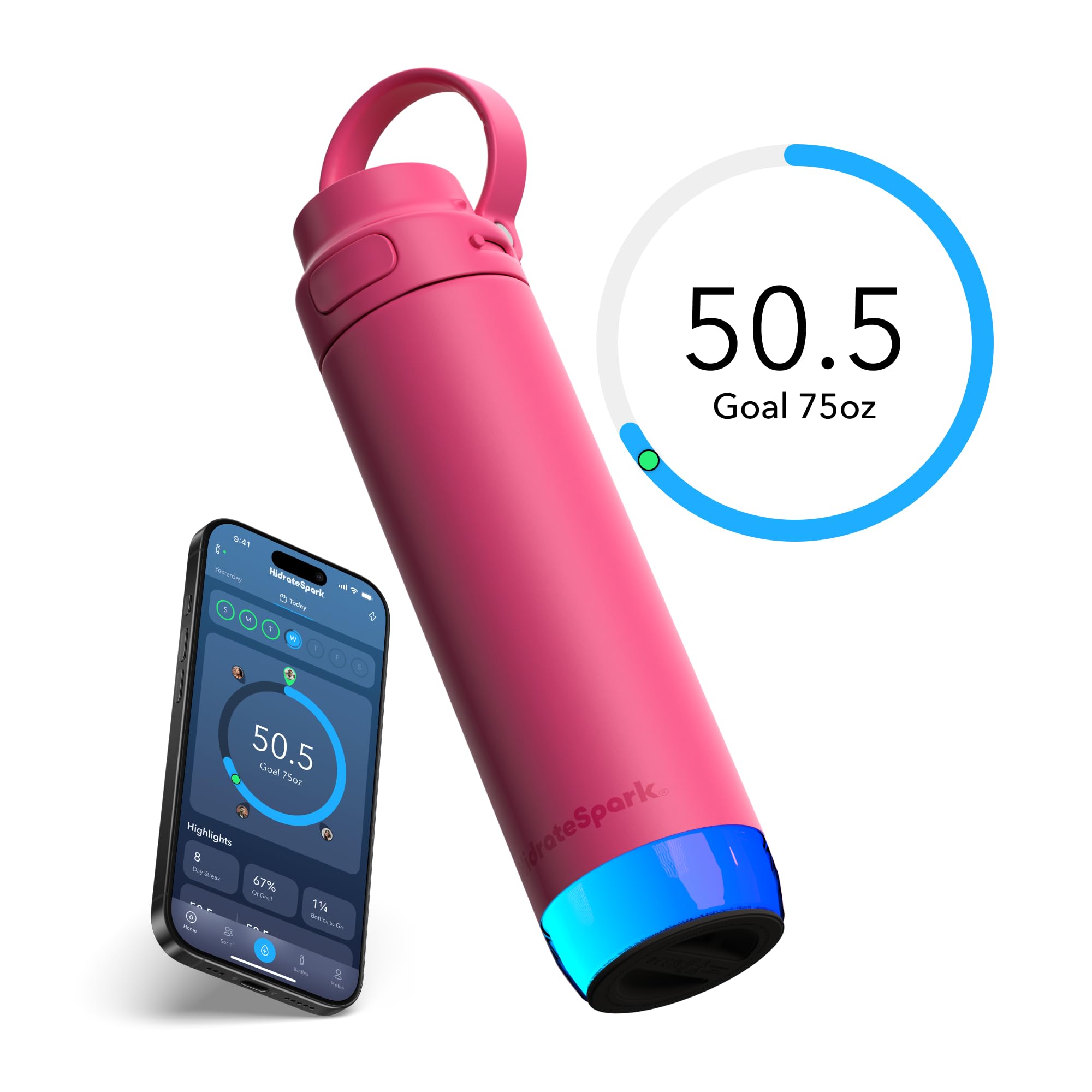Stay hydrated like never before with the 21 oz HidrateSpark PRO 2, the worldβs smartest water bottle made from premium recycled stainless steel. Double-wall vacuum insulation keeps your drink cold for up to 24 hours, while the PRO 2 sensor with SipSense technology tracks every sip and reminds you when itβs time to drink with a customizable 360-degree glow and optional sound alerts. Sync your water intake with the HidrateSpark App via Bluetooth to monitor your progress, set personalized goals, and even locate your bottle using Appleβs Find My Network. The large carry handle and narrow base make it cup-holder friendly and easy to carry wherever you go. Works with the chug or straw lid for ultimate versatility.
