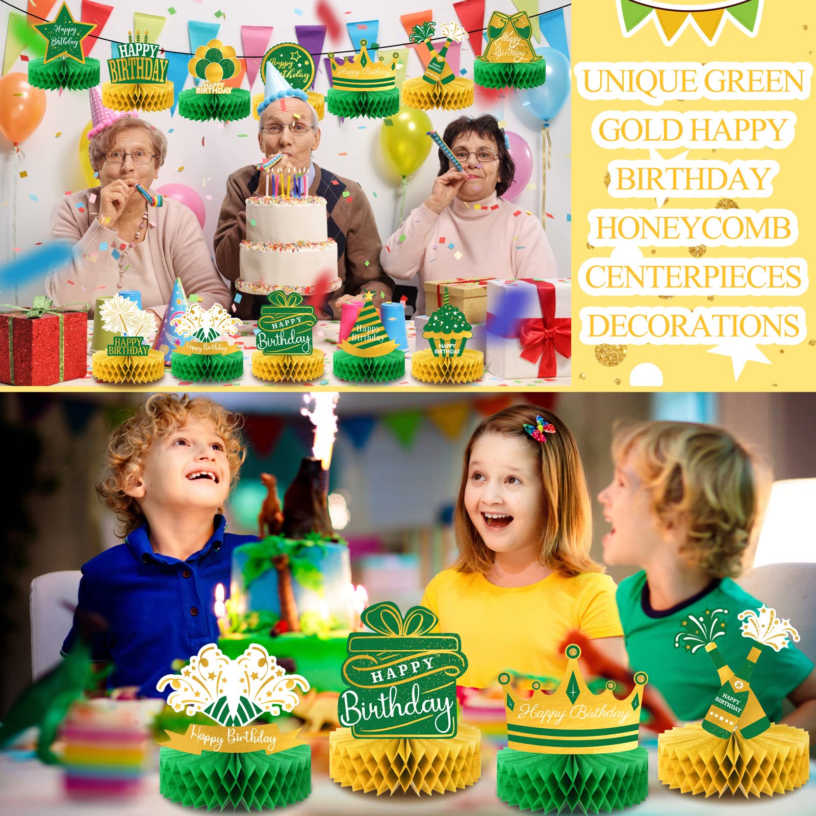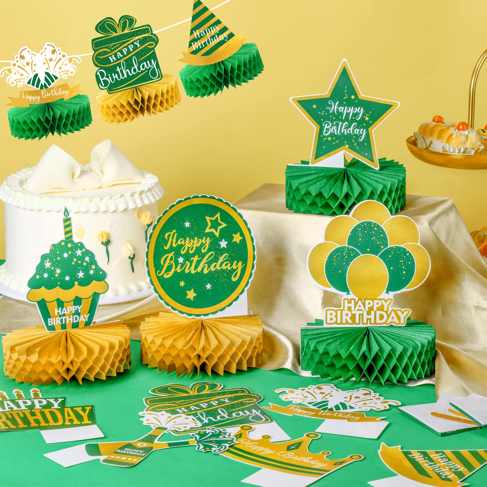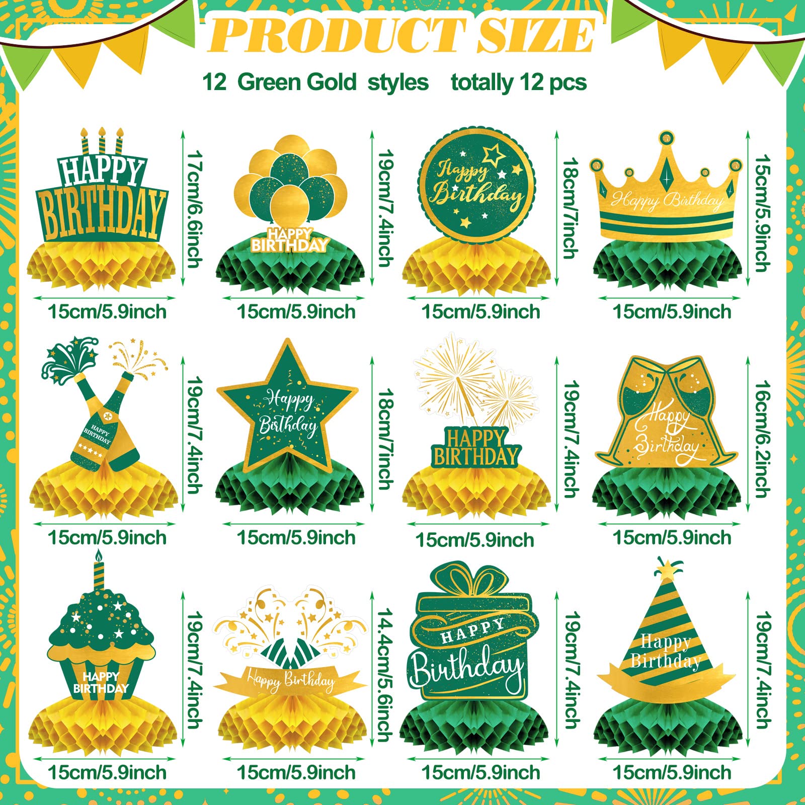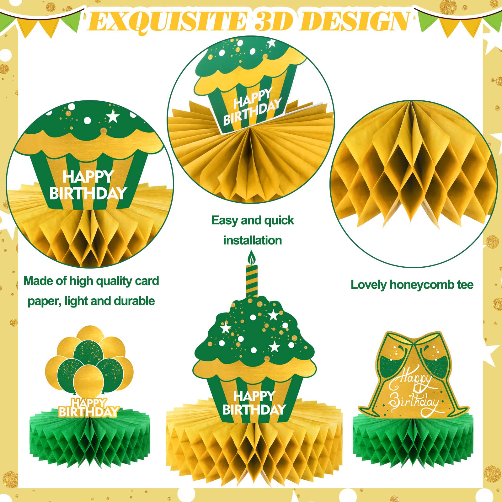 What Will Get: you will receive 12 pieces of green gold honeycomb centerpiece, printed with Happy Birthday, candles, balloons, gift boxes, hats, cake and more, bringing a pleasant theme atmosphere