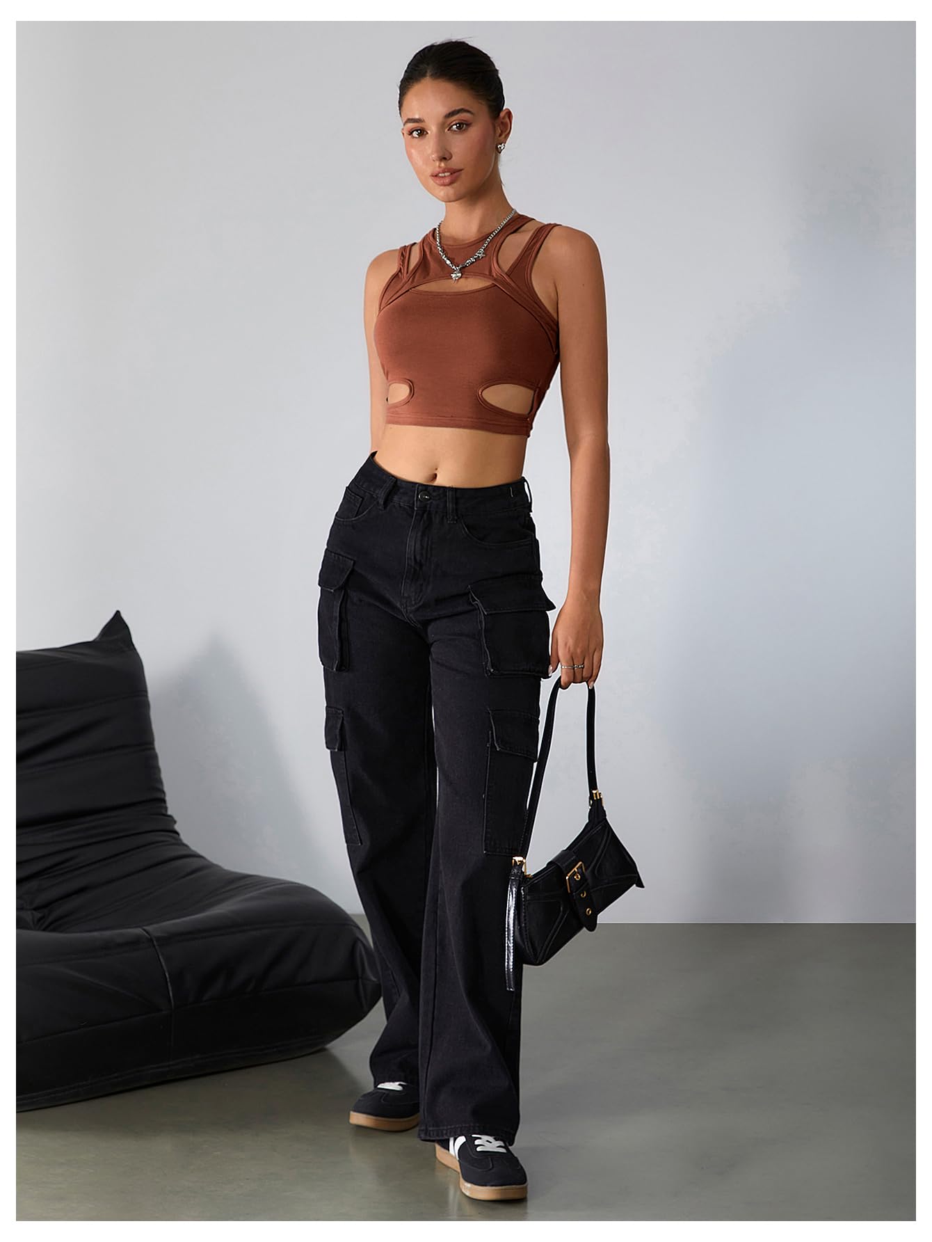 Match: You can pair this cut out tank top with high waisted pants, jeans, cargo pants or skirts for a chic look