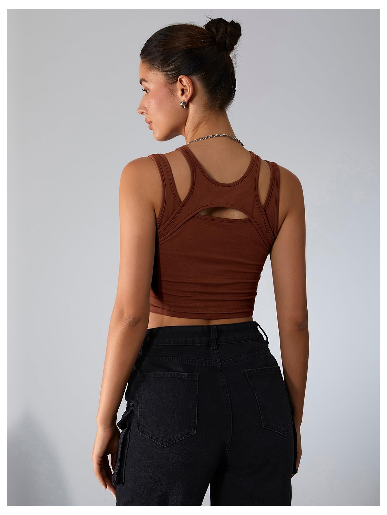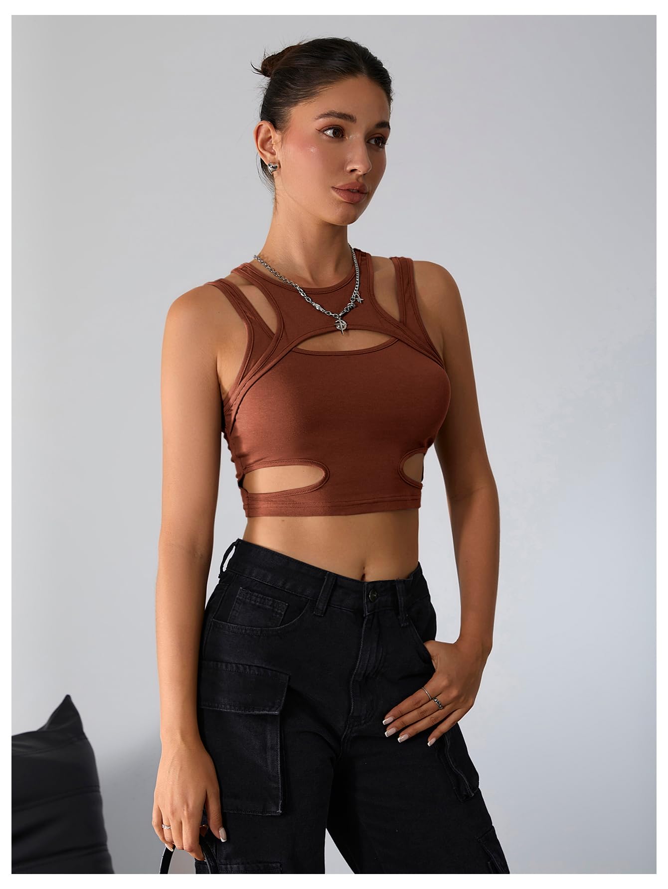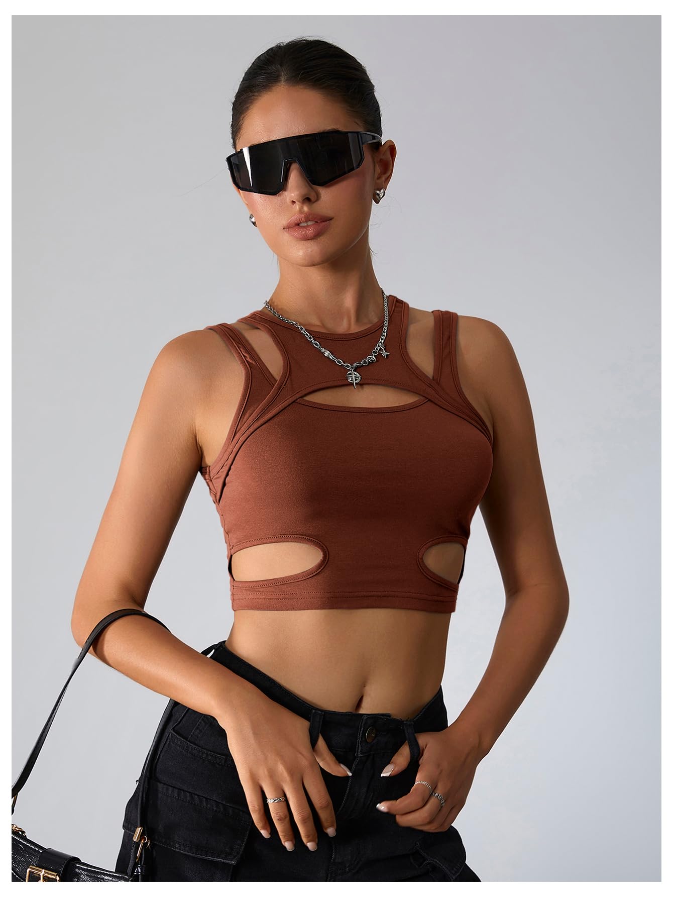 Feature: Cut Out, Sleeveless, Round Neck, Slim Fitted, Plain, Cropped Length, Trendy Tank Tops for Women
