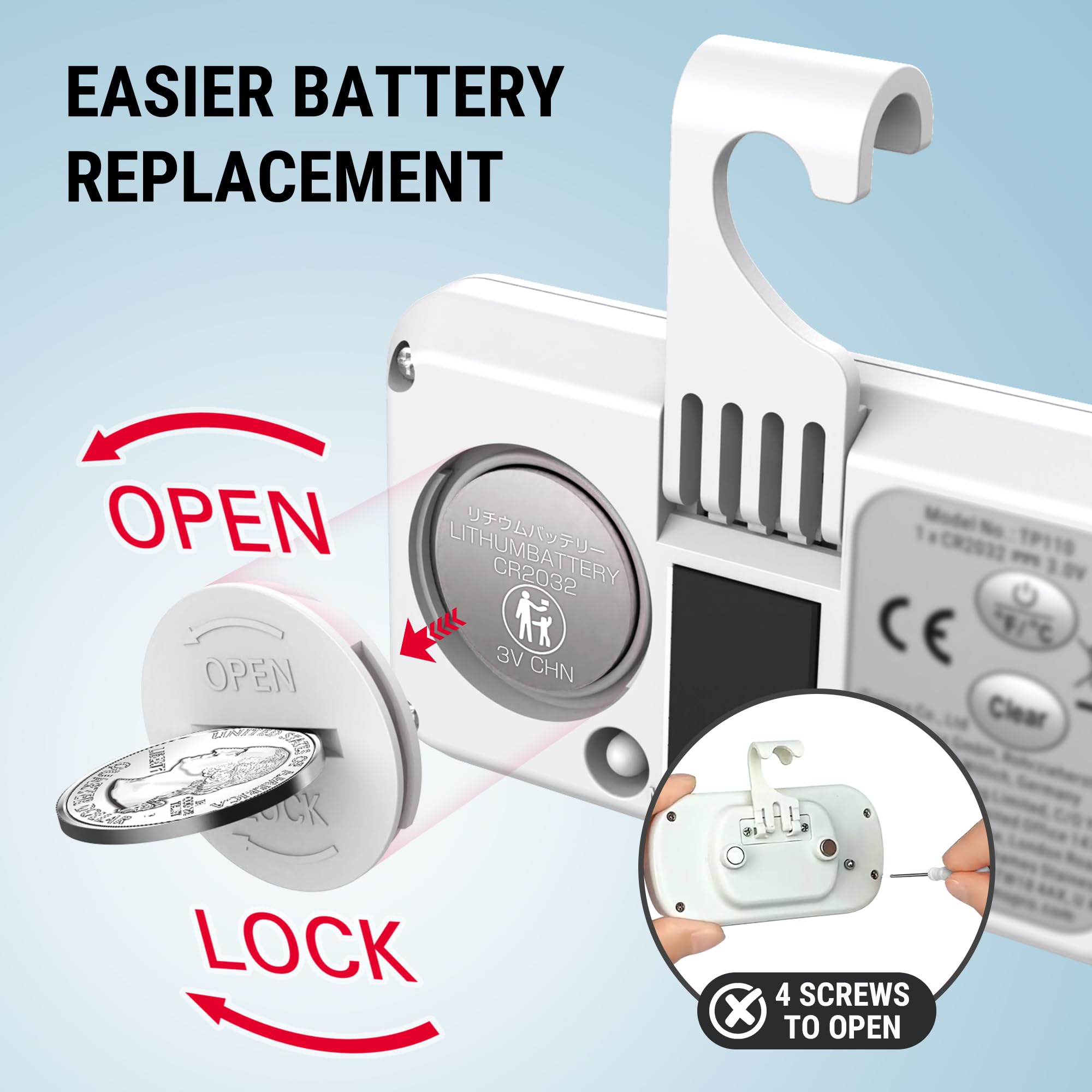 【Hassle-Free Battery Replacement】Unlike other fridge thermometers that require a screwdriver to open, our battery cover can be easily twisted open with a coin. No hassle, no tools—just swap batteries in seconds!