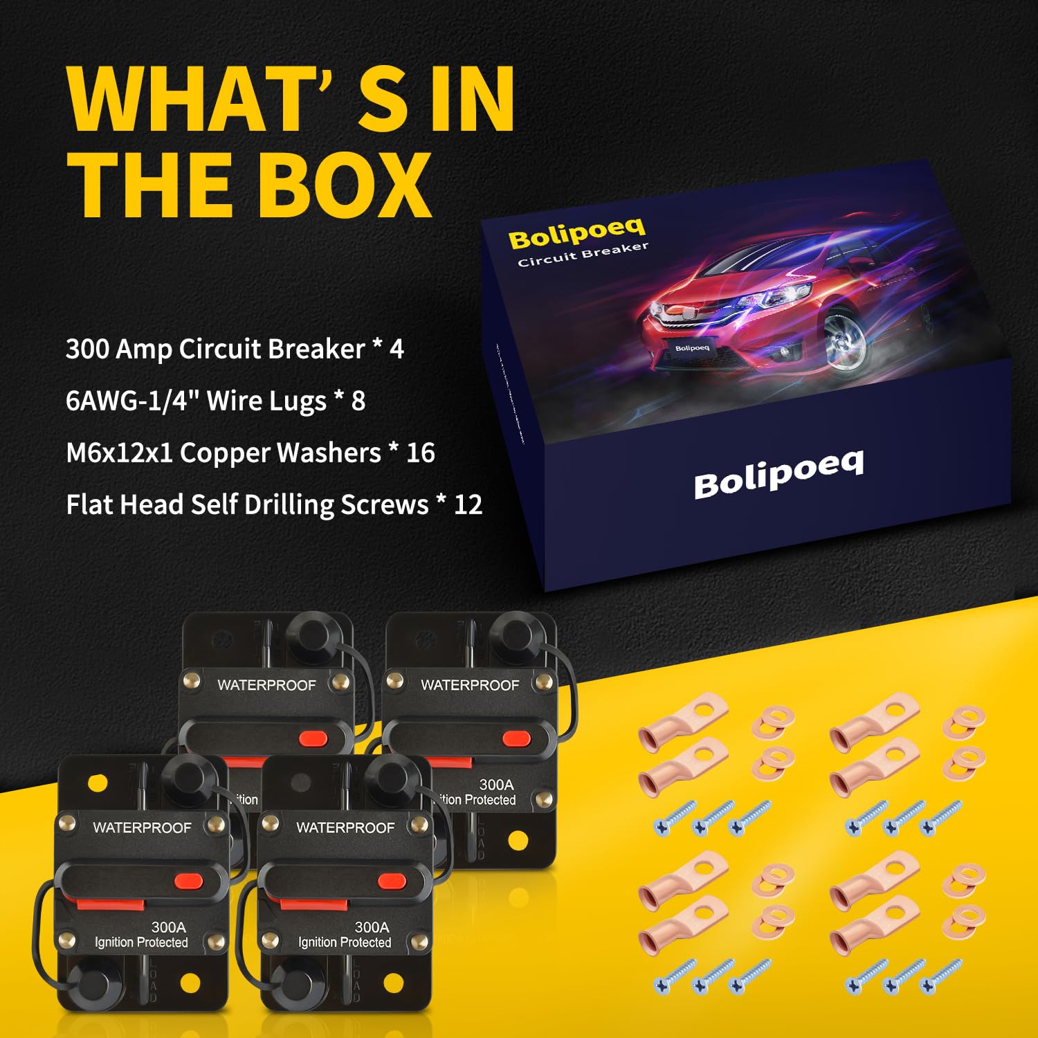 【Easy Surface-Mount】: Bolipoeq 12v dc circuit breaker is surface-mount design, simply mount them on panel or firewall, hassle-free installation. What you get: 4 x auto 300 amp Breaker, 8 x Wire Lugs, 16 x Washers, 12 x Mounting Screws.