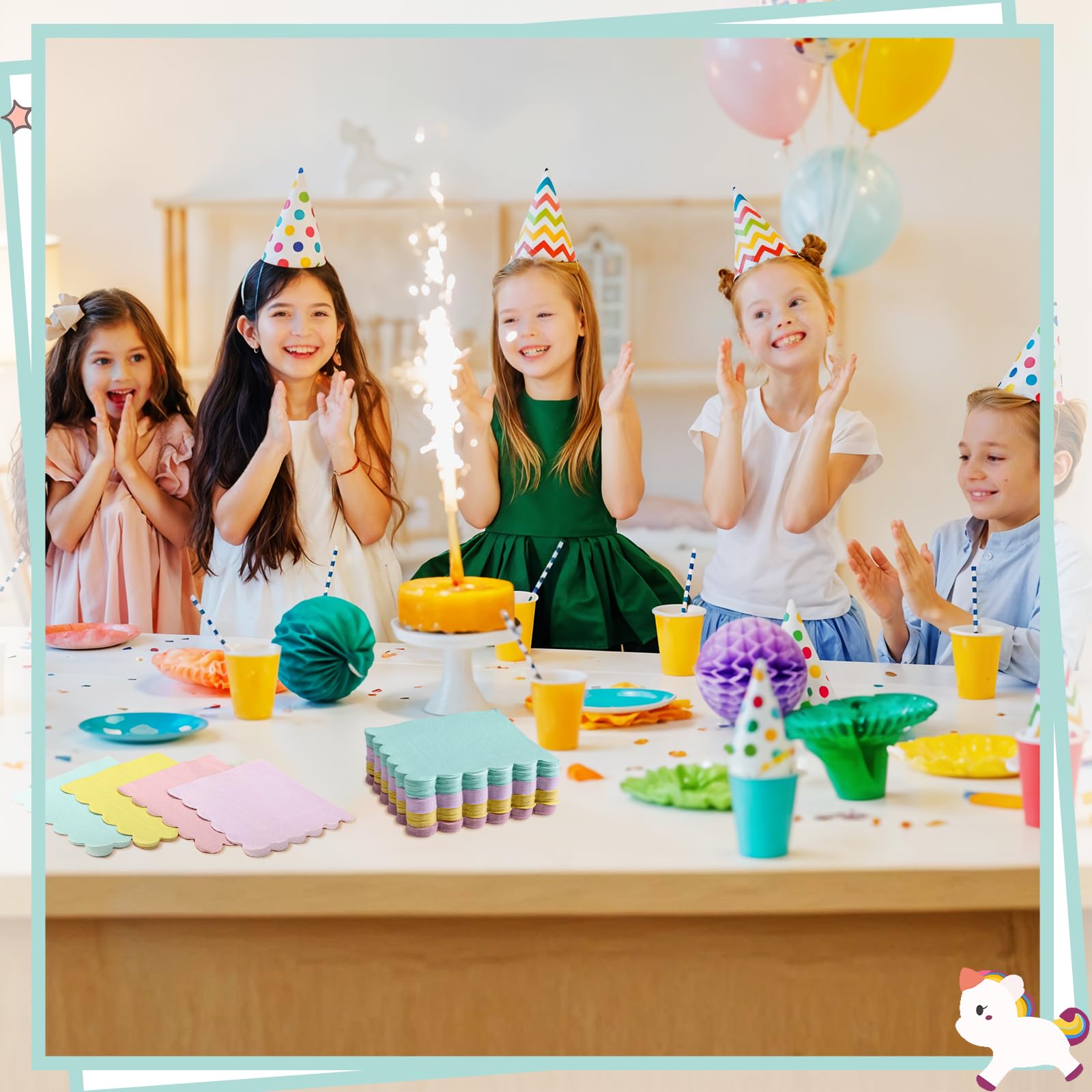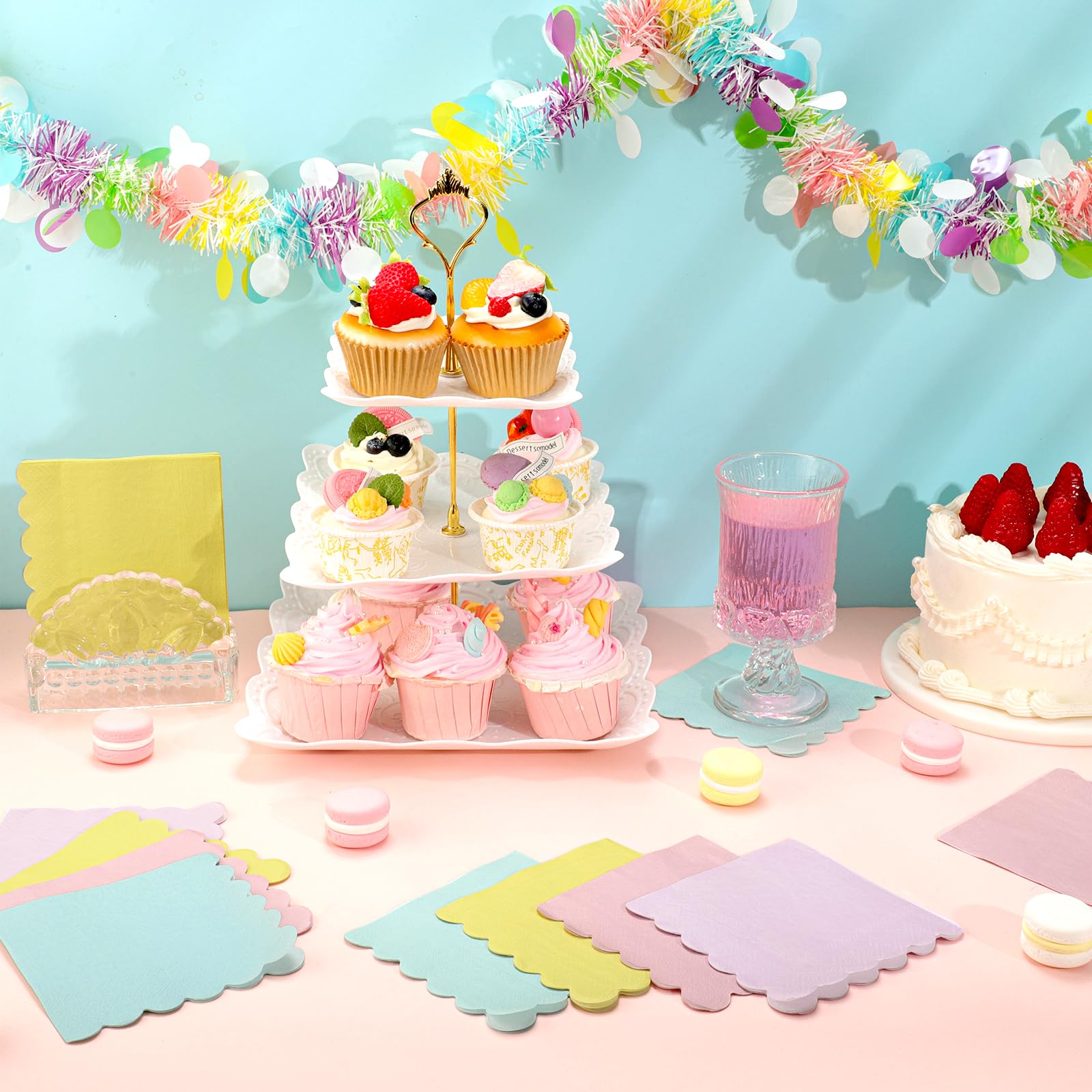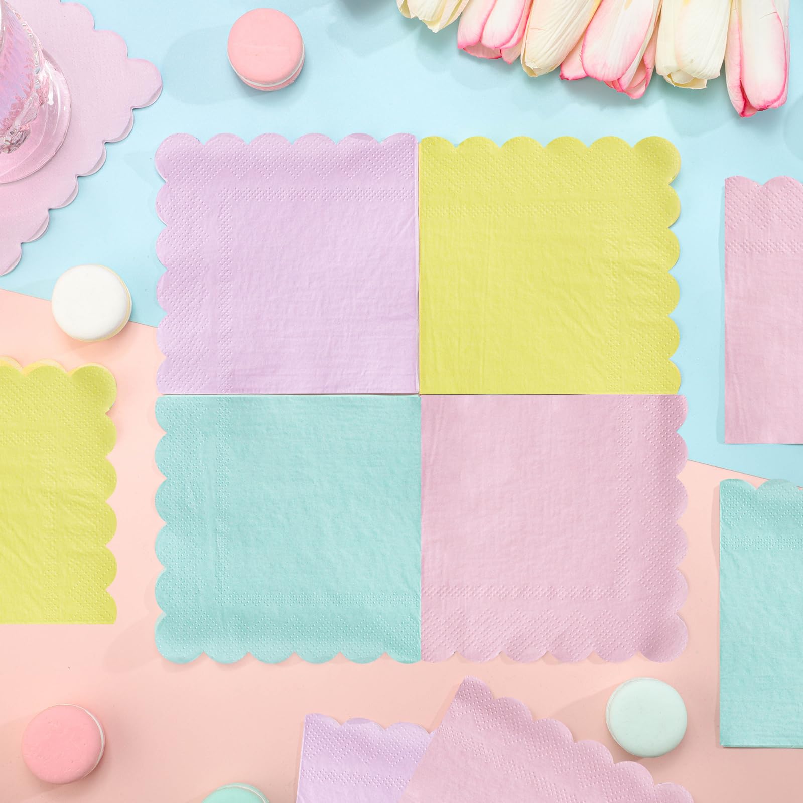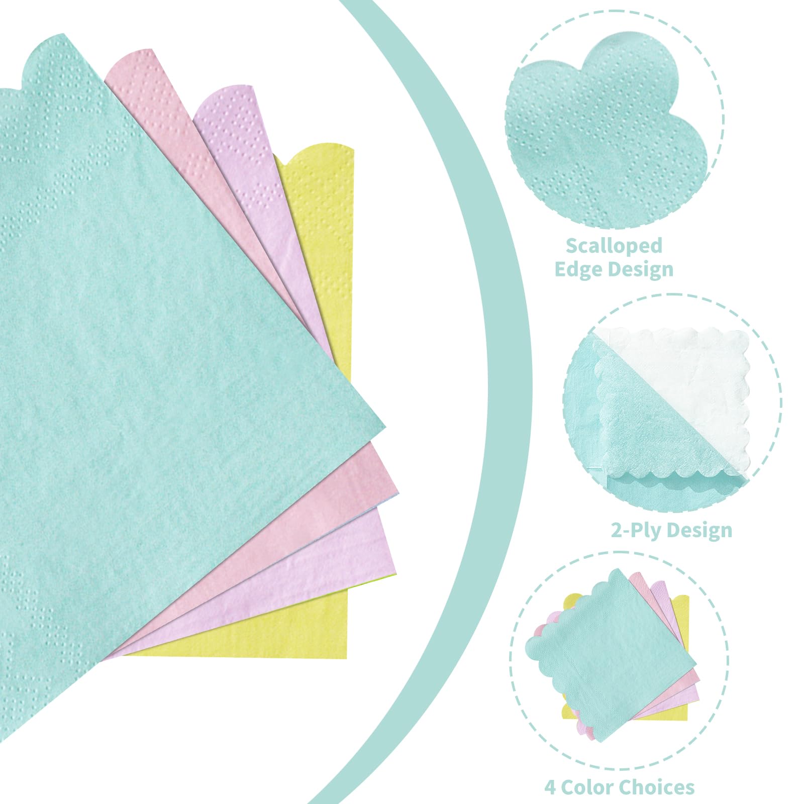 Gradient Pastel Color Design: Disposable cocktail napkins are available in 4 different pastel colors, such as pink,yellow,purple,blue. The classic scalloped rim enhances cute of party napkins, making it a better decoration for party tables