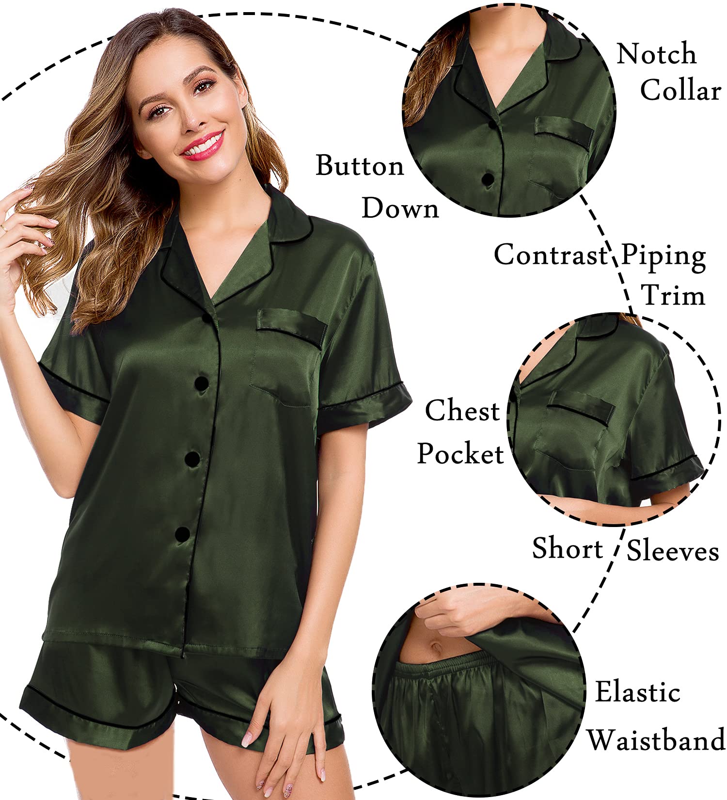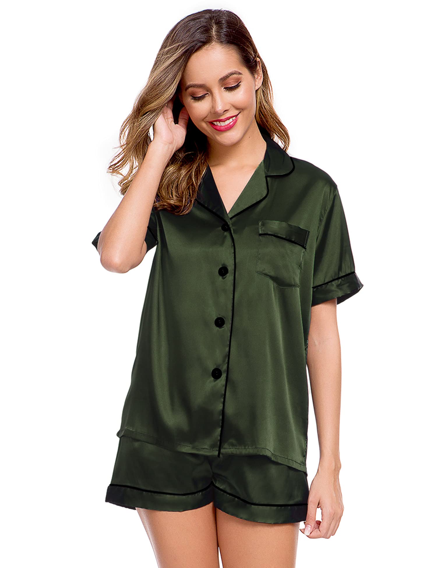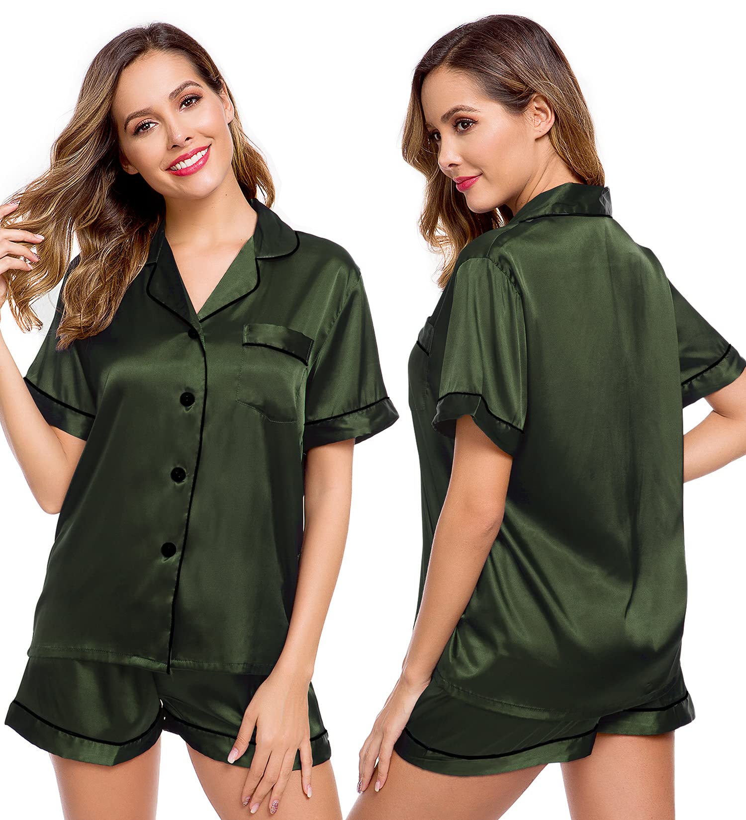 Features: The relaxed fit two-piece comfortable sleepwear pajama set features silky shorts with elastic waistband and matches a silky-smooth short-sleeve V-neck top with a chest pocket, notch collar and the button-front top hits at hips. The sleepwear set are soft and elegant, to giving you a lazy sleep.