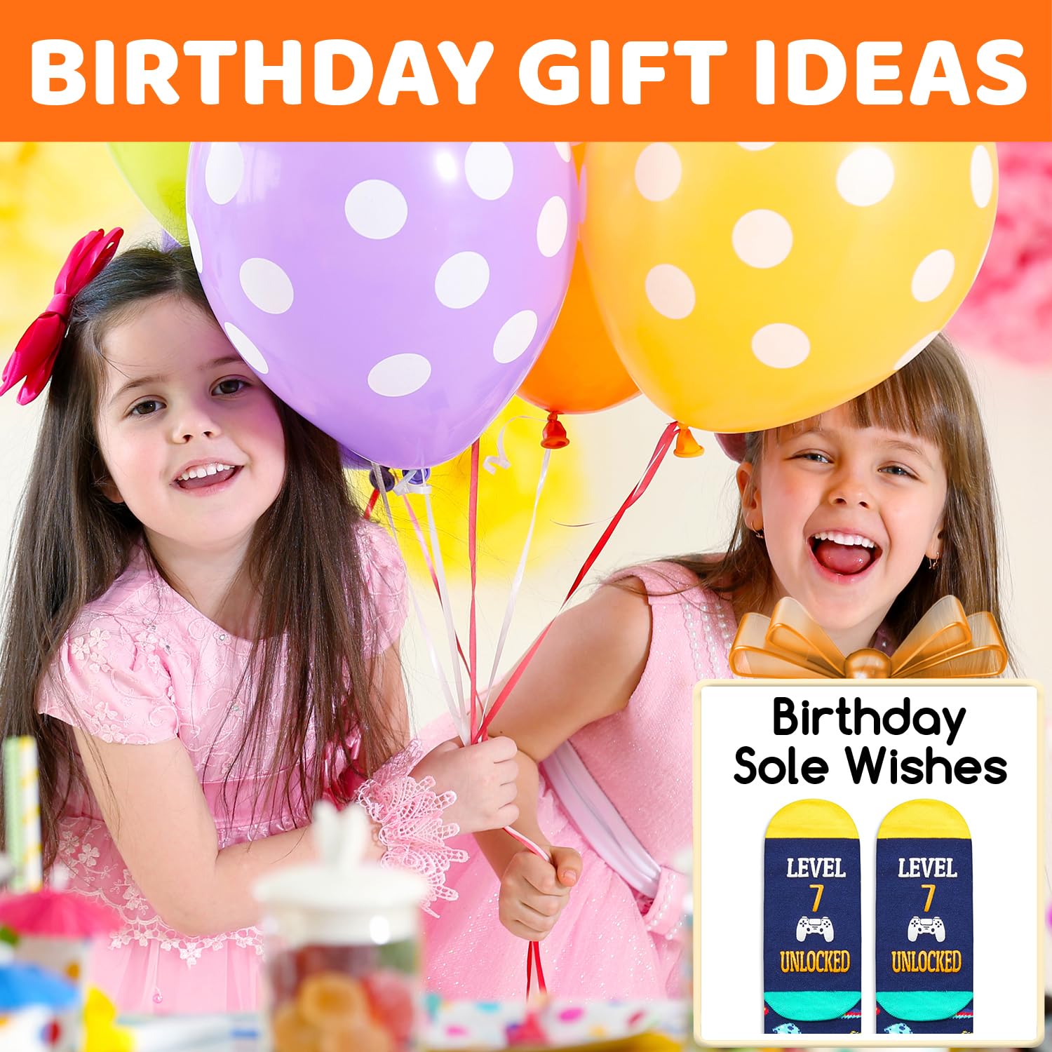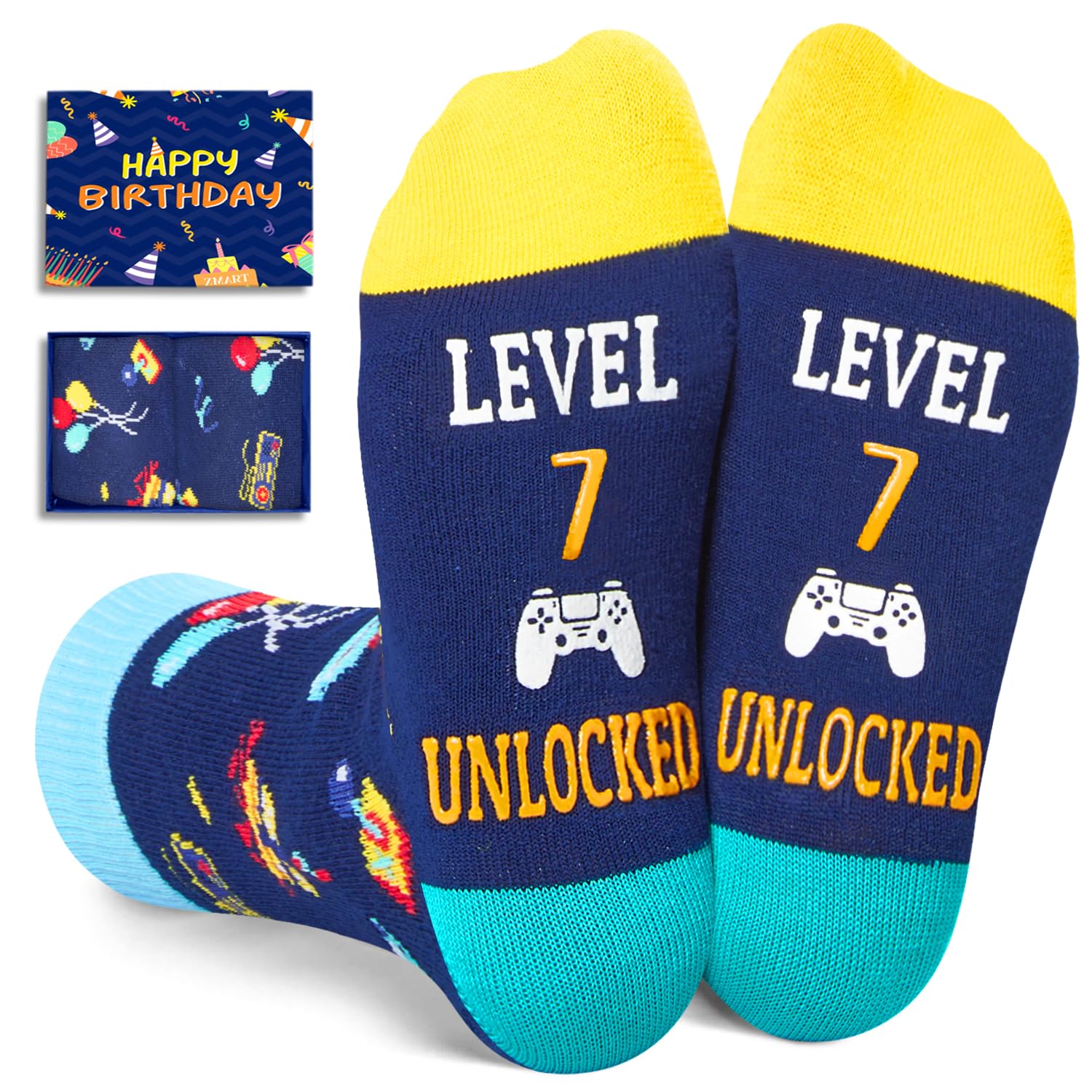 GIFTS FOR CHILDREN: These socks feature birthday gifts, balloons, game machines, and other elements on the top, while the bottom features a hilarious secret message written in non-slip ink: "LEVEL 7 UNLOCKED." They are suitable for any holiday gifts, such as Birthday gifts, Christmas gifts, or White Elephant gifts.