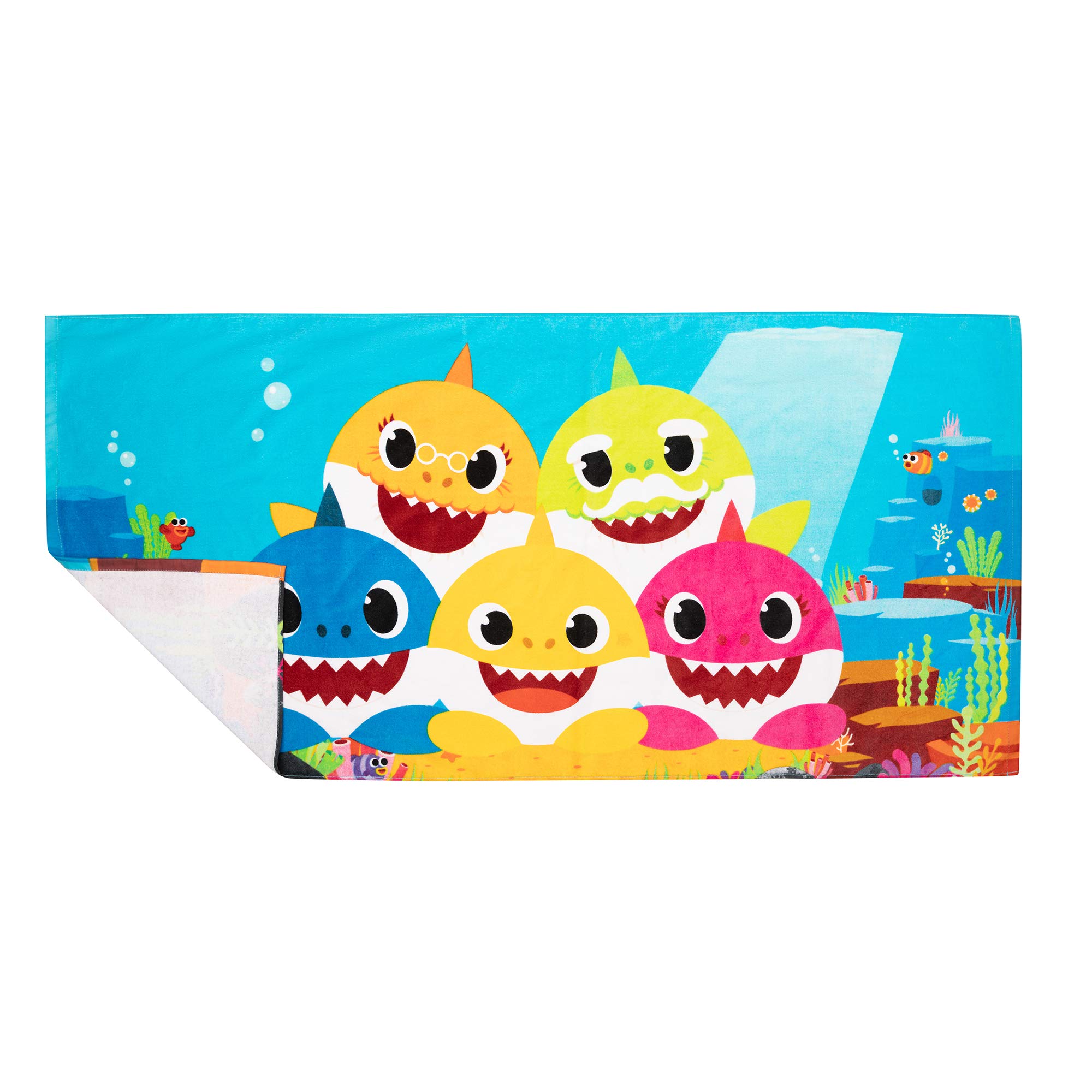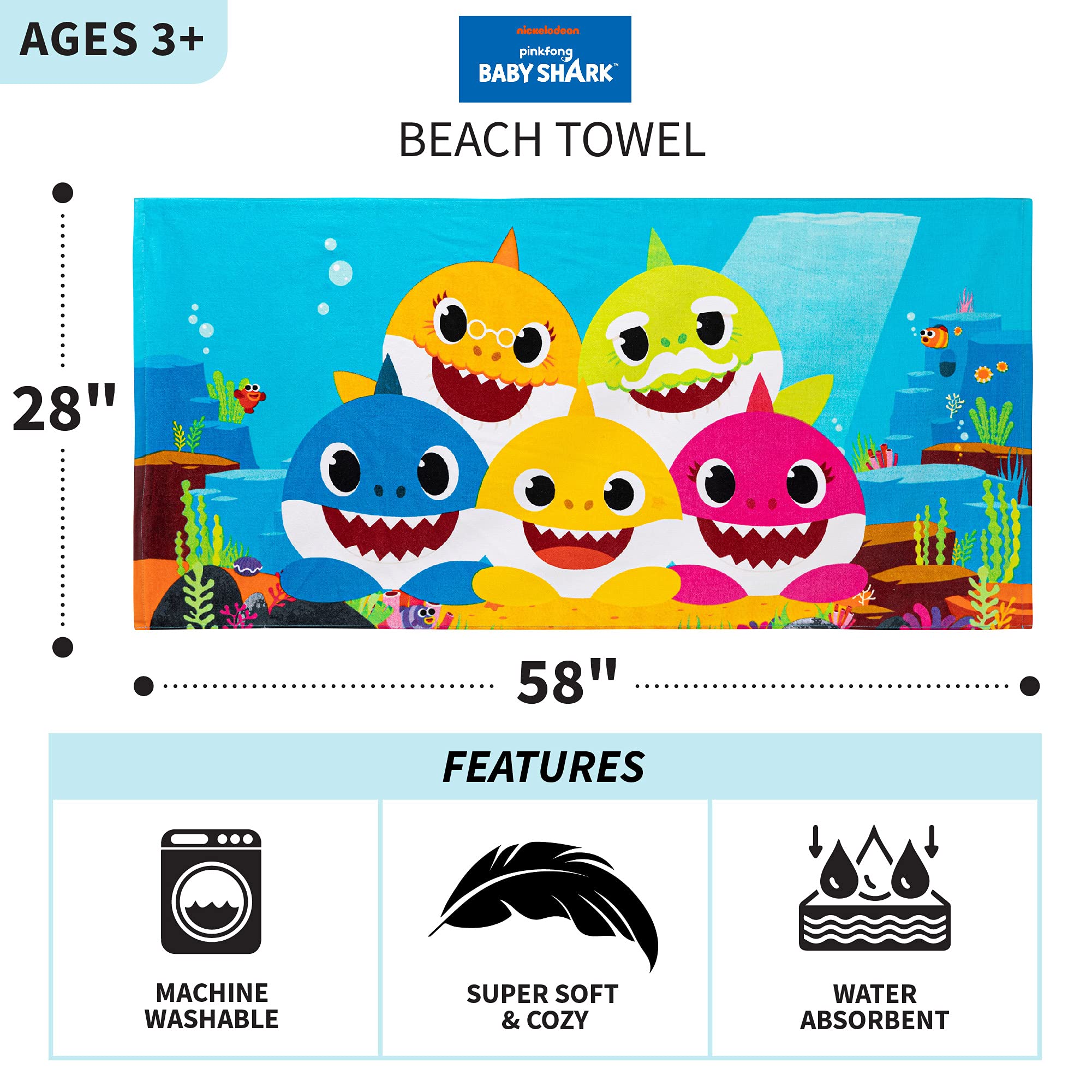 BABY SHARK DESIGN: Baby Shark and the whole Shark family are ready for bath-time, pool-time or beach-time fun with this cool and colorful beach towel. This animated towel features vibrant imagery of Baby, Mama, Daddy, Grandma and Grandpa Shark from the adorable Nickelodeon show.