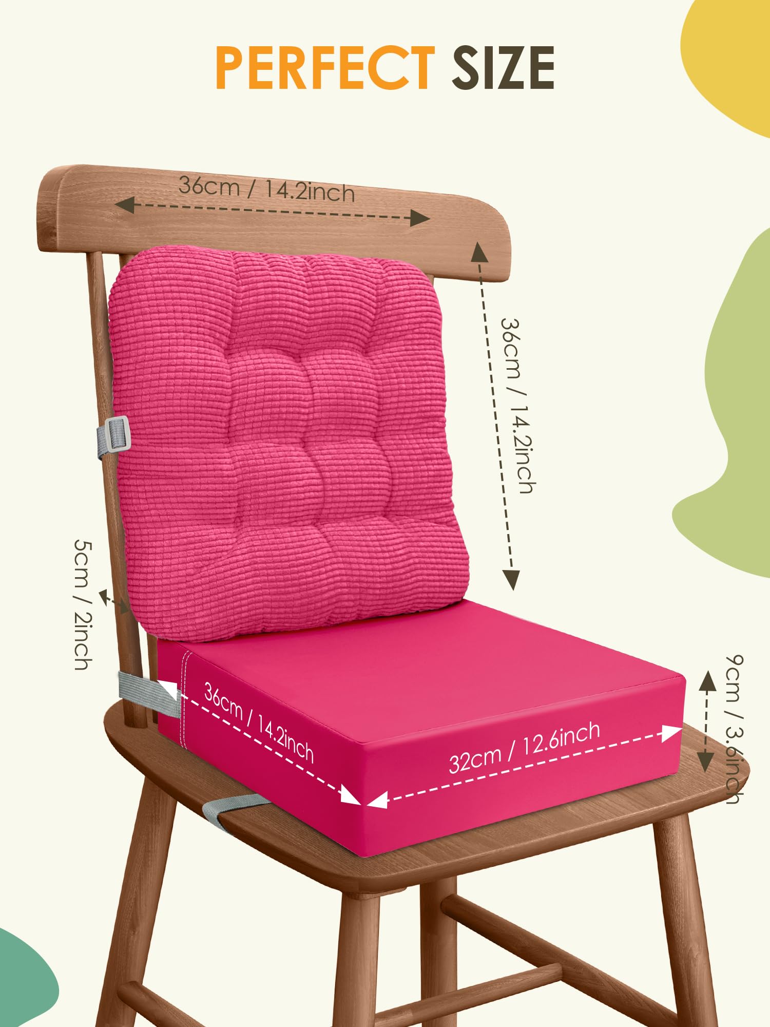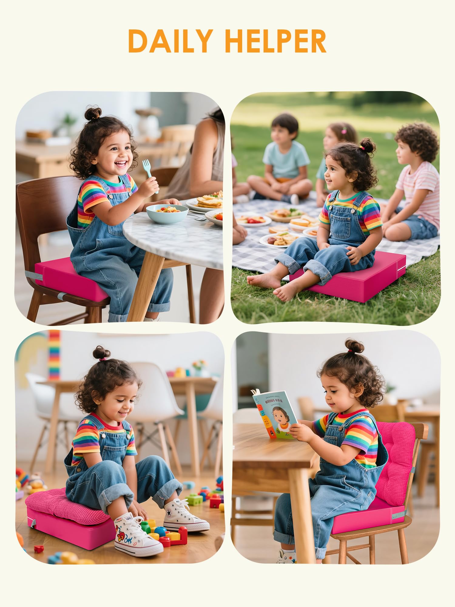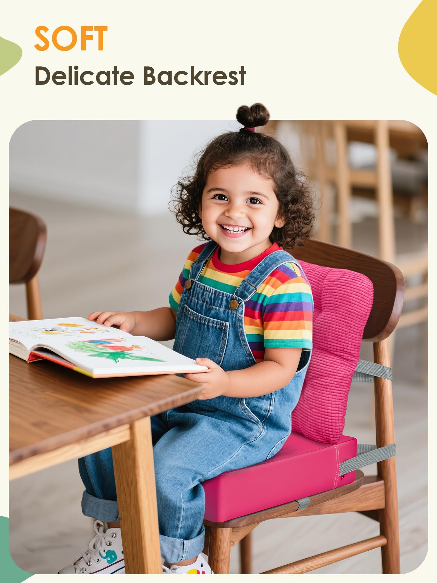 【UPGRADED STRAPS & BUCKLE FOR SECURITY】The booster seat for kitchen dining chair equipped with four extended safety belts with upgraded anti-slip particles on it, give firmly securely fixed to the bottom and back of the chair. The seat cushion and backrest are soft and lightweight, can also be used as a normal cushion for sitting on the floor, reading, playing games.