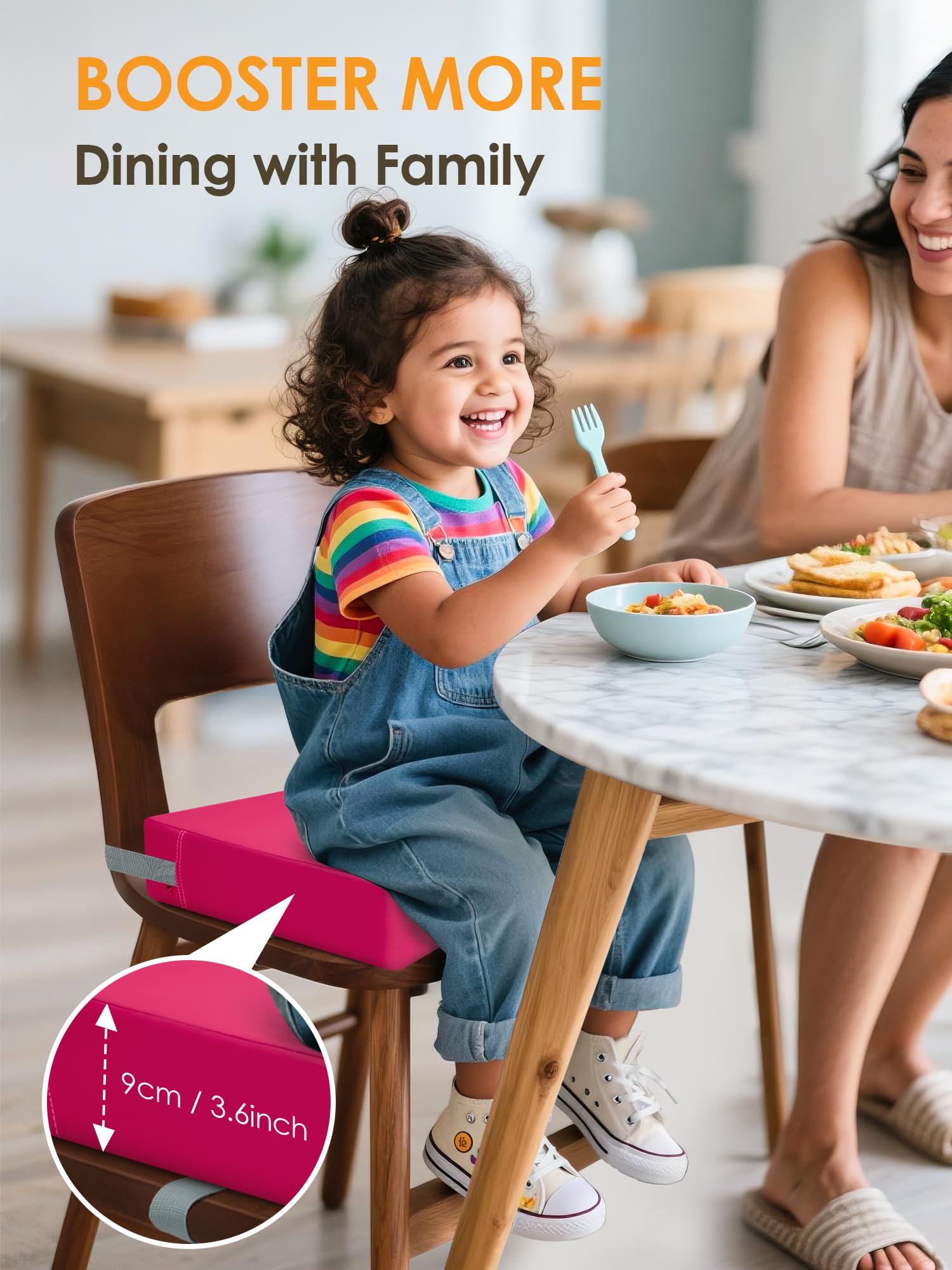 2.5" High-Density Sponge Core with 85% rebound rate retains shape after 1000+ uses, 3.55" Lift Height designed , helping 2-6-year-olds comfortably access plates/cups without kneeling or straining.Waterproof PU Leather Surface repels juice/milk instantly; simply wipe clean with a damp cloth—perfect for messy toddler meals!Adjustable Straps lock securely on chairs (14”” width), tested by 50+ wiggly kids—zero slips guaranteed! Only 2.05lbs! Carry it to restaurants/grandma’s house, or use as a step stool for sinks—folds flat for storage!