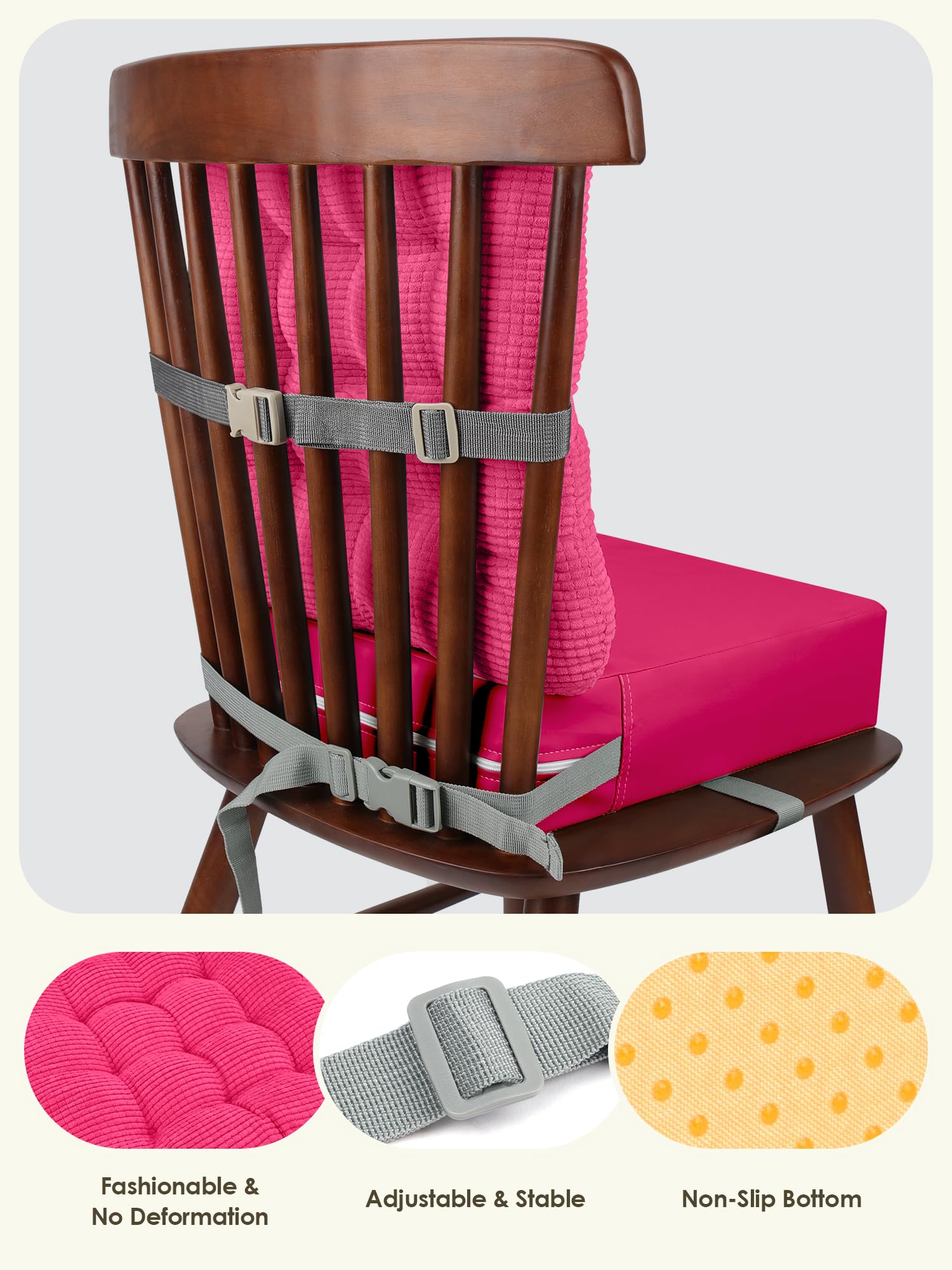 【UPGRADED BOOSTER SEAT CUSHION with A CORDUROY BACKREST SET】The 2-inch thickness backrest provides additional comfortable support for baby's back, making them more enjoyable.The backrest made of high quality soft corduroy fabric, easily help baby learn a good rest sitting posture.