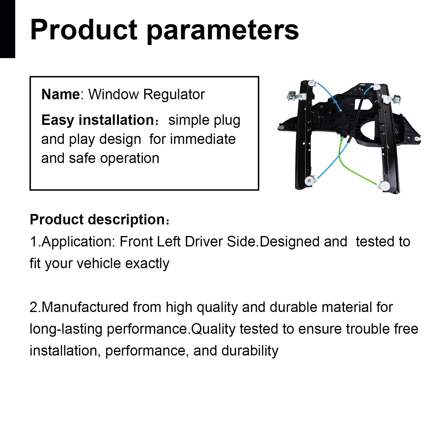 Package: Power Window Regulator Assembly without Motor Position: Front Left Driver Side Reference for part number: 7L1Z7823201B 9L1Z7823201A BL1Z7823201A BL1Z7823201AA 42-30031 81370 749-542 Fitment Compatible with Ford for Expedition 2007-2017 Compatible with Lincoln for Navigator 2007-2017 Function 1.With electric drive window lift, it is easier to operate while saving energy 2.Through the machinery can play a precise control of the window lift, avoid stuck or offset Maintenance Suggestions: 1.Clean the window guide regularly to avoid sand accumulation 2.Avoid raising and lowering multiple Windows at the same time to reduce motor load 3.When selecting the replacement regulator, please select the appropriate regulator