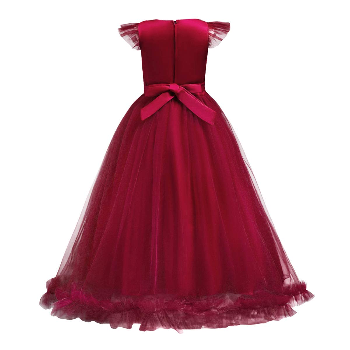 Mesh spliced bodies with soft lining, adds ruffled tulle details at sleeve, tops embellished with beautiful flower, faux rhinestone and embroidered patchwork at front,Designed with concealed zip-back fastening, the sashes are attached at the side seams and can be tied a bowknot at back.This dress contains 2 layers tulle, 2 layers soft lining, and 2 layer netting attached on the innermost fabric adds to a fuller look