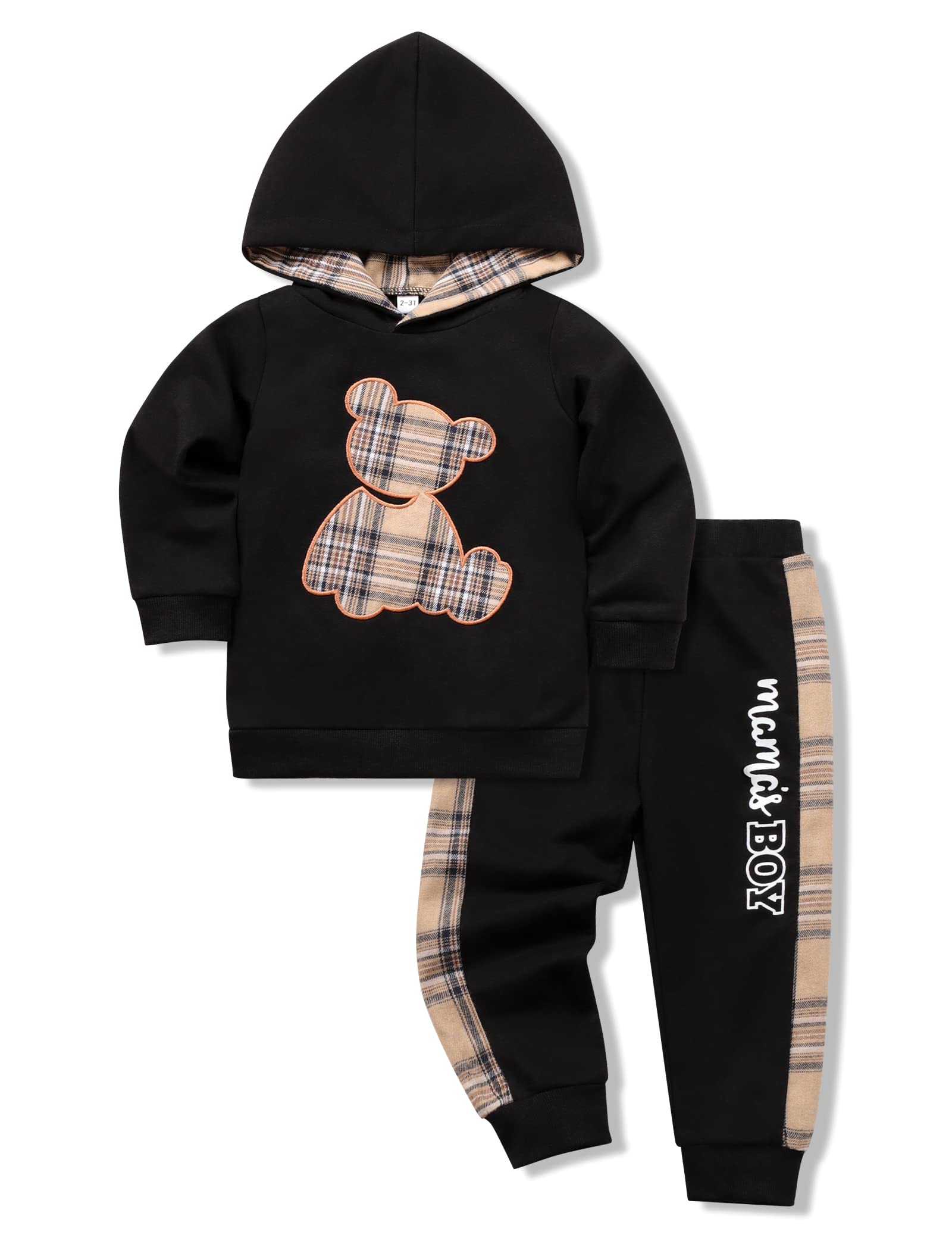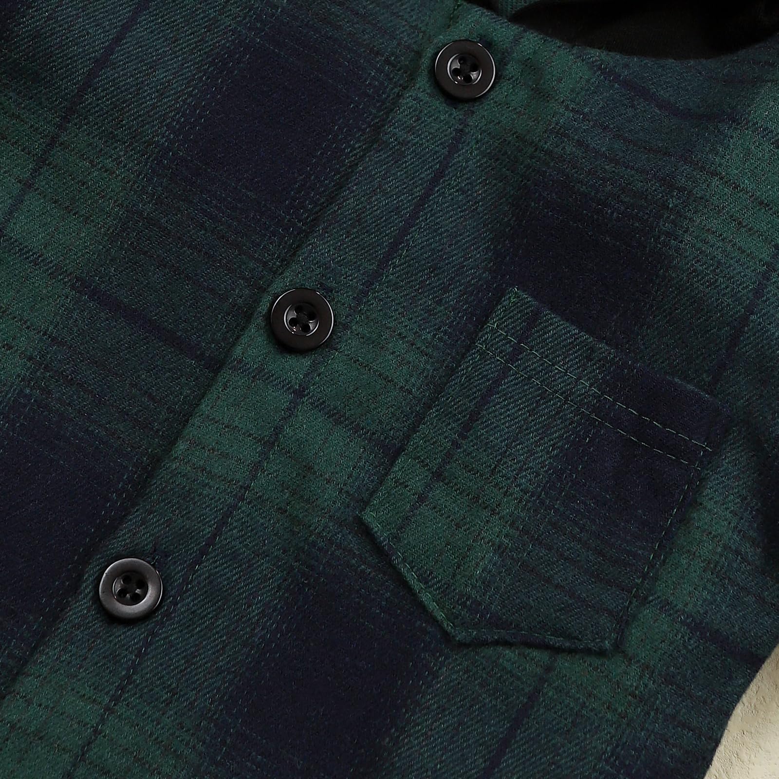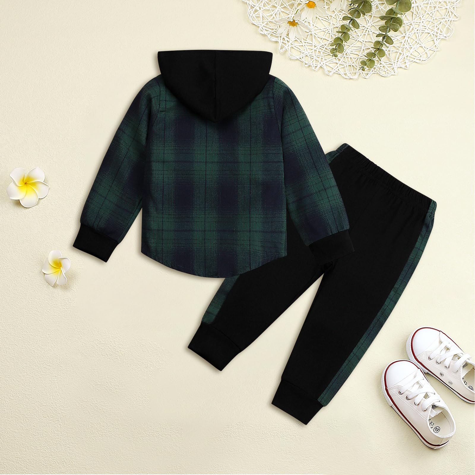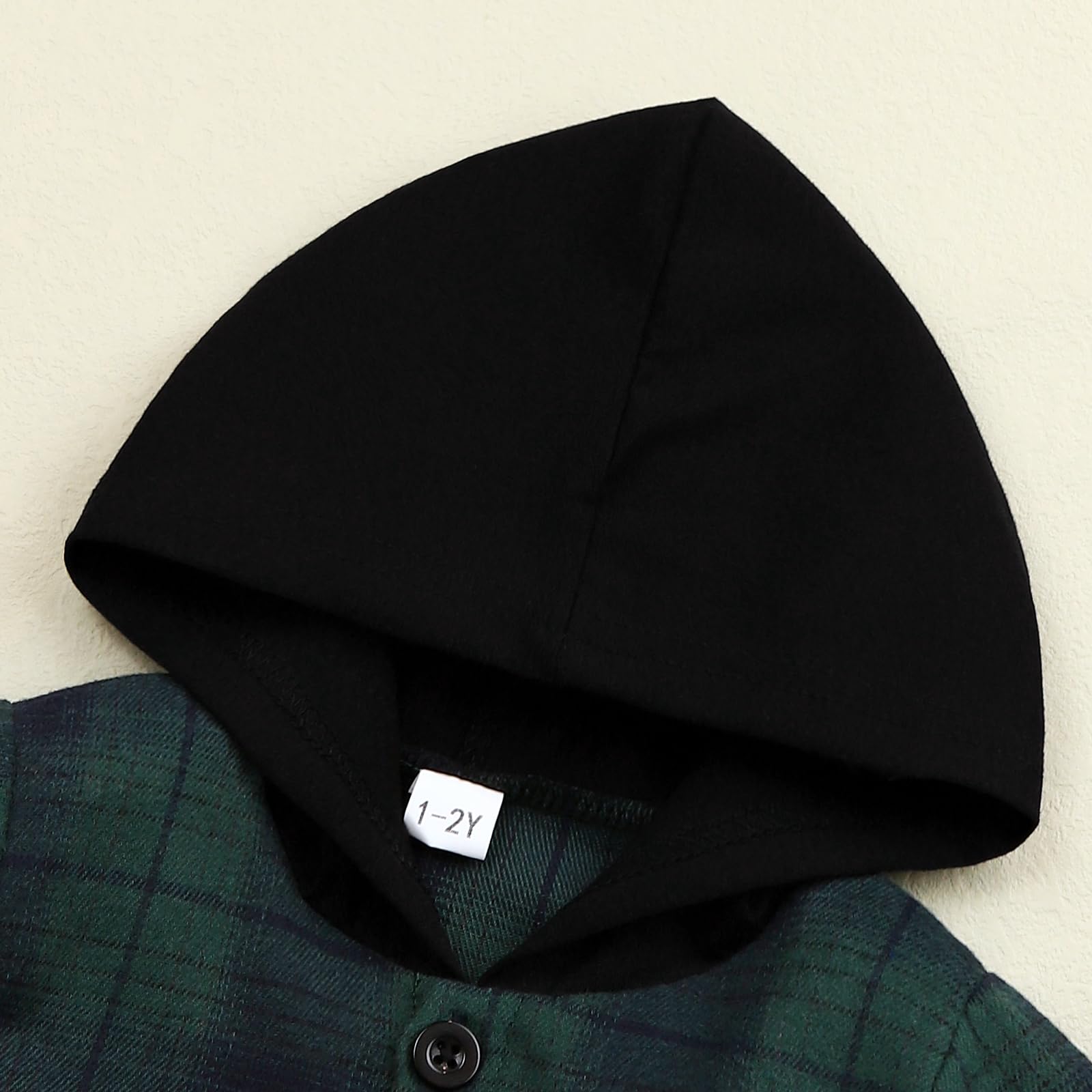 Stylish Boys' Autumn/winter Set: Long sleeve plaid print hooded top, Pocket, Button Front hooded top, matching plaid patchwork trousers with elasticated waistband.