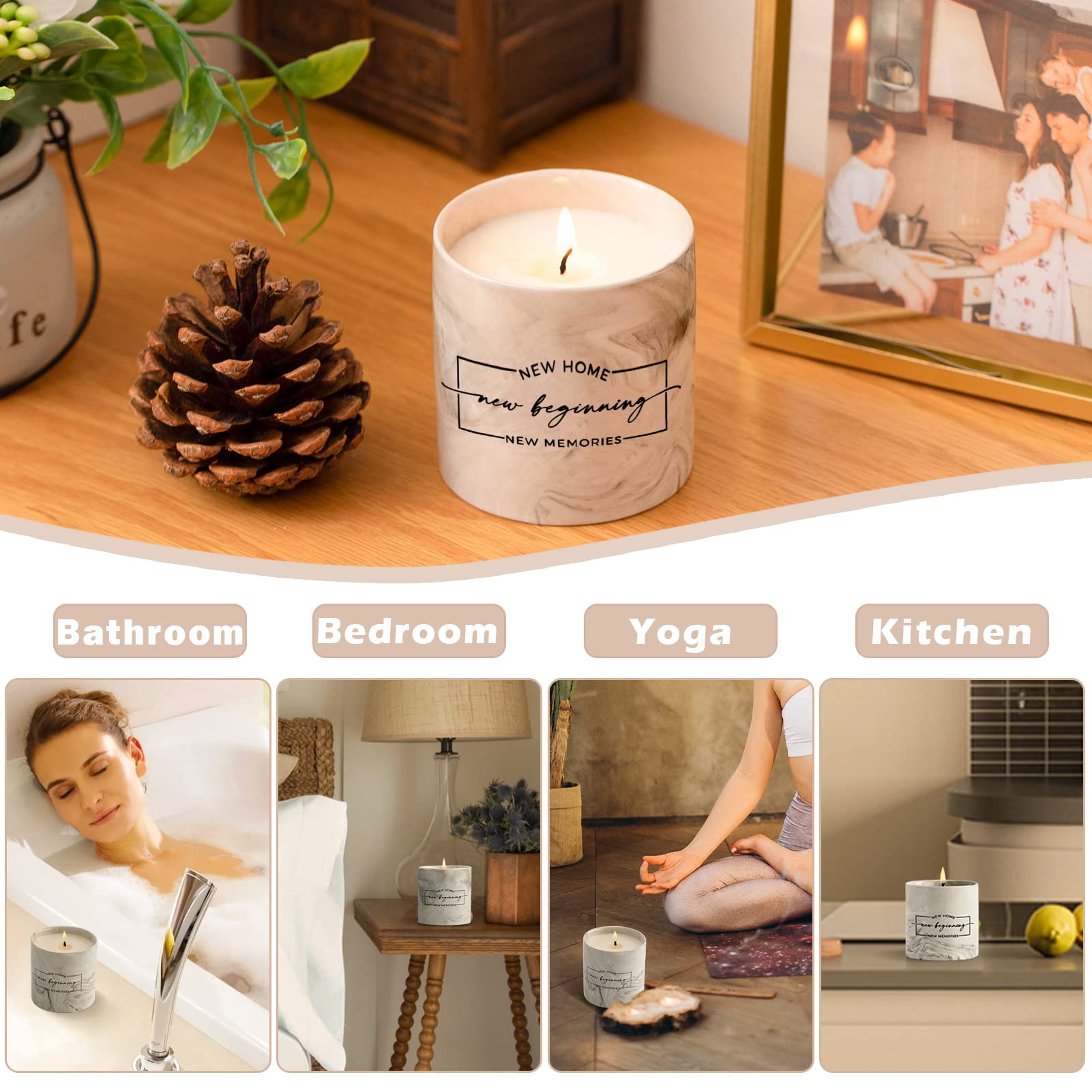 【Quality Porcelain】This 3*3 inches scented candle jar weighs 7 ounces, is made of excellent quality porcelain, fired at 1300℃ high temperature. The black pattern" New Home, New Beginning, New Memories" was printed on a smooth glaze surface.
