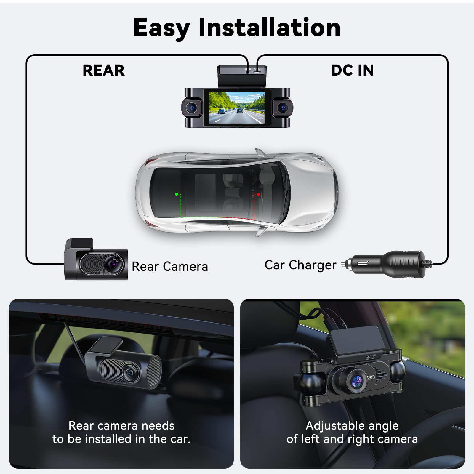 【 4K (3840*2160P) front camera&Rotate Inside and Rear Cameras 】This dashcam features a 4K front camera;The Inside and rear camera can be effortlessly adjusted , it captures the complete area of your trunk, back seat and side windows to help you monitor the kids or pets sit in back seat and the luggages in the trunk. it provides a perfect solution for monitoring the collision, the hit-and-run and the thief who breaks the car windows from sides.