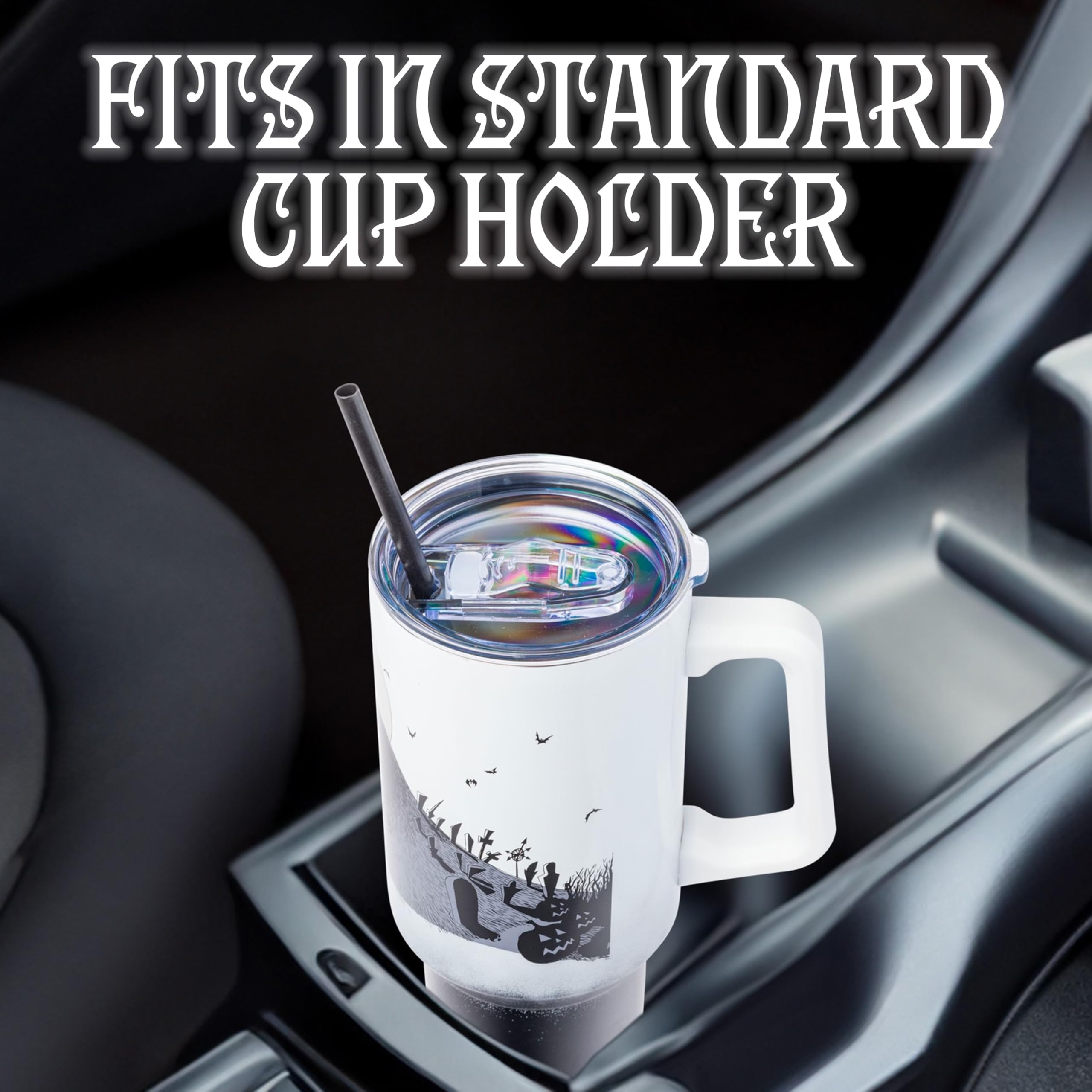NIGHTMARE BEFORE CHRISTMAS: Join Jack Skellington with this double-walled stainless steel travel tumbler that holds 40oz. Designed in a black and white background, it features Jack Skellington, the Pumpkin King, posing in front of the classic Nightmare Before Christmas background of the hill and moon. It includes a secure sliding lid and straw to stay hydrated on the go. It can even fit in your standard-size cup holder!
