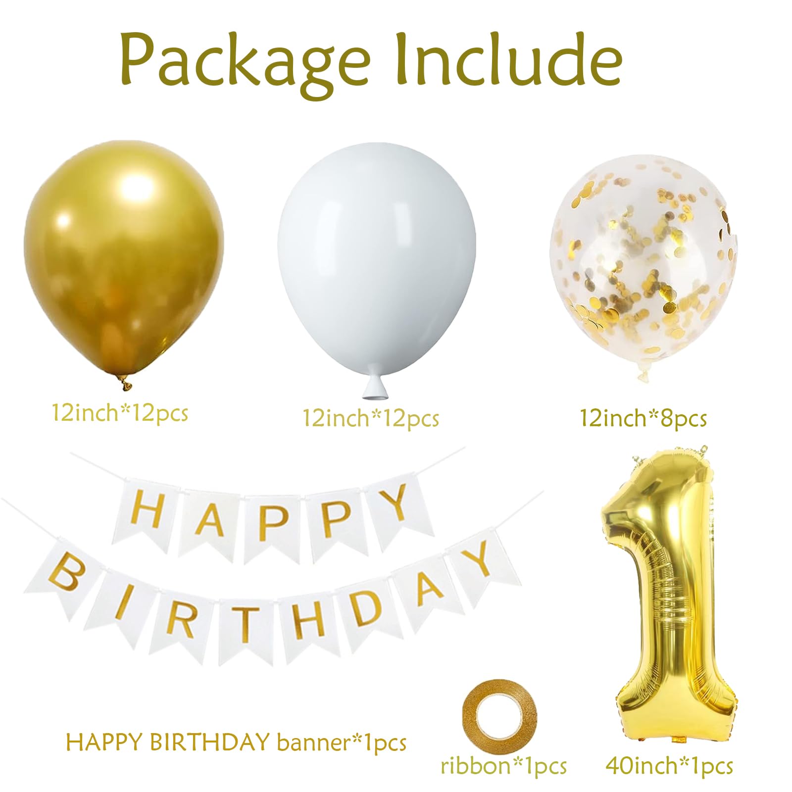 【VALUABLE PACK】32pcs One Balloon for First Birthday Kit include: 40inch gold 1 balloon, white gold HAPPY BIRTHDAY banner,12pcs 12inch gold balloons, 12pcs 12inch white balloons, 8pcs gold confetti balloons.