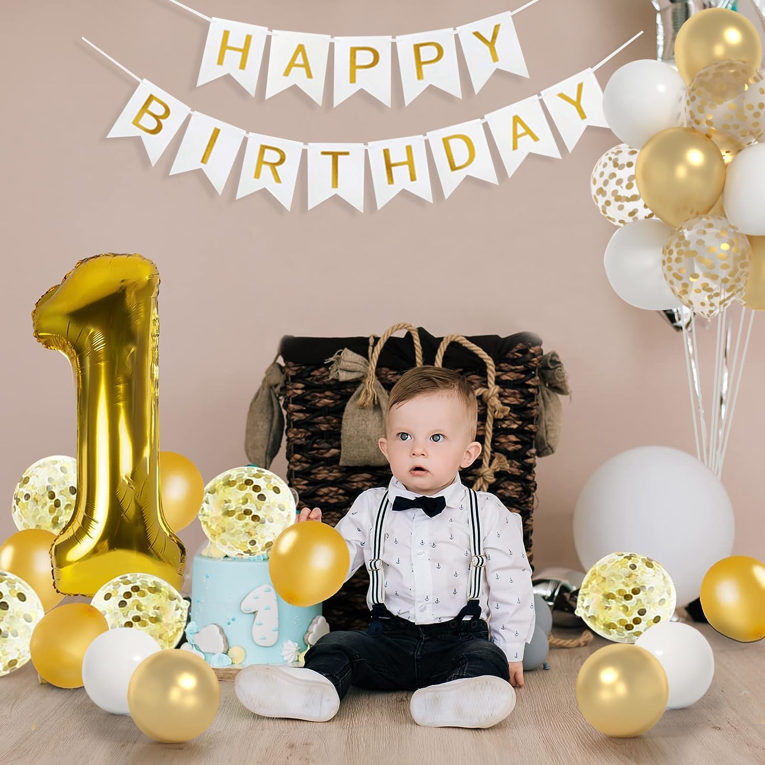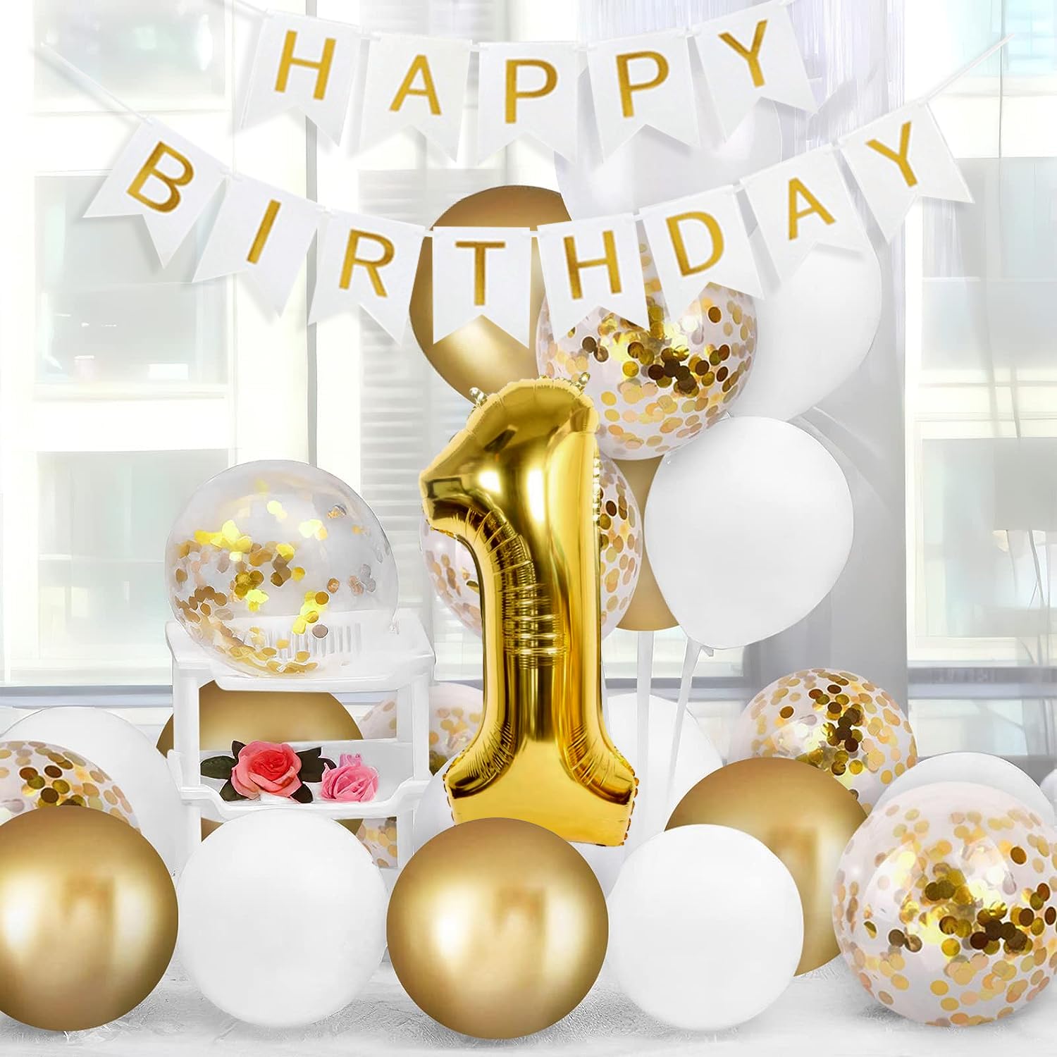 【EASY TO ASSEMBLE】The gold and white balloons and 1 balloon are extremely easy to inflate and string up. The number 1 balloos will seal automatically after being inflated, don't requires additional knot. Use an air pump to to help you fix the shape of the balloon, saving your time and make a fun!