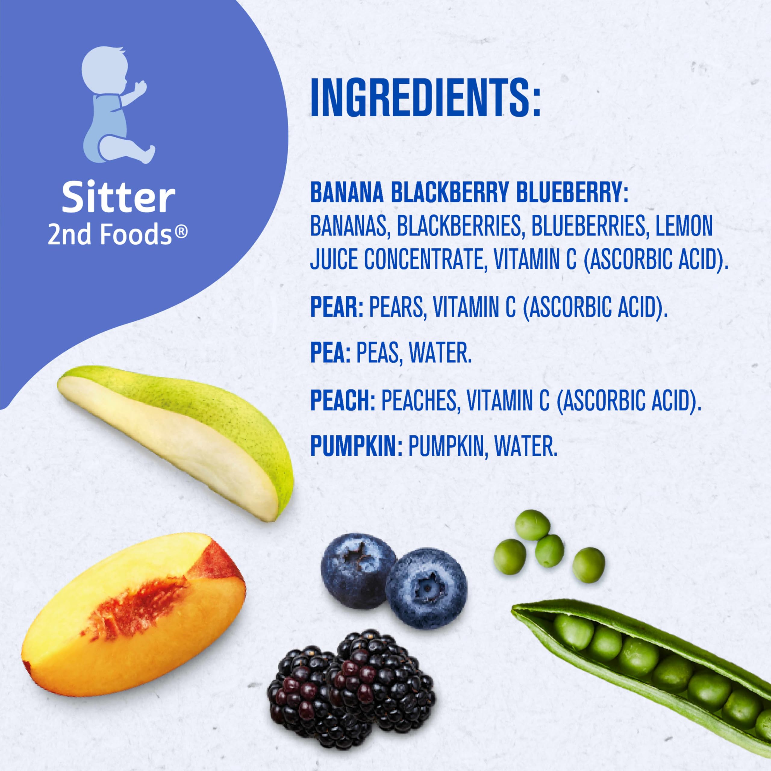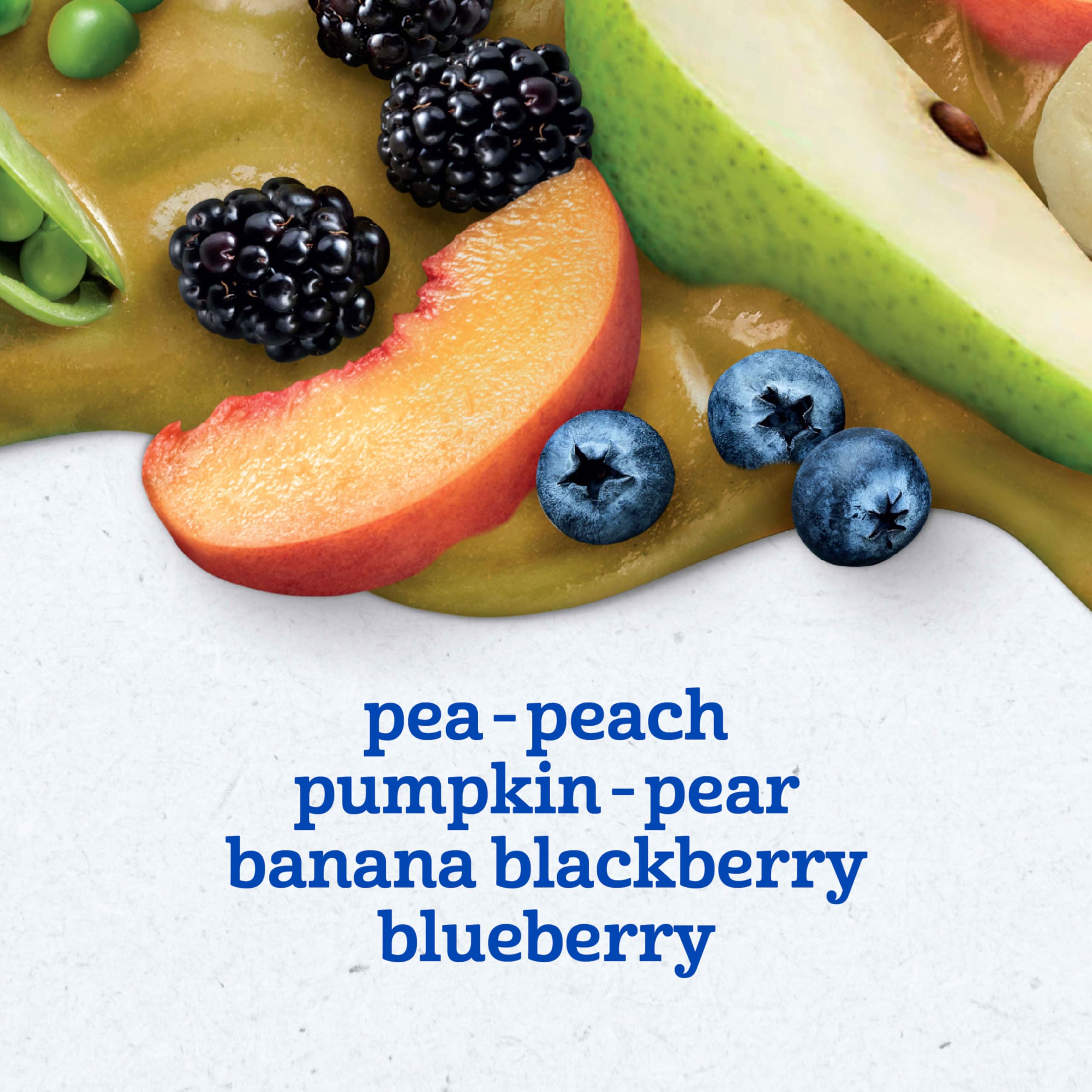 VARIETY PACK: This nutritious baby food variety pack comes with 5 fruit and veggie purees: banana blackberry blueberry, pear, pea, peach, pumpkin