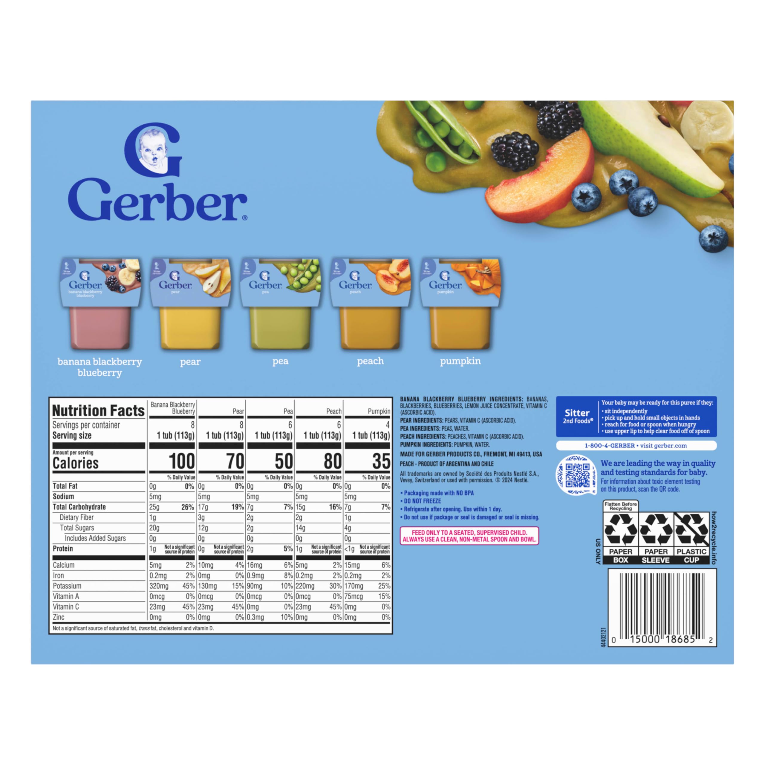 Gerber Stage 2 Baby Food Farmer's Market Favorites Variety Pack Tubs are a premium choice for your childβs early stages. Crafted to help support their nutritional needs, along with meeting the busy lifestyle needs of caretakers and parents. Each baby puree tub comes in a portable, easy-to-store format β making it perfect for lifeβs busy moments. This stage 2 baby food puree is designed for babies who are 6 months + and are ready to explore new textures and flavors. The fruits and veggies are finely pureed to ensure a smooth and enjoyable eating experience for your little one. Gerber understands the importance of providing wholesome ingredients during the crucial developmental stages of your child's life -- thatβs why our tubs are Non-GMO Project Verified. These baby purees have no added salt or sweeteners, and have no added colors or flavors. They need to be refrigerated after opening and must be used after 1 day. Gerber baby puree is ideal for parents who seek a convenient and high-quality option in their baby's diet. This baby food variety pack comes with 16 two packs.