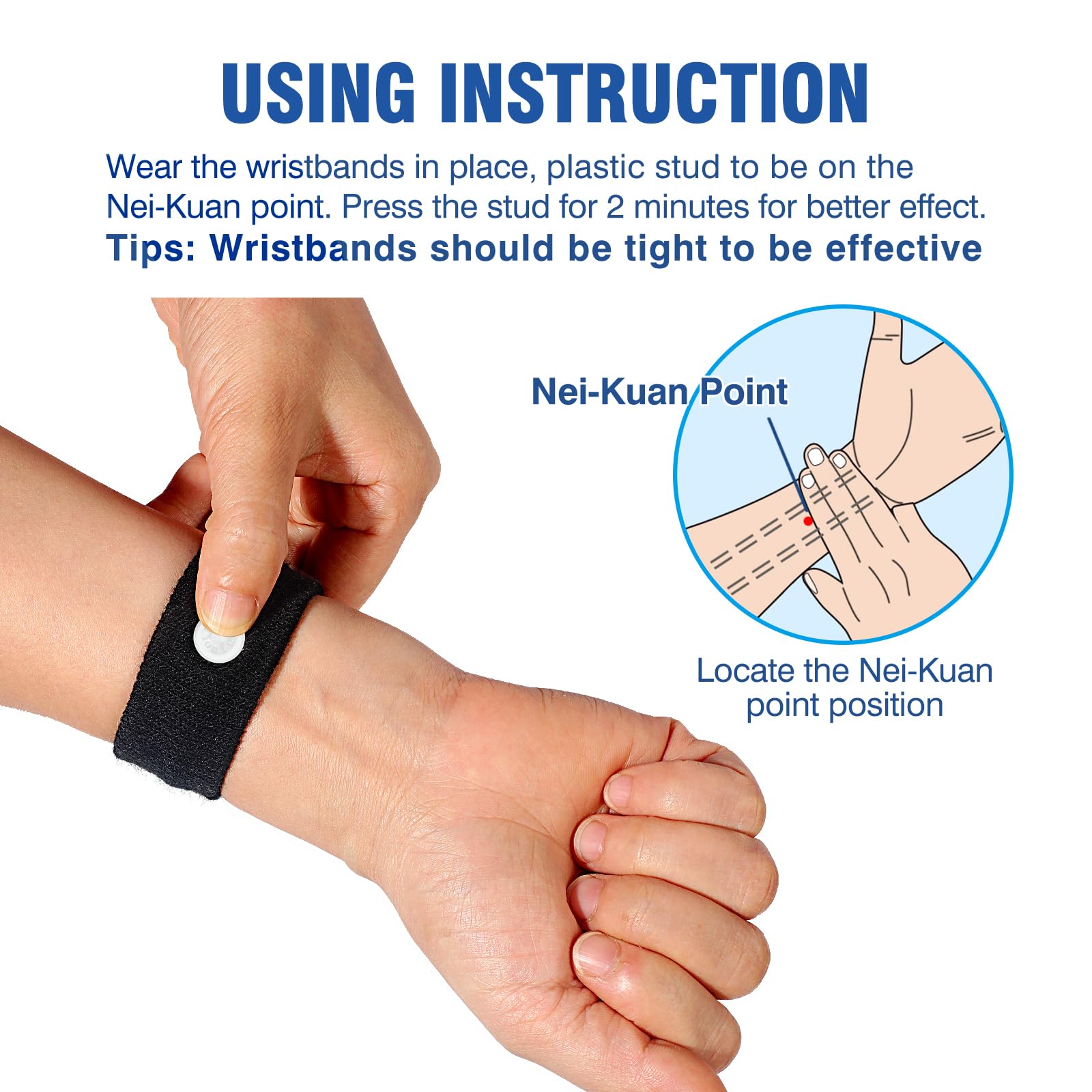 ACUPRESSURE TREATMENT: Acupressure wristband works by exerting pressure on the Nei-Kuan point (accupressure point 6) and stimulates it through the plastic stud on the wristband. The plastic stud need to be placed exactly on the Nei-Kuan point which is in between the two wrist tendons, three fingers from crease of wrist. After wearing, press the stud for 2 minutes for better effect. Always wear both wristbands, and wristbands should be tight to be effective.