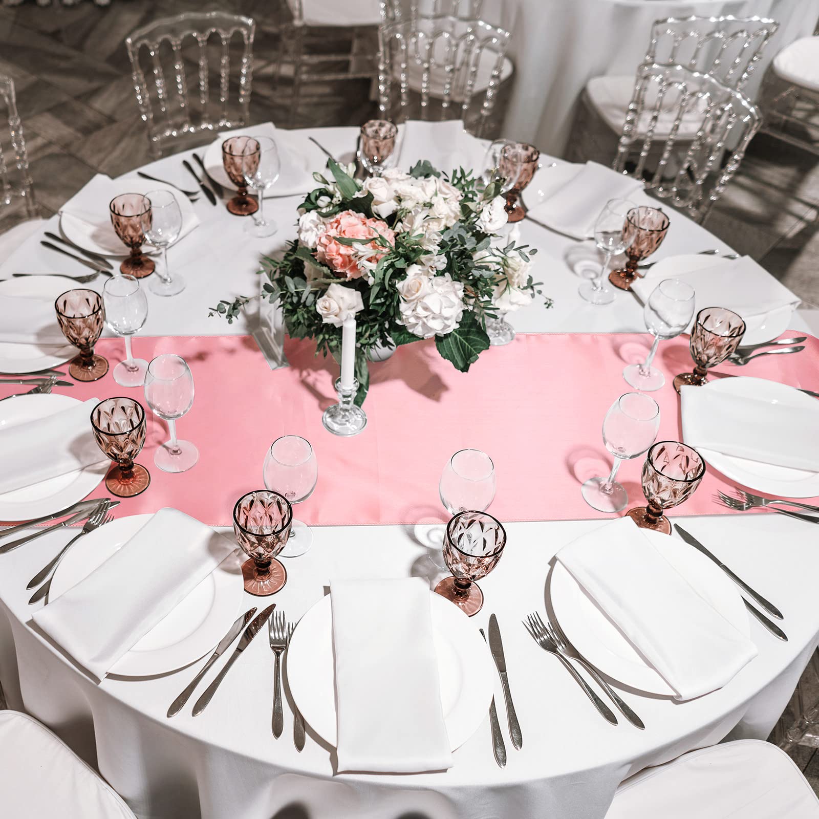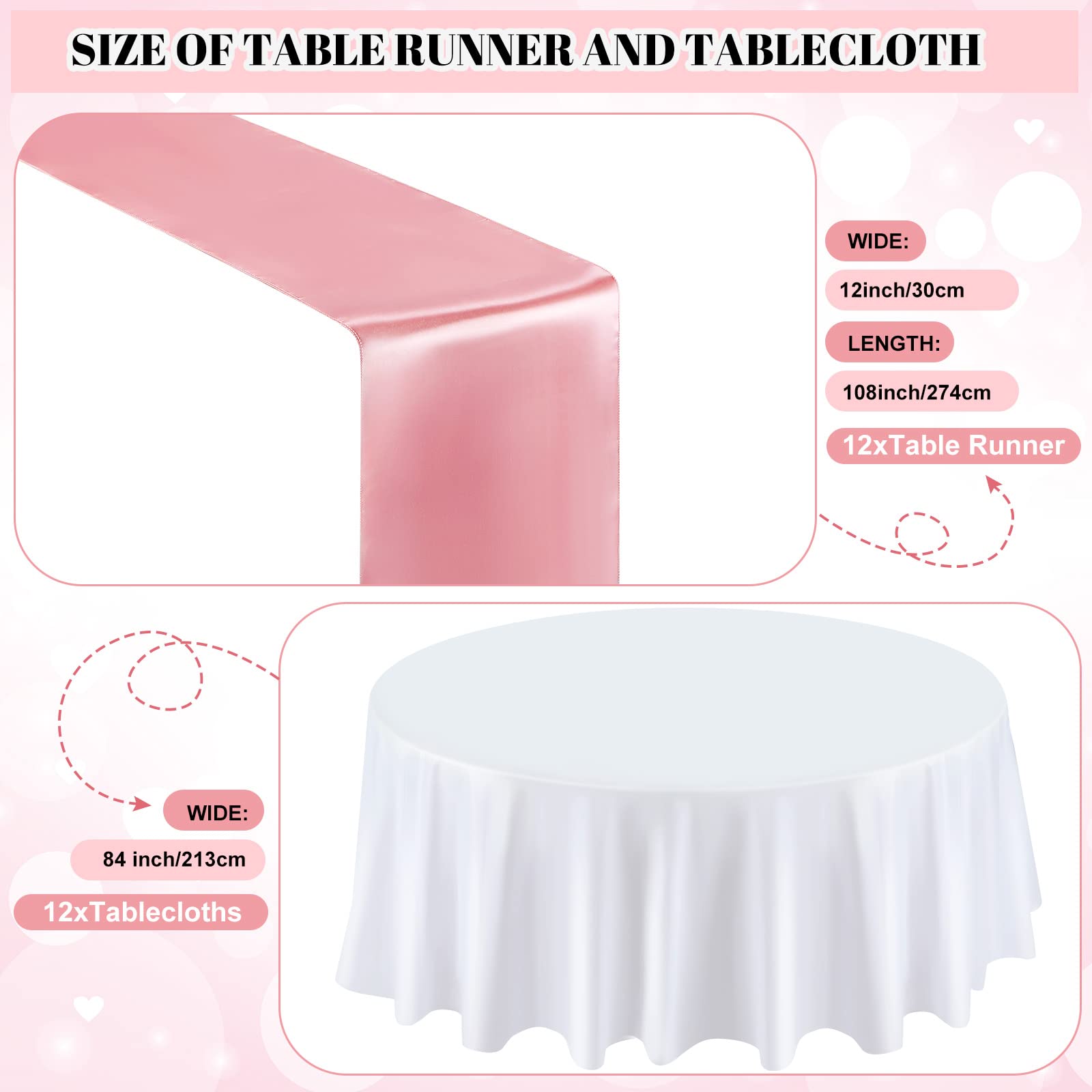 24 Piece Party Table Decor Set: Includes 12 white plastic round tablecloths and 12 satin rose gold table runners. Use together or separately to create an elegant atmosphere for weddings, dinners, or holiday gatherings with coordinated table styling