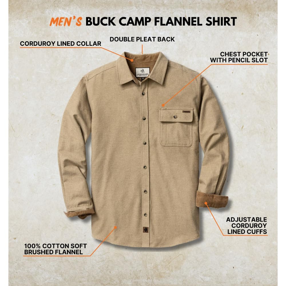 Description Our original single pocket flannel - The Buck Camp Flannel Shirt is the perfect weight to wear alone or layered over a t-shirt or under a shirt jacket. The traditional style and signature corduroy details offer unmatched durability, while the relaxed fit and brushed cotton flannel provide ultimate comfort. With multiple exclusive plaids and solids, they're suitable for any occasion from the woods to the office. The Buck Camp Flannel Shirt gives you an incredible "bang for your buck"! Big & Tall sizes are designed for men over 6'2" and add 2" in body length and 1-1⁄2" in sleeve length.