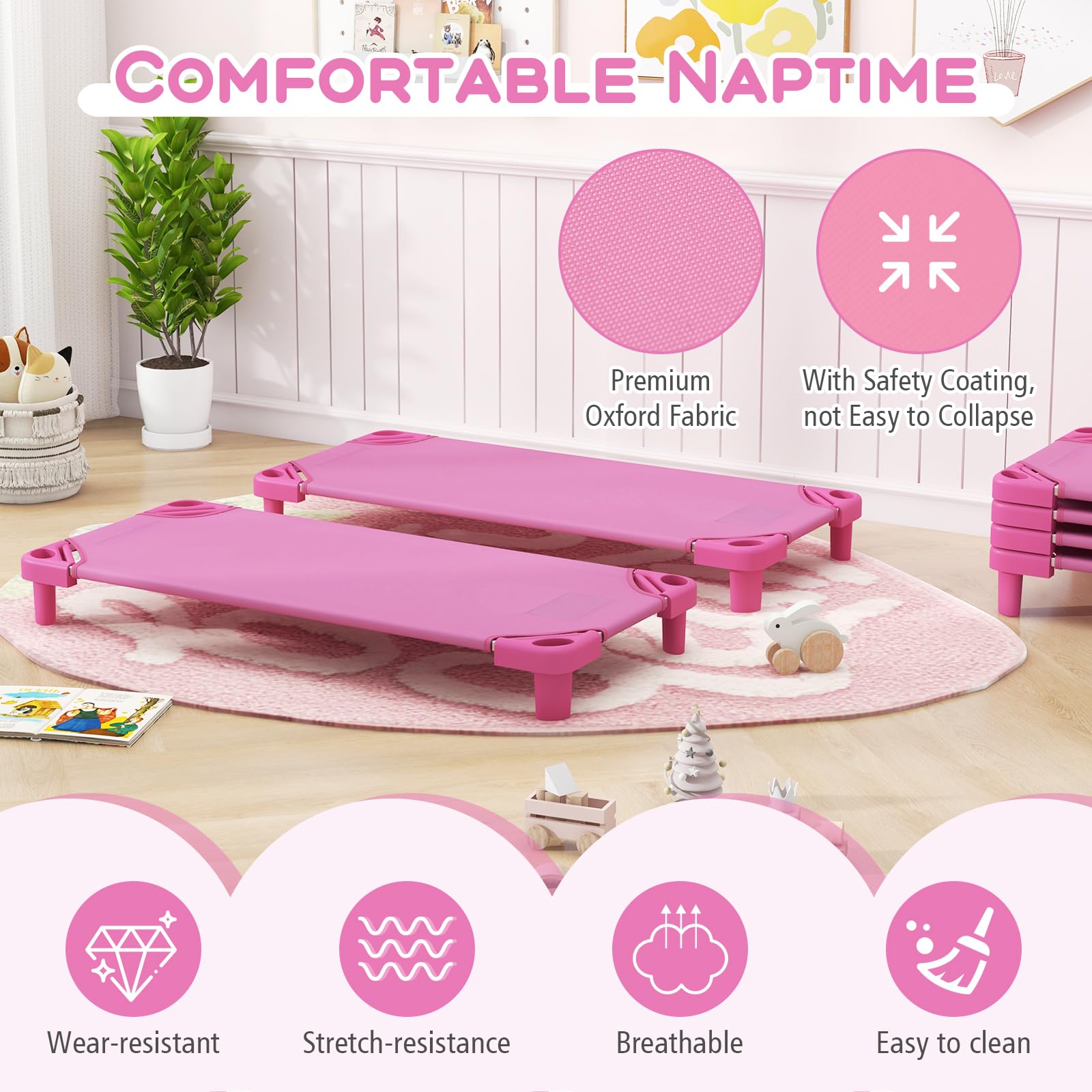 Easy Storage Design: This set of 4 toddler daycare cots can be easily stacked for convenient storage when not in use. The lightweight cots can be quickly disassembled and stored vertically to save space. The rounded corners make it easy to lift and separate them from each other.