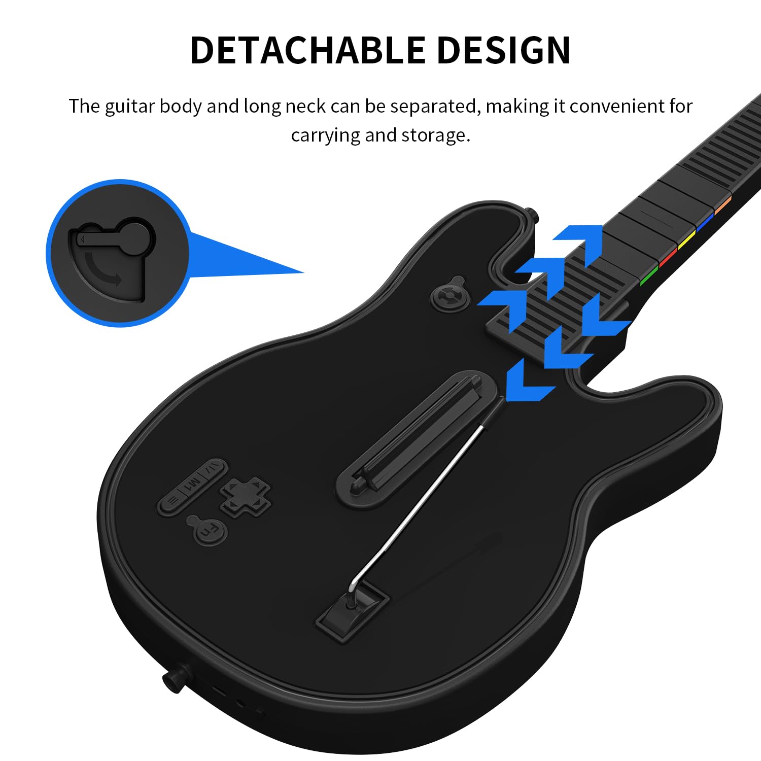 【EASY STORAGE】The wireless guitar pole and body are designed to be detachable and easy to store. When using the guitar hero controller, the holes at the ends of the strap connect the strap to the controller's strap button. You can adjust the strap length as needed. It can be carried on the body and is easy to carry. The strap is included in the box