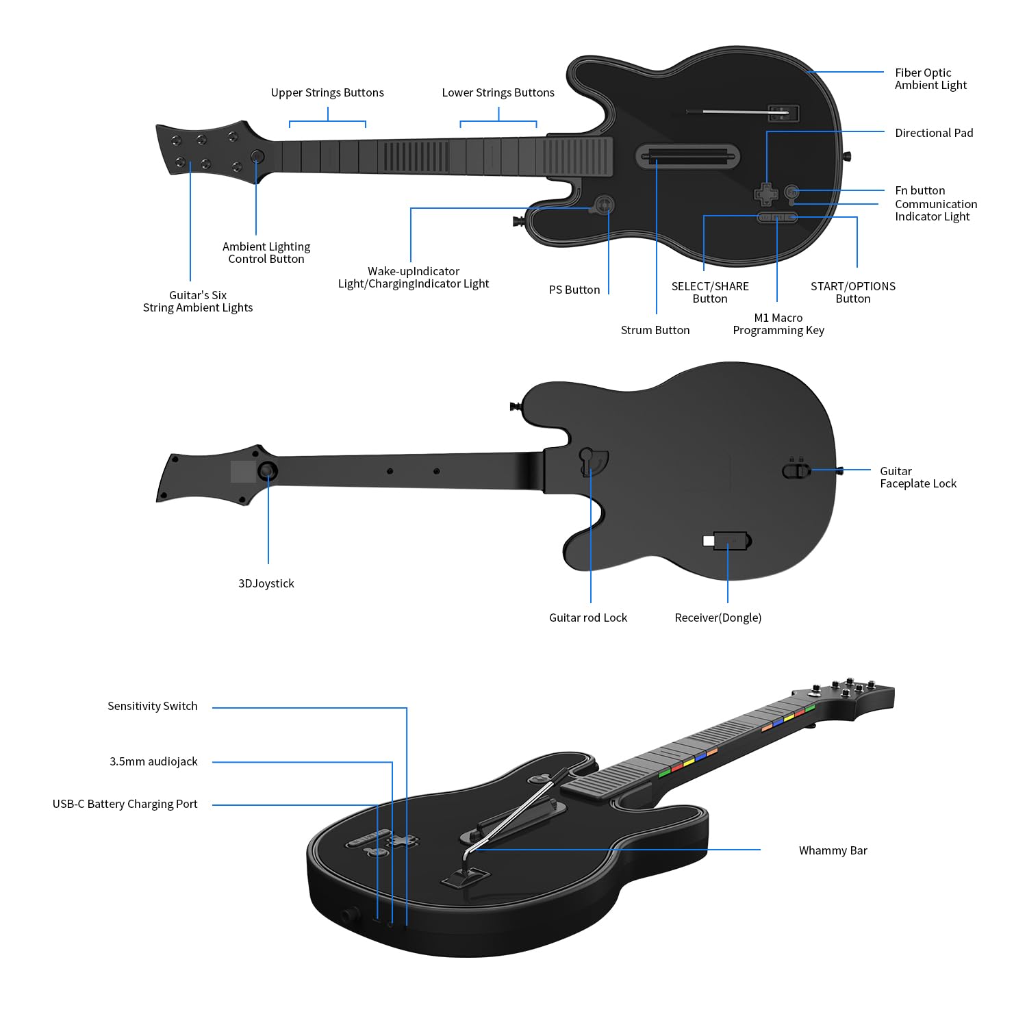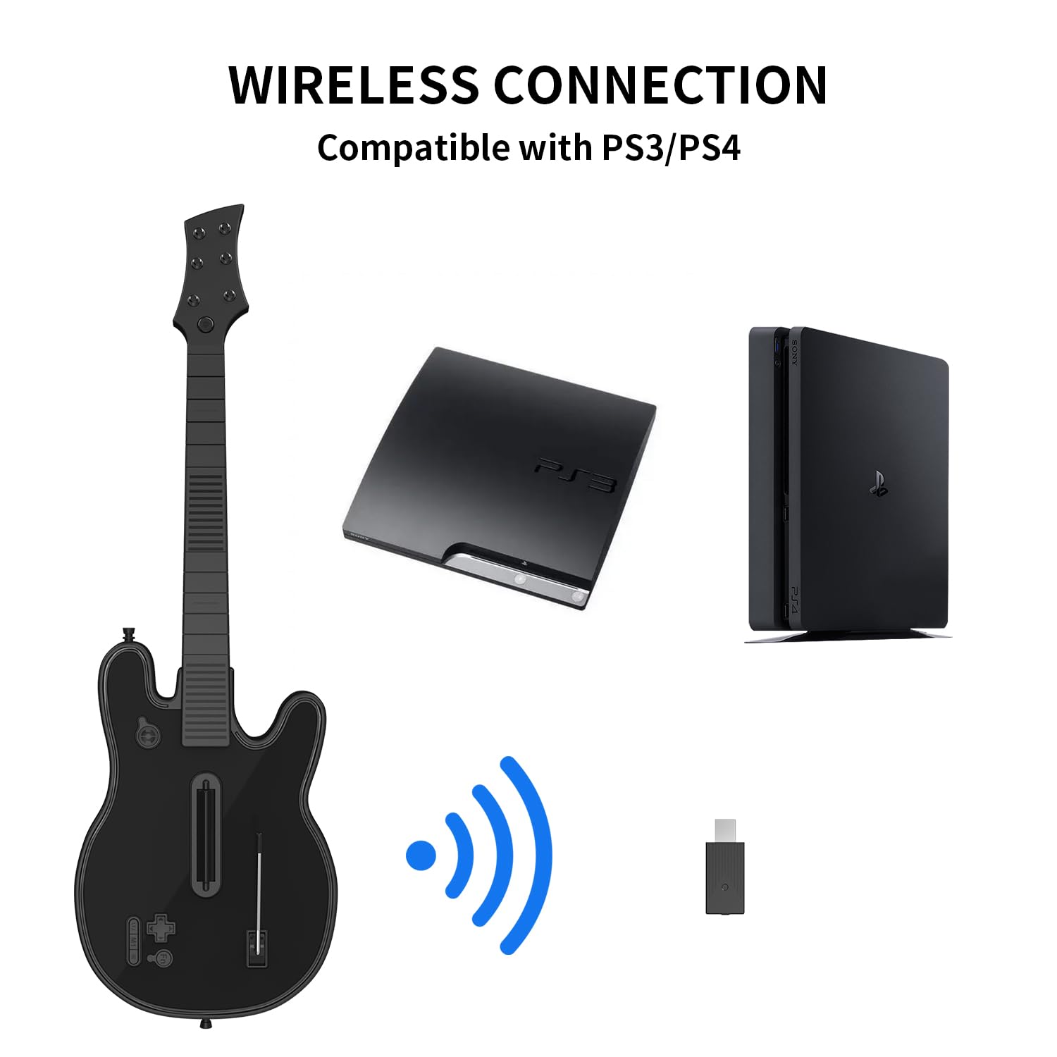 【Wireless Connectivity】You can play guitar games without interruption thanks to the 2.4G RF technology that offers stable wireless connections for up to 7 meters. Just plug the USB receiver into your PS4, PS3, or PC. Pairing is easy and usage is convenient