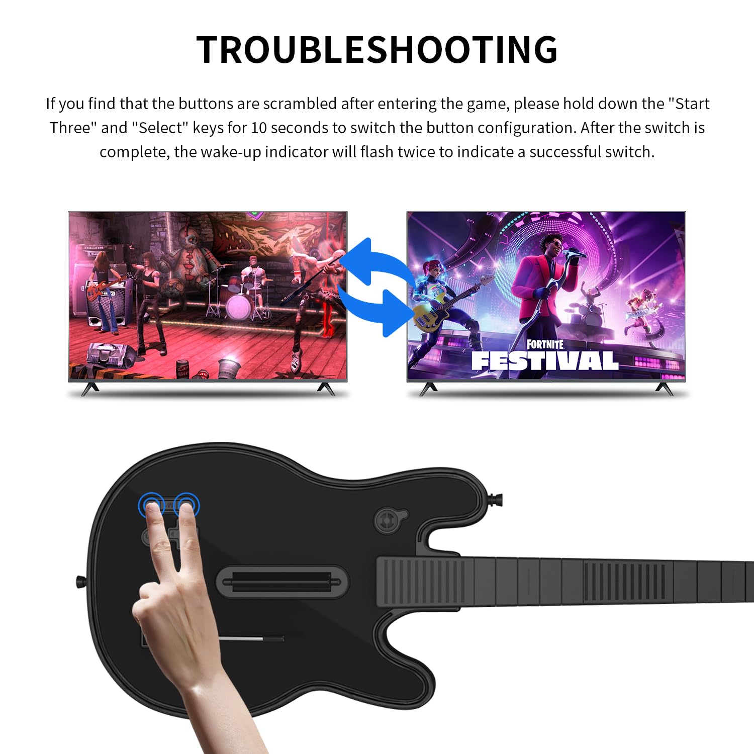 【Wide platform Compatibility】This wireless guitar hero controller is compatible with multiple platforms including PS4, PS3, PC and Windows. You can play Rock Band 4 and Fortnite Music Festival on PS4; Guitar Hero 3, Guitar Hero World Tour, Guitar Hero Legends of Rock, and Rock Band on PS3; and other series of games such as Guitar Hero and Clone Hero on Windows/PC