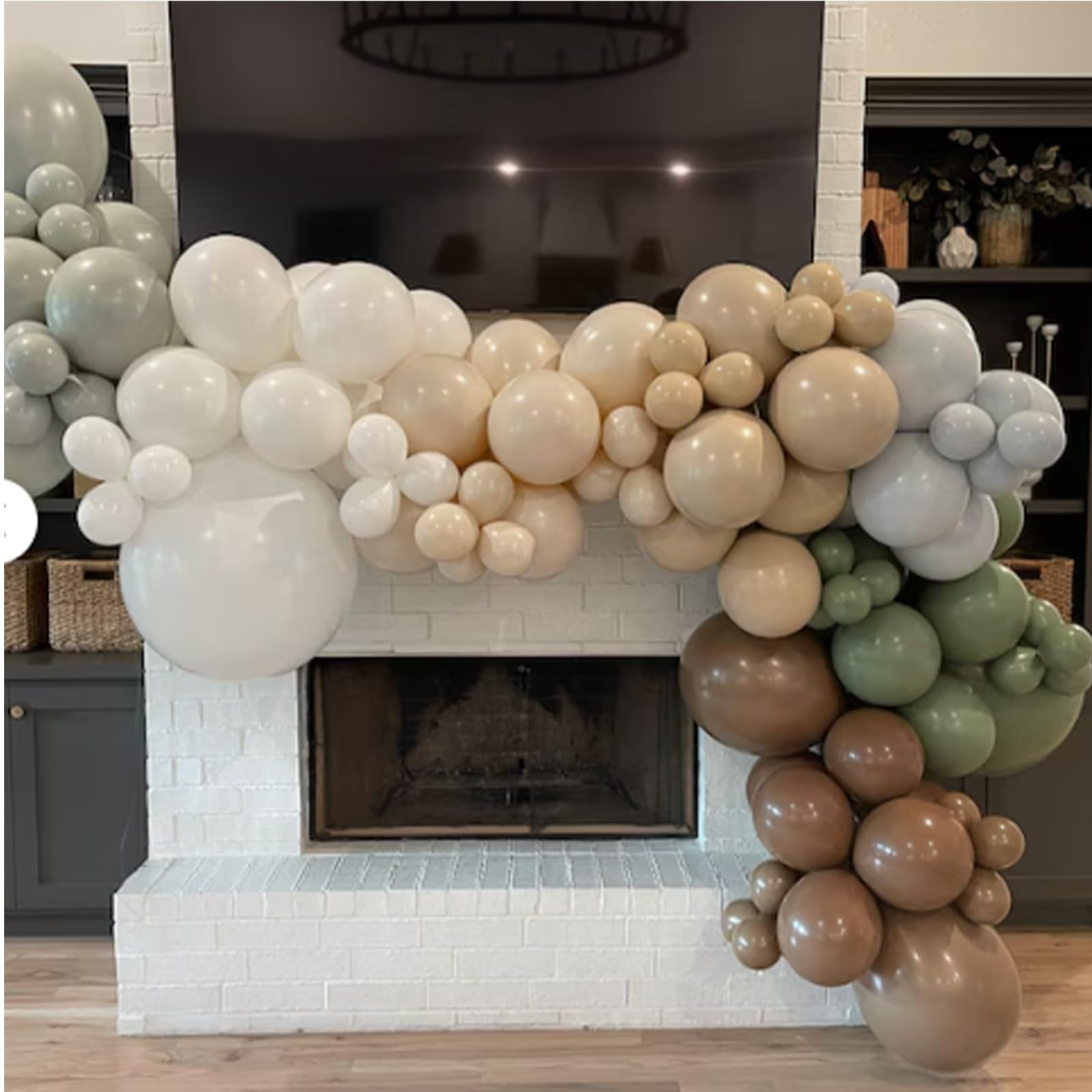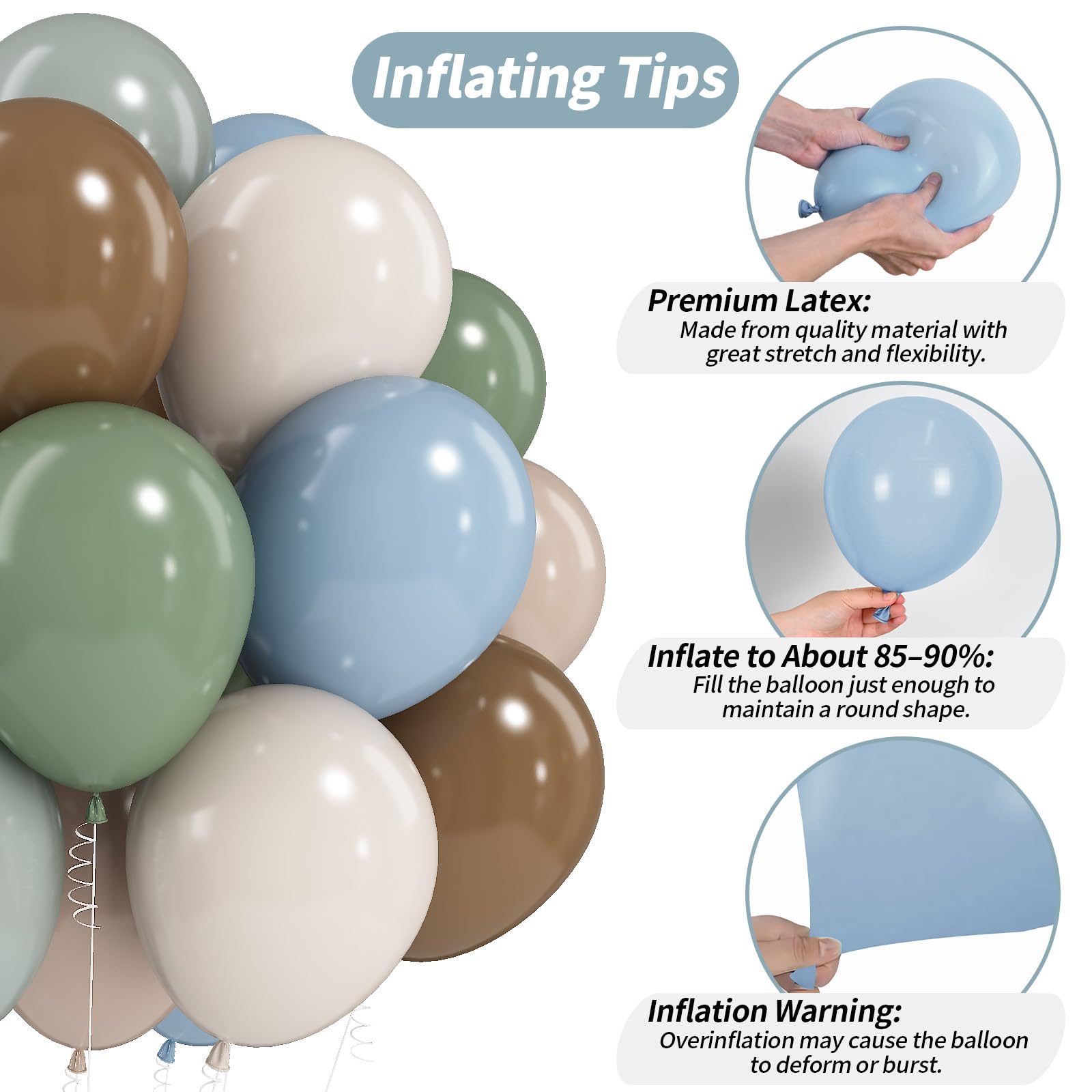 Dusty blue green brown balloons arch kit is for safari baby shower decorations, animal themed party, jungle birthday decorations, woodland baby shower decorations, camo and hunting theme decor, birthday balloons for boys, birthday balloons for men, wedding, baby shower, dino birthday decorations, dinosaur party decoration, bridal shower, and boho celebrations. Specifications: - Material: Natural Latex - Include- - dusty blue balloons (12 in × 10 pcs) - light green balloons (12 in × 10 pcs) - eucalyptus green balloons (12 in × 10 pcs) - brown balloons (12 in × 10 pcs) - apricot balloons (12 in × 10 pcs) - sand white balloons (12 in × 10 pcs) - balloon ribbon (1 roll) - The neutral latex balloons are safe, non-toxic, and thick enough to last longer after inflation. - These blue green brown balloons can be filled with air or helium, floating when filled with helium. Please Note! - Do not over inflate. Too much gas may cause balloons to burst. - Keep away from direct sunlight, high temperature, sharp objects and excessive friction. - Choking hazard: not suitable for children under 12 years, adult supervision required.