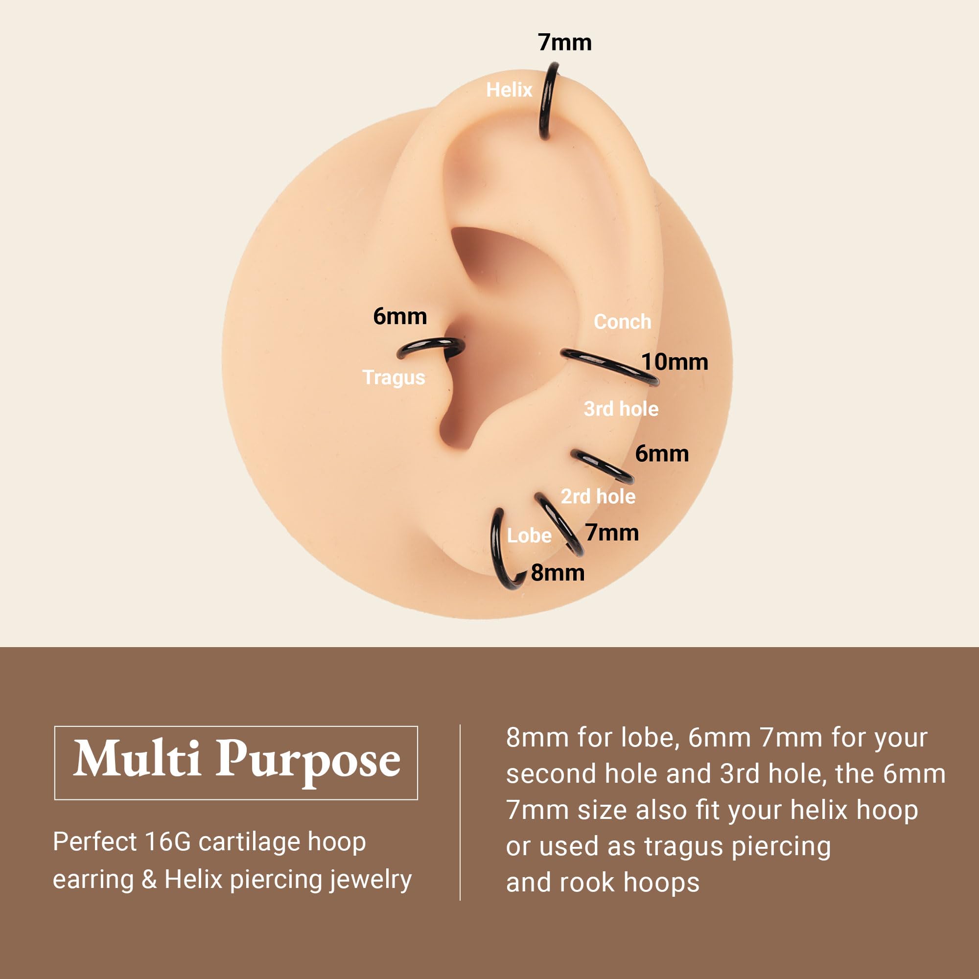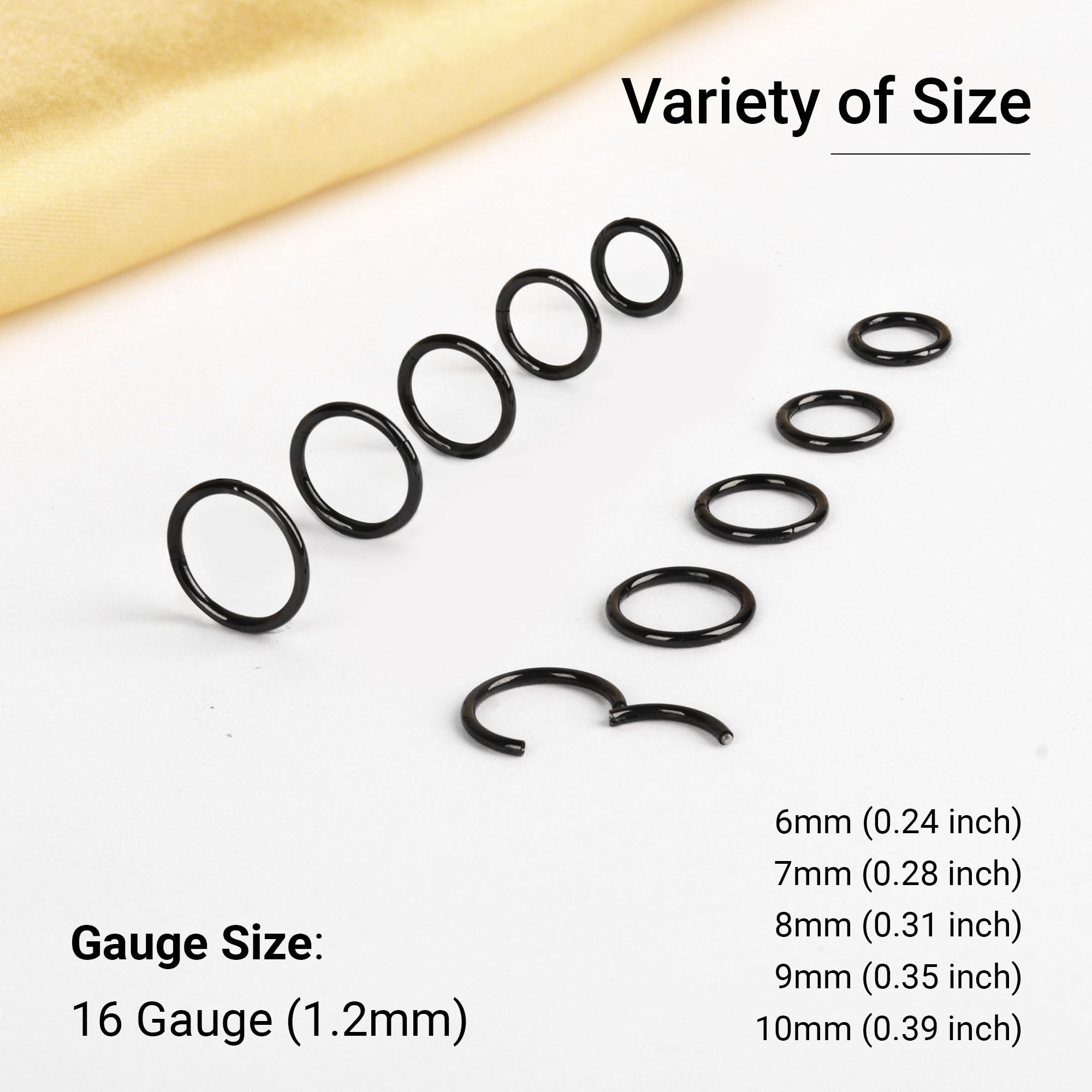 【GAUGE & SIZE】: The gauge size 16G(1.2mm), the inner diameter: 6mm hoops, 7mm hoops, 8mm hoops, 9mm hoops, 10mm hoops, suitable 16g small hoop earrings or 16 gauge nose rings.