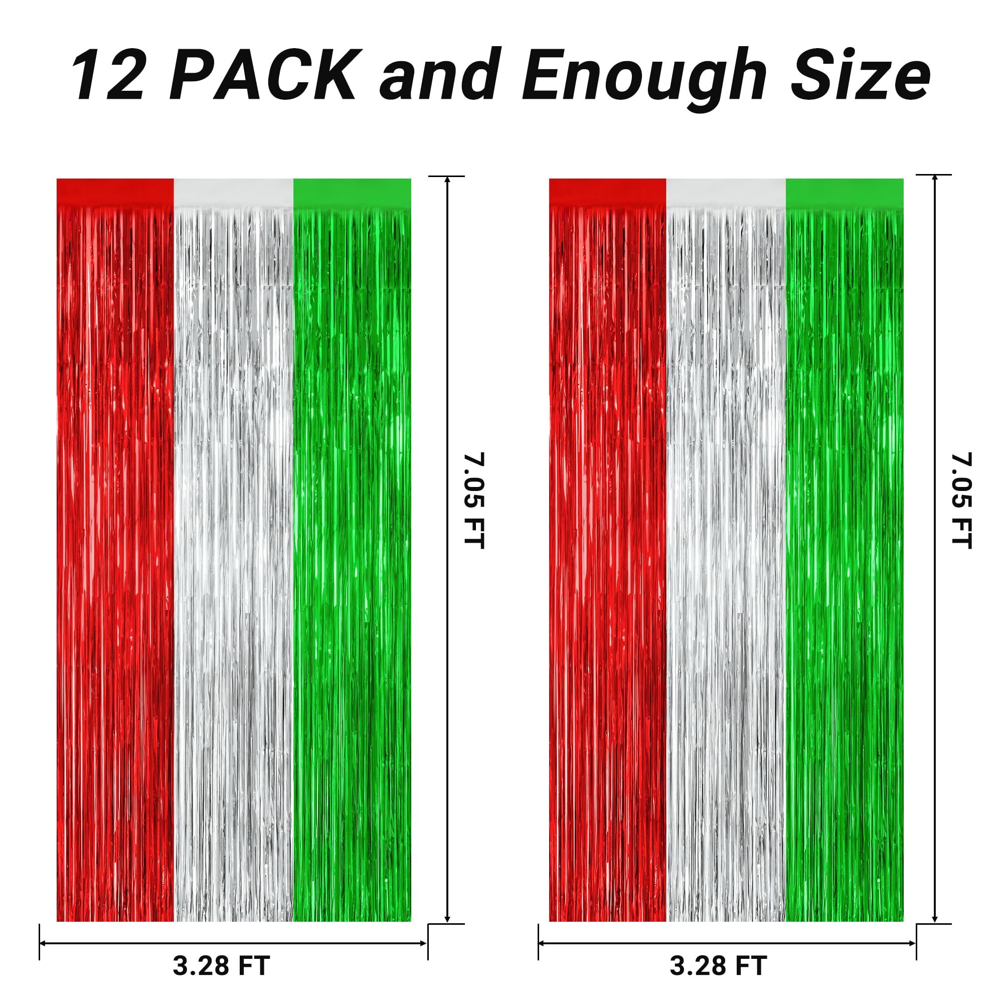 Package Includes: This product includes 12 pcs red silver green fringe curtains, each measuring 3.28 ft x 7.05 ft, the oversized size makes it easy to cut to the right length as needed.