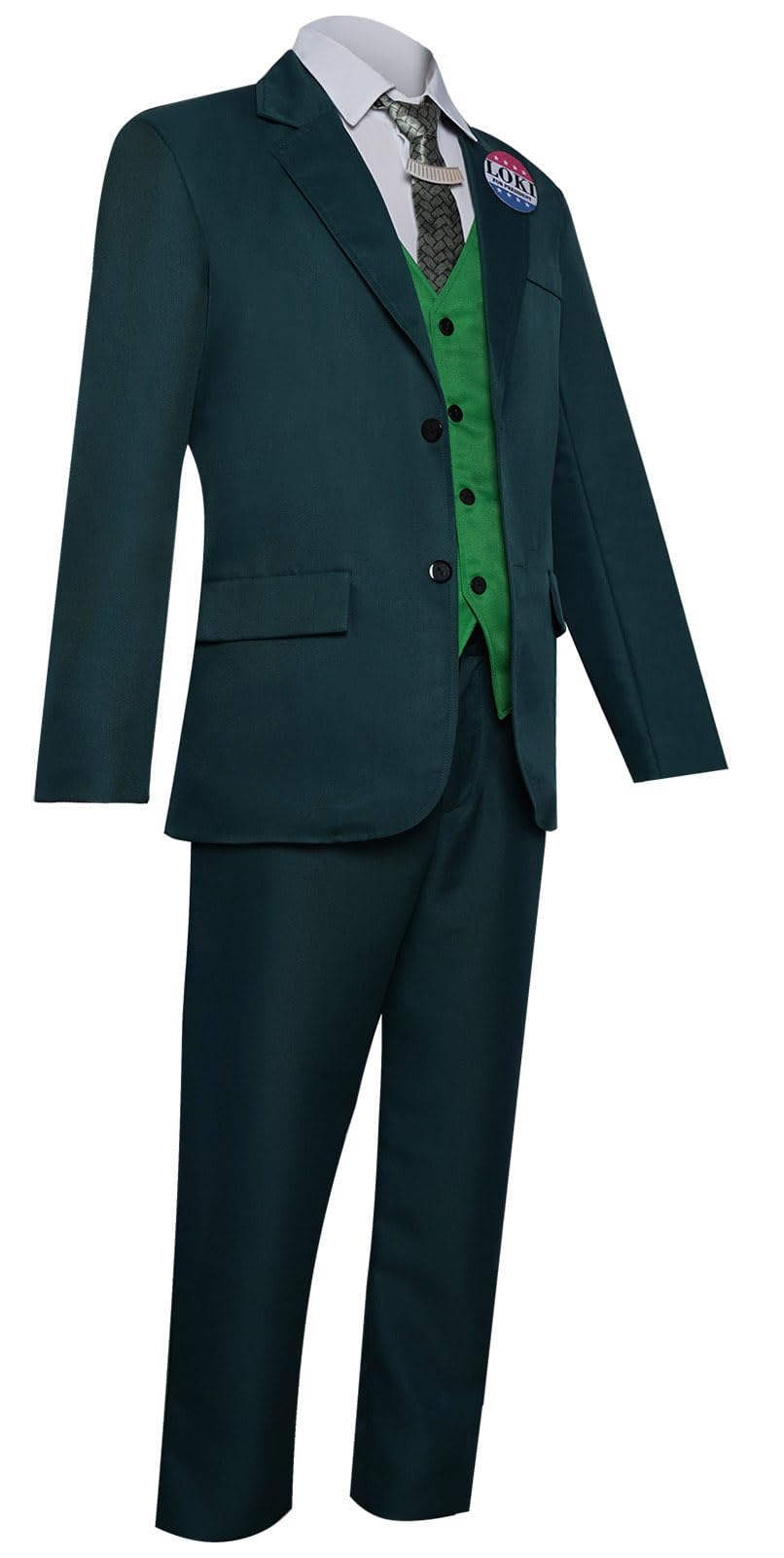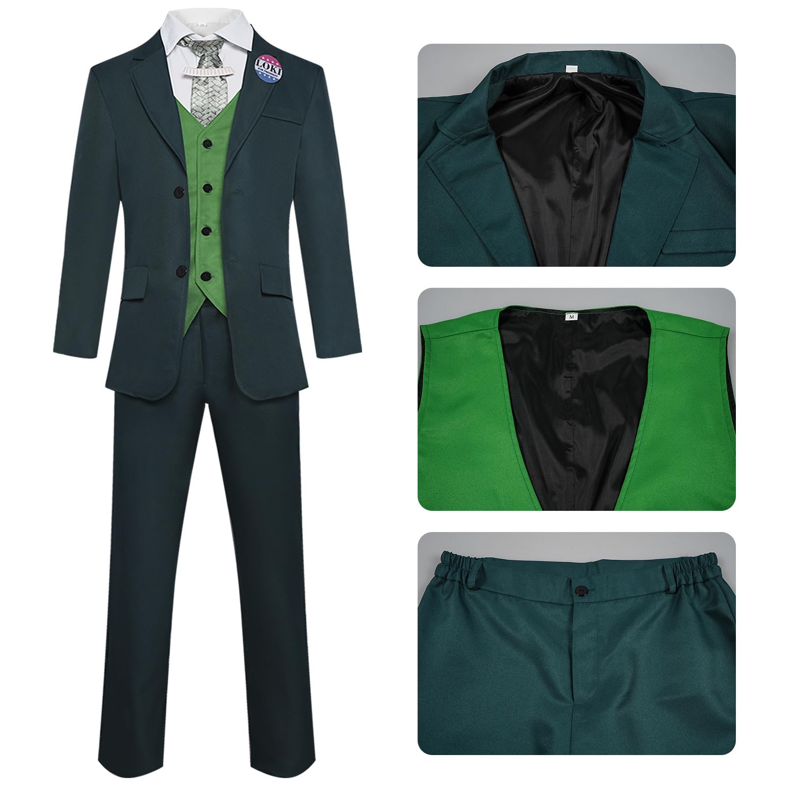 Description Loki Cosplay Shirt Jacket Vest Pants Suit with Wig Men Loki Costume Green Uniform for Halloween Party Mens Size Chart: X-Small: Height 165cm/65in, Chest 86-89cm/33-35in, Waist 71-74cm/28-29in, Hip 81-86cm/32-34in, Shoulder Width 44cm/17.3in Small: Height 170cm/67in, Chest 92-97cm/36-38in, Waist 76-79cm/30-31in, Hip 90-95cm/35-37in, Shoulder Width 46cm/18.1in Medium: Height 175cm/69in, Chest 99-104cm/39-41in, Waist 81-86cm/32-34in, Hip 97-102cm/38-40in, Shoulder Width 48cm/18.9in Large: Height 180cm/71in, Chest 107-112cm/42-44in, Waist 89-94cm/35-37in, Hip 105-110cm/41-43in, Shoulder Width 50cm/19.7in X-Large: Height 185cm/73in, Chest 114-119cm/45-47in, Waist 97-99cm/38-39in, Hip 112-117cm/44-46in, Shoulder Width 52cm/20.5in XX-Large: Height 190cm/75in, Chest 122-127cm/48-50in, Waist 104-109cm/41-43in, Hip 119-125cm/47-49in, Shoulder Width 54cm/21.3in XXX-Large: Height 195cm/77in, Chest 127-135cm/50-53in, Waist 112-117cm/44-46in, Hip 125-132cm/49-52in, Shoulder Width 56cm/22in