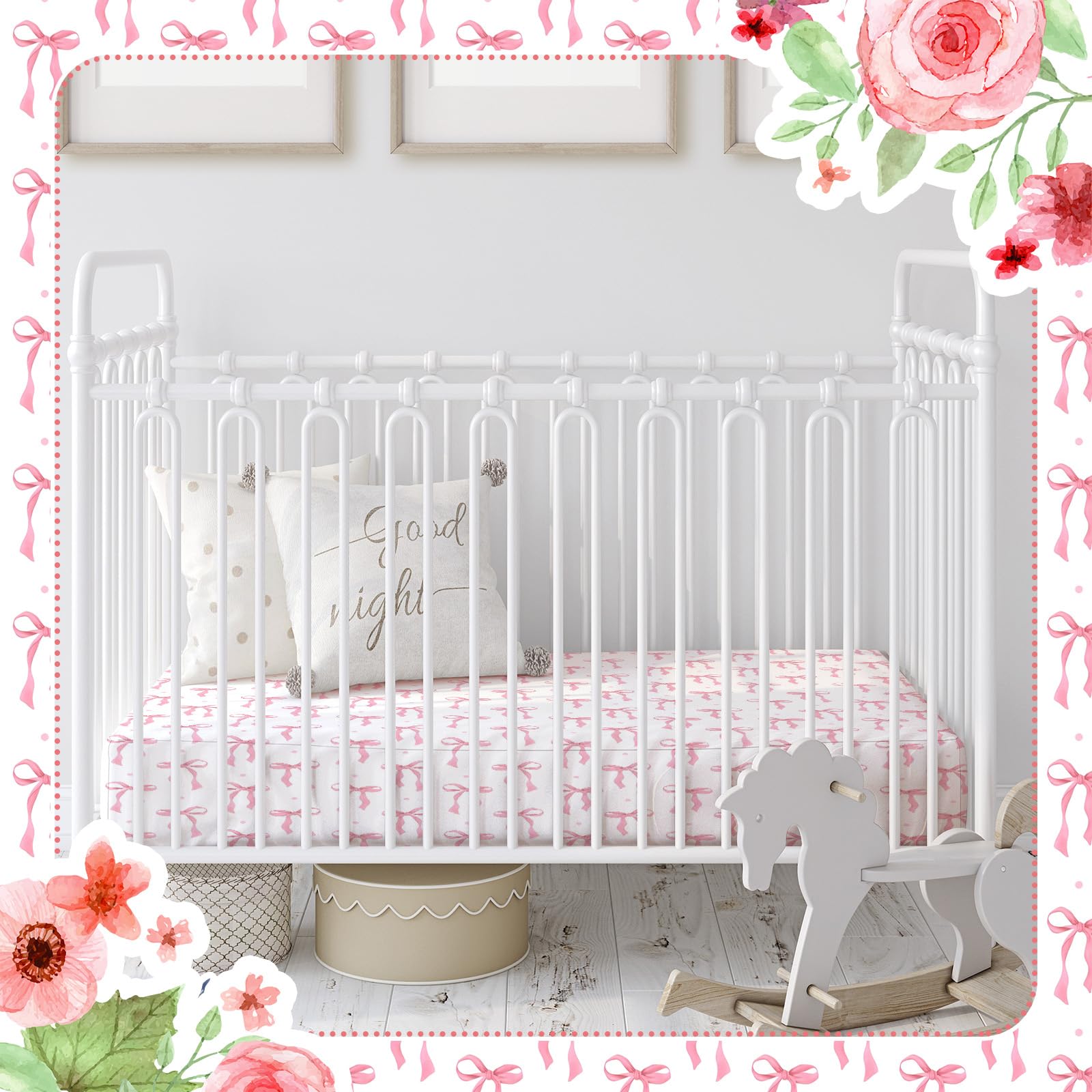 Pink Bow Bed Sheet Set: includes 2 pcs baby bed sheets compatible with a 52" x 28" standard baby mattress; 4 sided elastic edging design, paired with an 8 inch deep pocket, provides a secure fit that is not easily displaced; 2 pcs bed sheet configuration, easy to change and wash, keep clean and ready for use at any time; Practical and thoughtful, creating a comfortable and reassuring sleeping space for babies