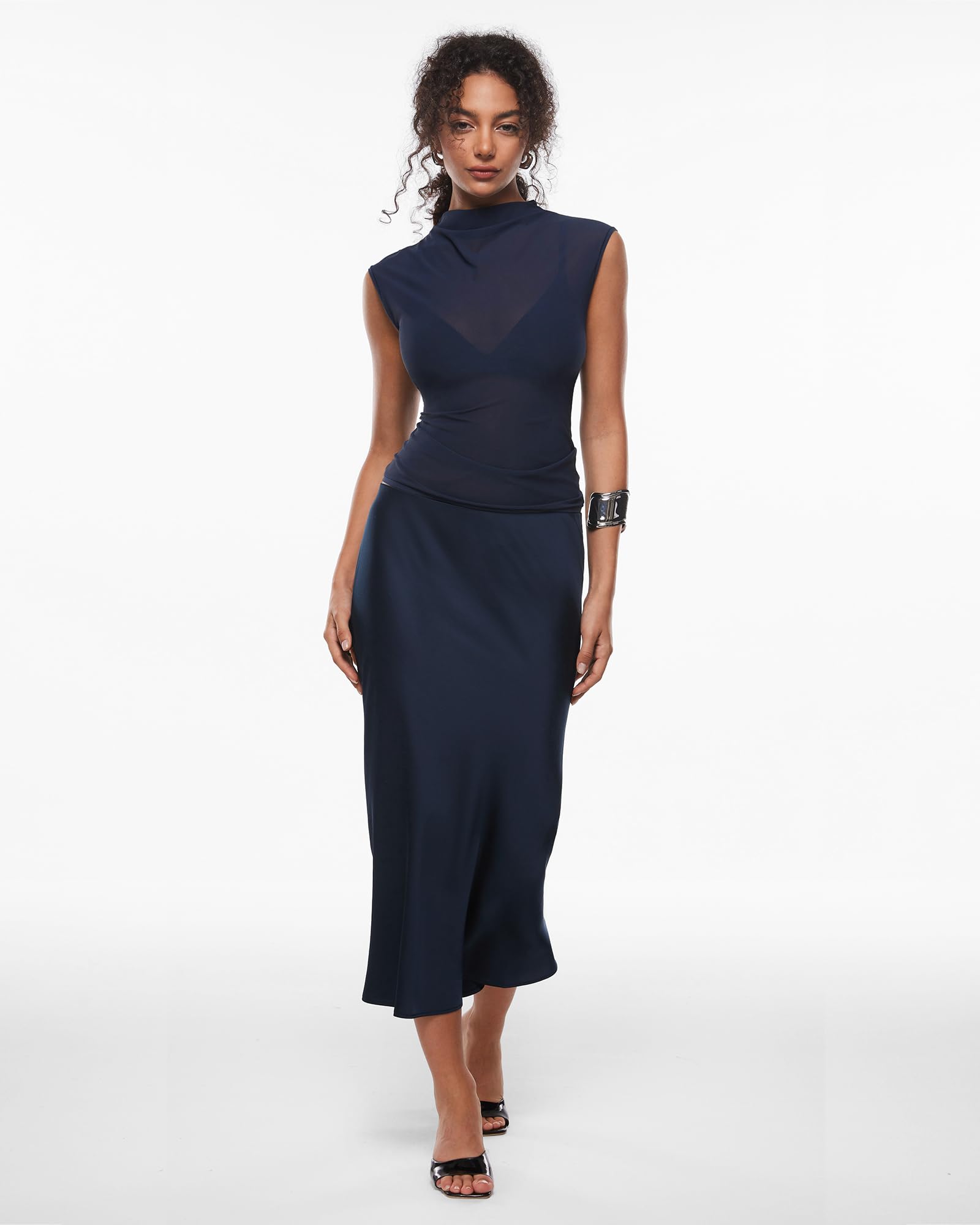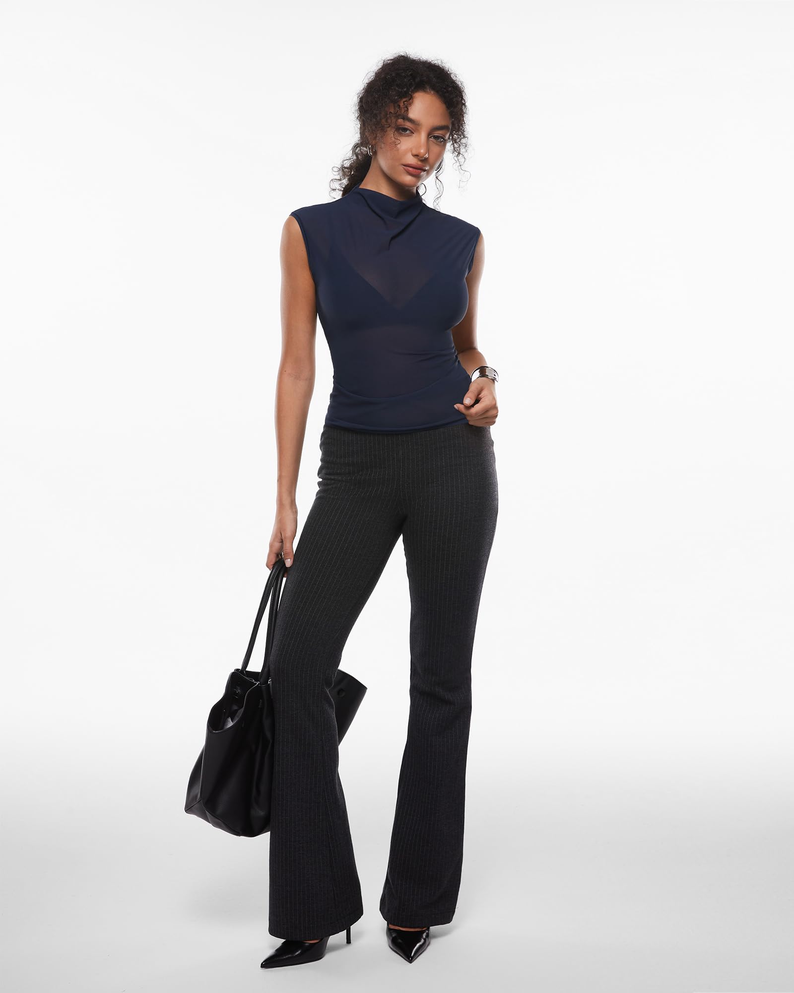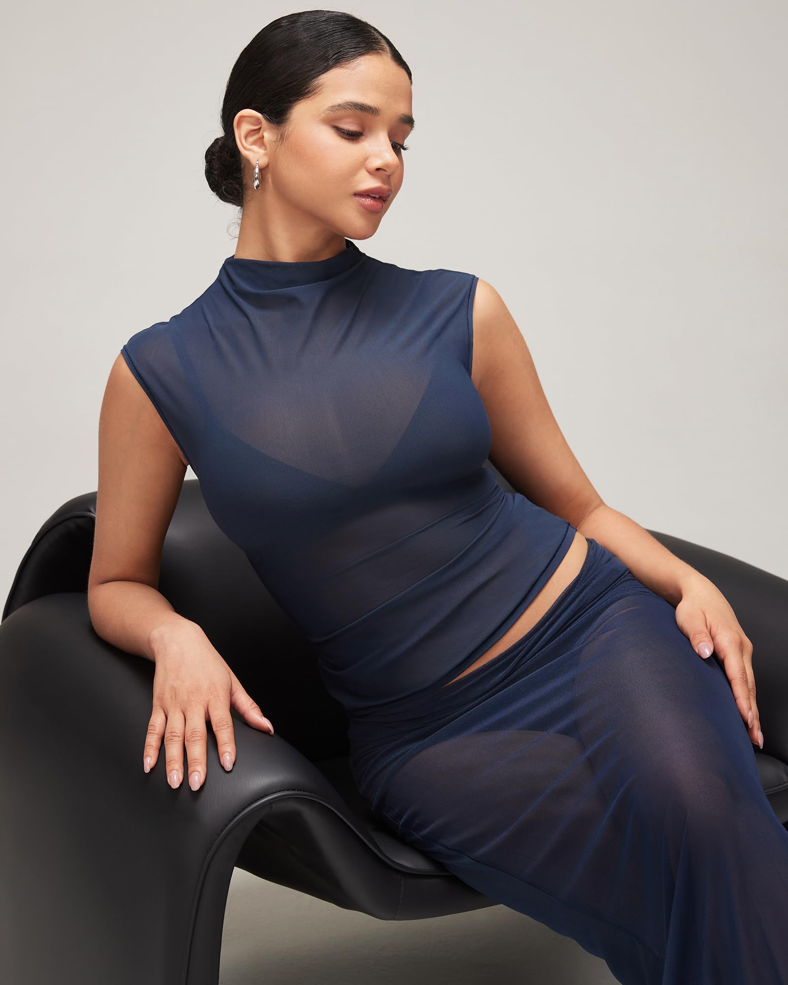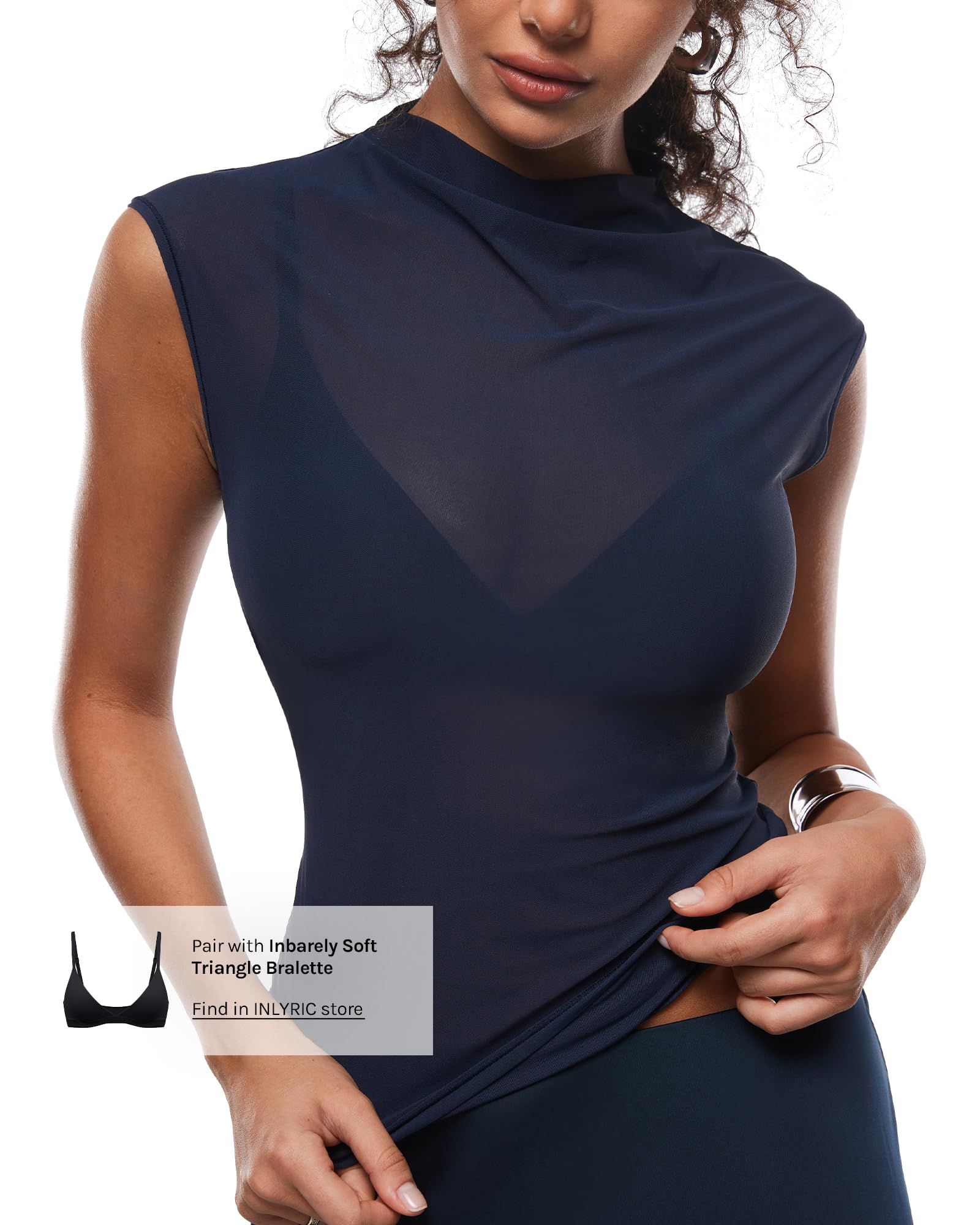 Mock neck tank top with a sheer fabric design shows a feminine look