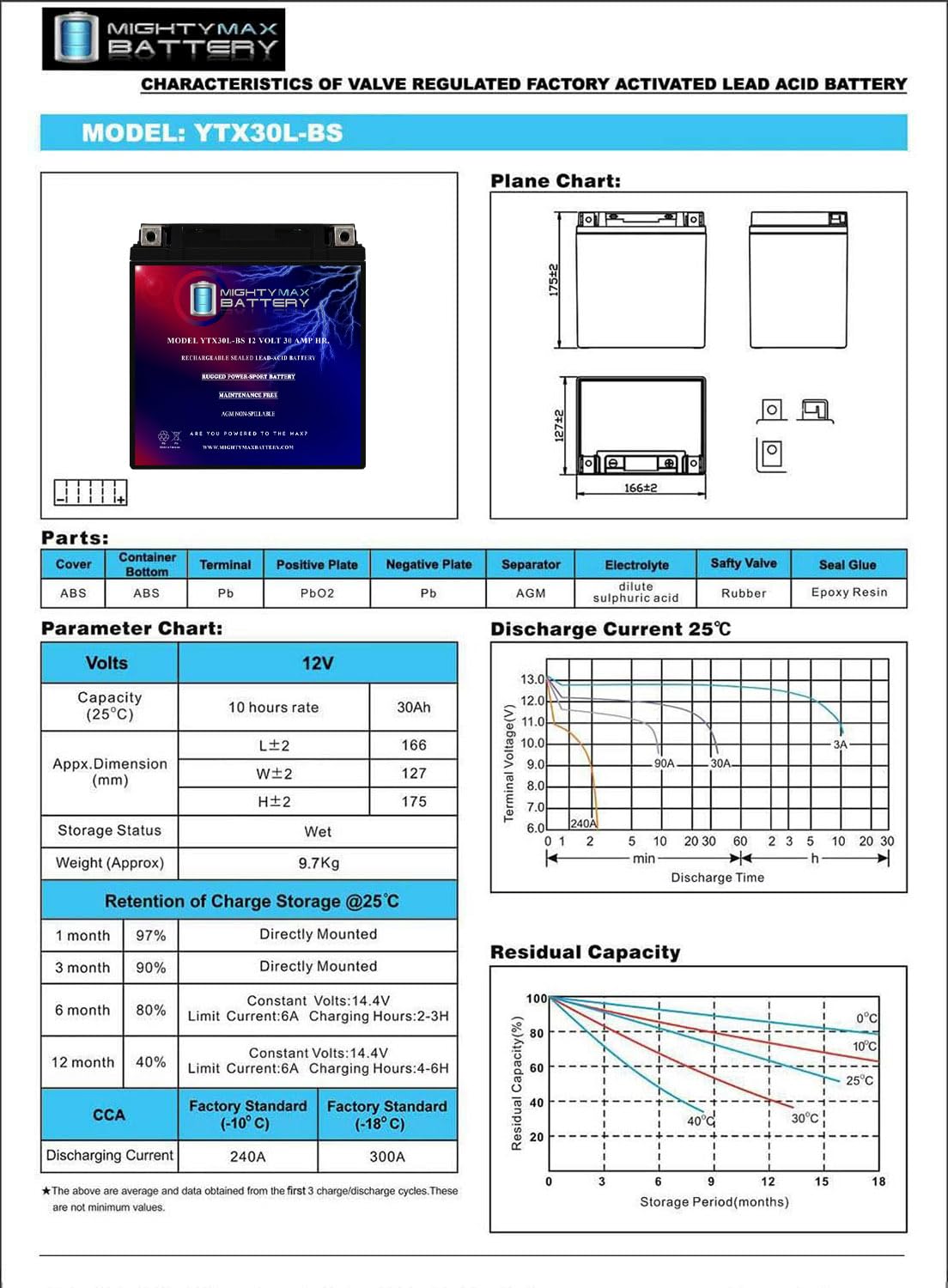 YTX30L-BS is a 12V 30AH 385 Cold Cranking Amps (CCA) Sealed Lead Acid (SLA) Battery