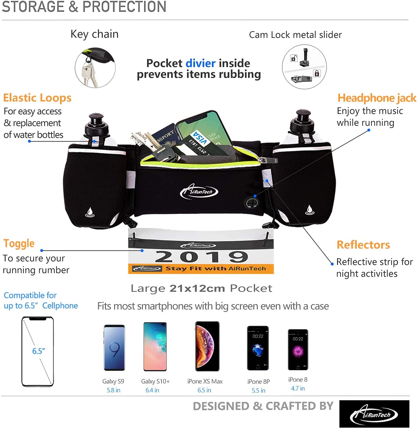SPATIAL DESIGN AND SPORTS PROFESSIONAL: The bottle running belt is perfect for credit cards, ID, keys, paper towel, bars choc, energy gel packs, running accessories, etc, very convenient. Convenient 6.5 Inches Large Pocket fits most smartphone phones up to 6.5 inches, like iPhone 8 Plus, 7S Plus, 6 Plus.