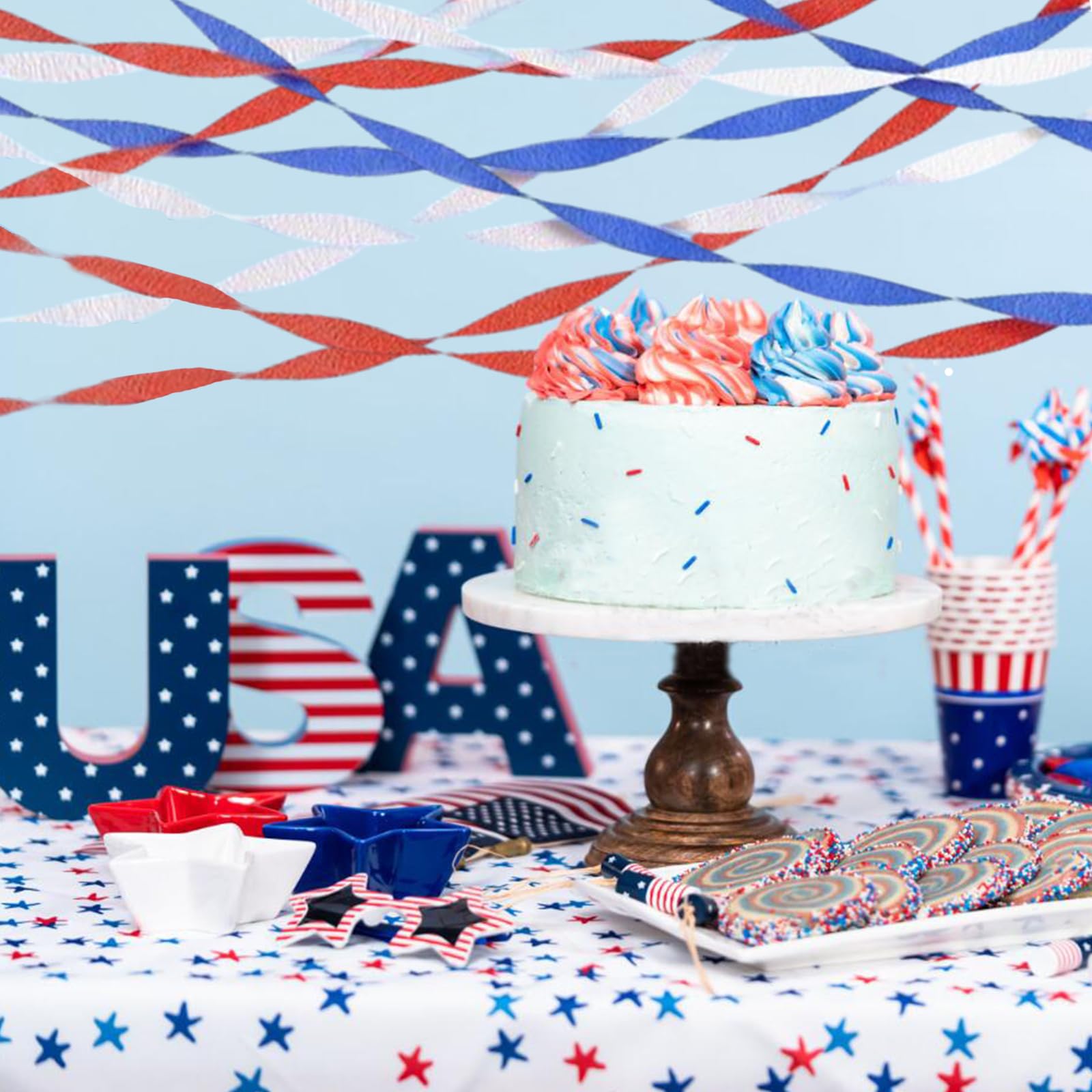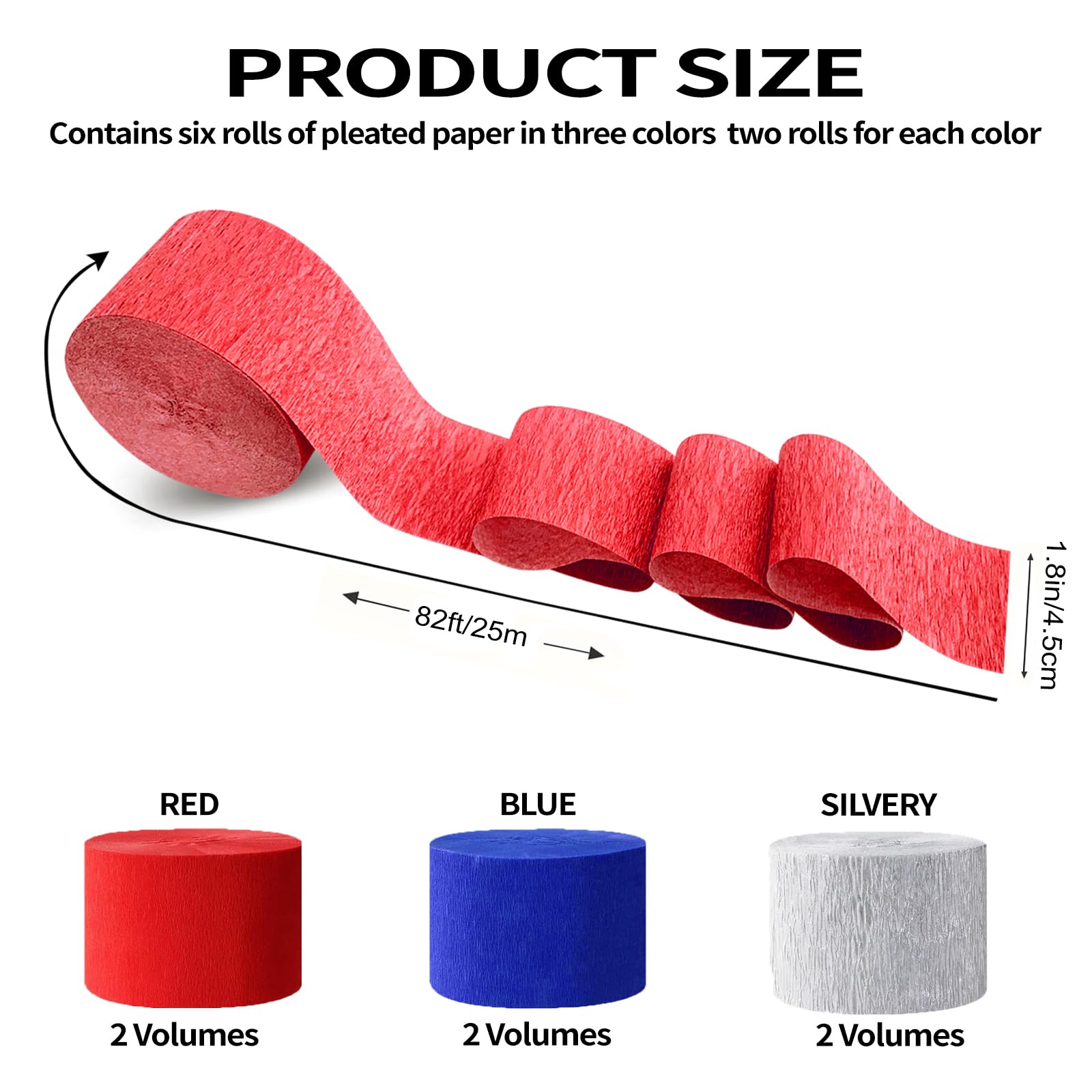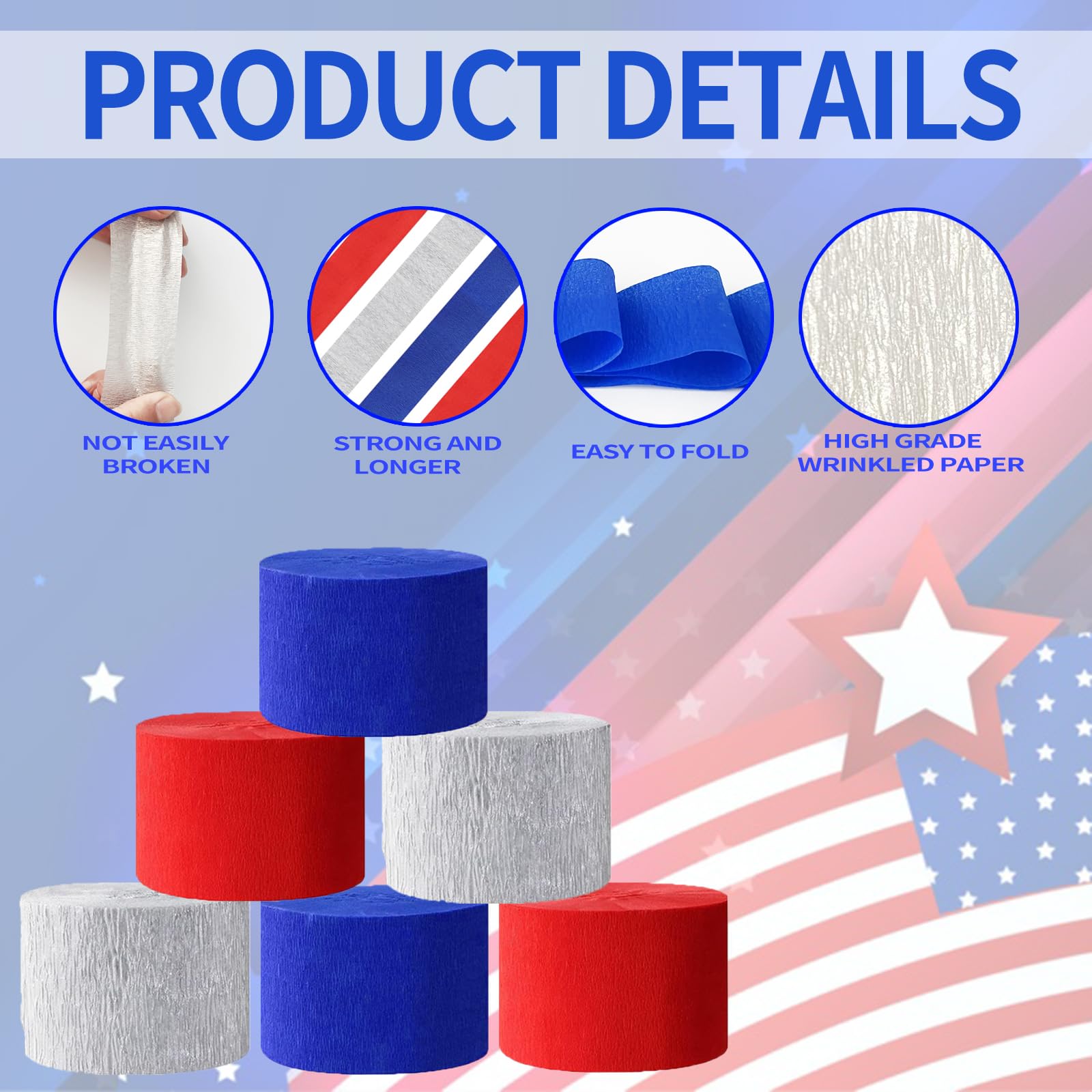 These crepe paper streamers are perfect for decorating for Memorial Day, Fourth of July, Independence Day, and other patriotic holidays. The 6 rolls of crepe paper are each 492 feet long, giving you plenty of streamers to use for your party or event.Independence Day American Theme Party The crepe paper streamers are made of high-quality paper and are decorated with red, blue, and silver tassels, making them a festive and colorful addition to any celebration you can use them both indoors and outdoors without worrying about damage. The streamers are easy to hang and use, and they will add a touch of elegance and sophistication to your party or event. You can simply cut them to the desired length and hang them up using tape or glue. They are also reusable, so you can save money in the long run.,Whether you are hosting a backyard barbecue, a backyard party, or a patriotic-themed event, these crepe paper streamers are the perfect way to add a touch of color and excitement to your celebration.