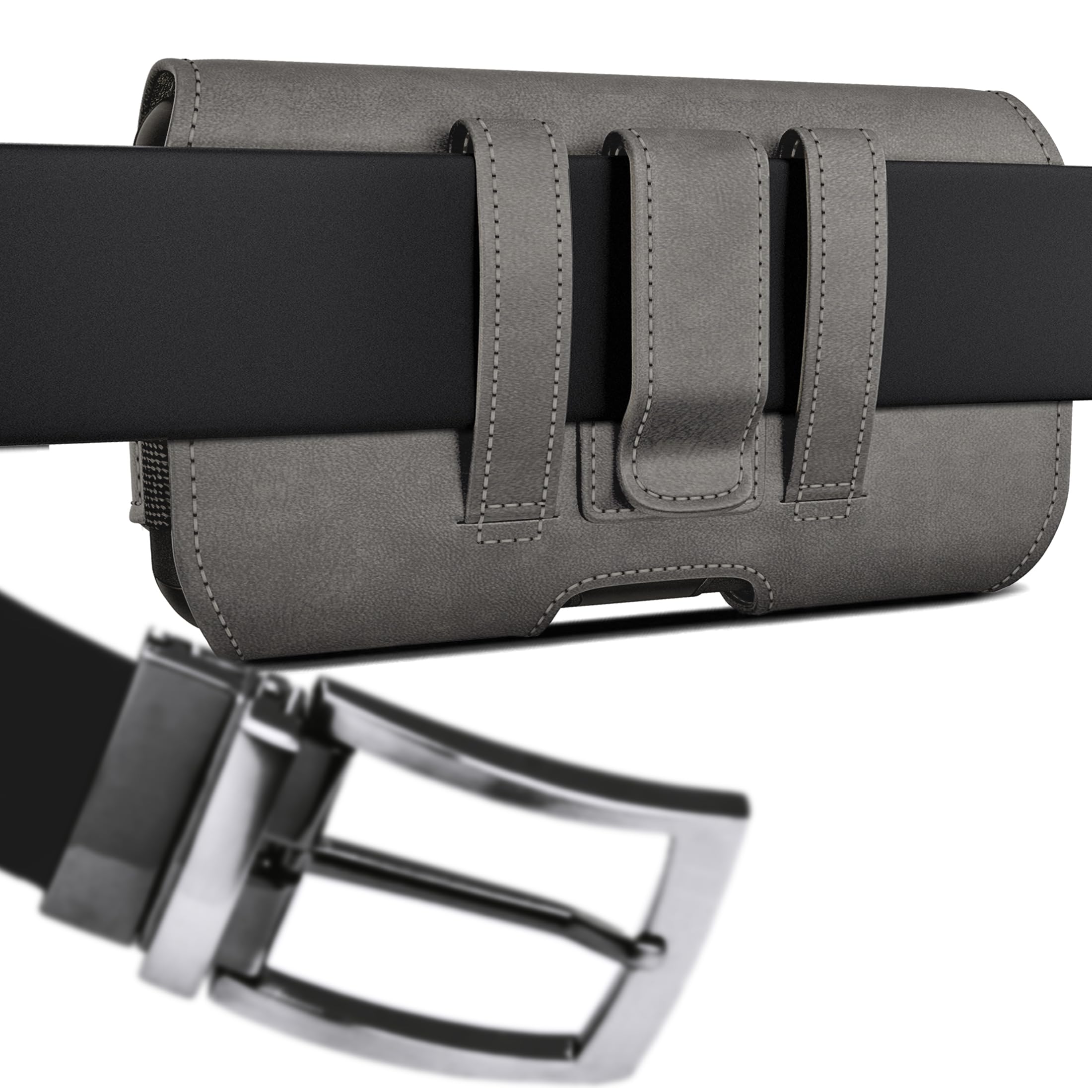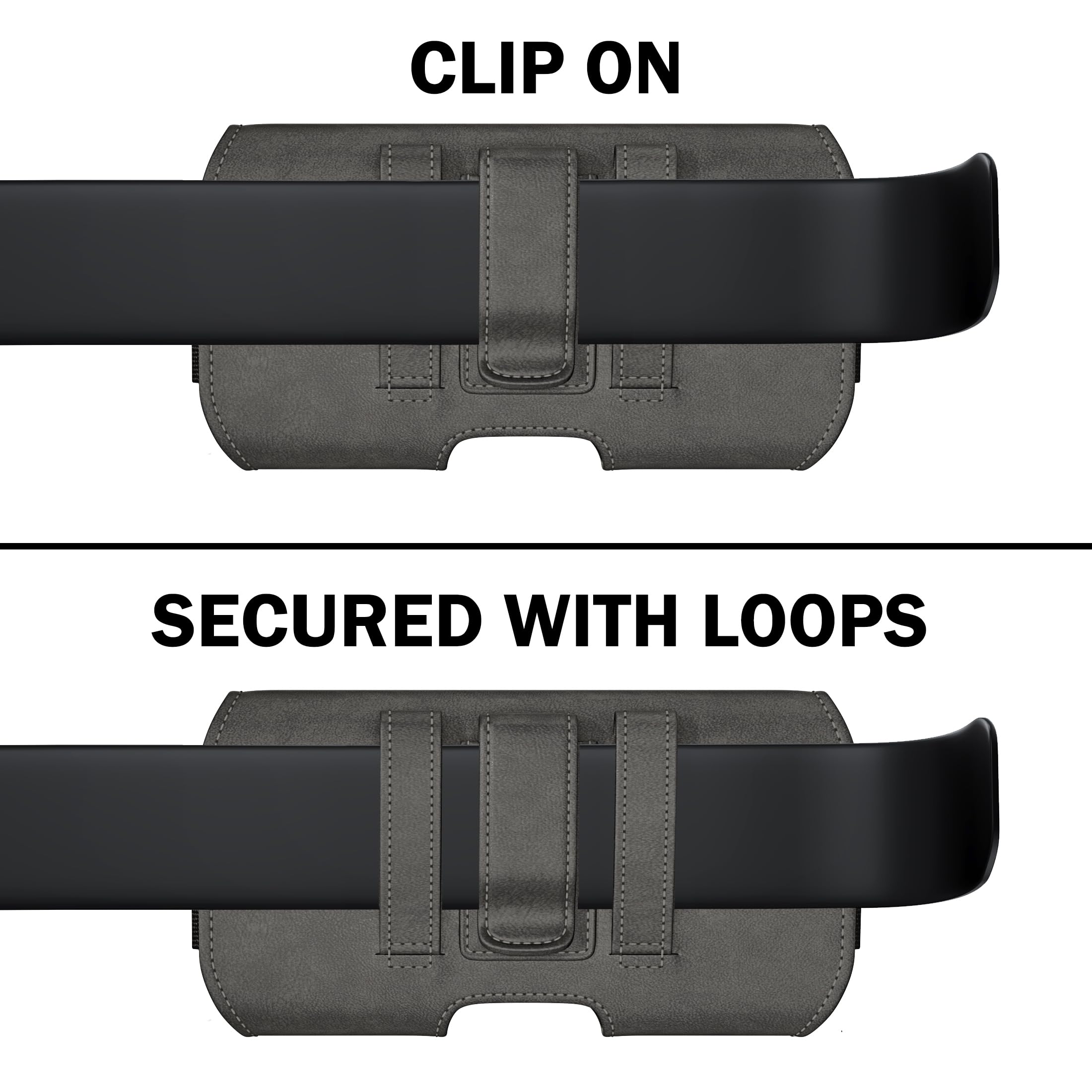 Classic, durable metal belt clip wrapped in leather, featuring two secure belt loops to ensure your phone is safely carried on your belt.