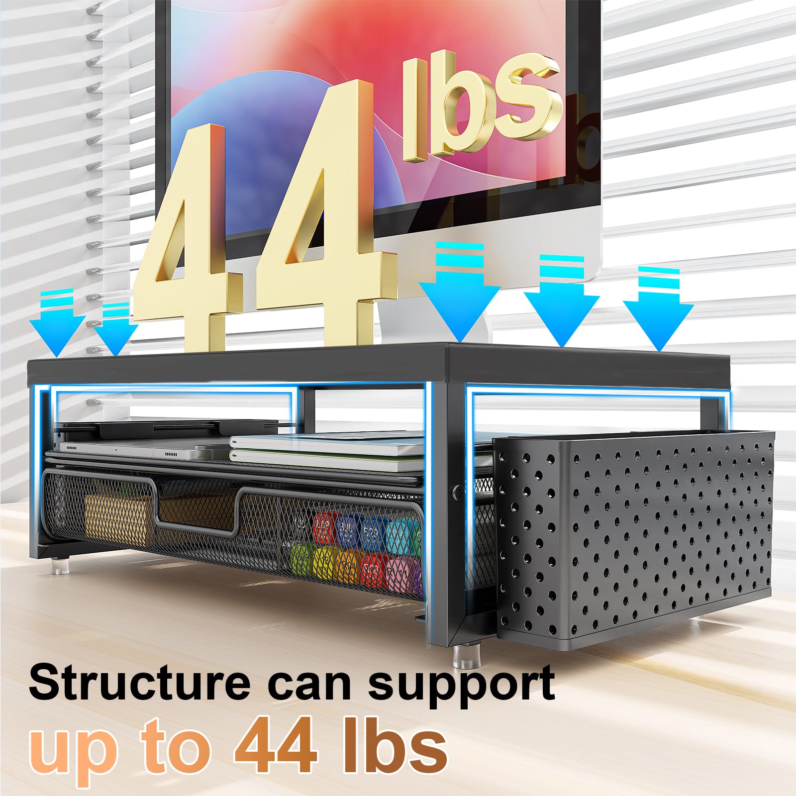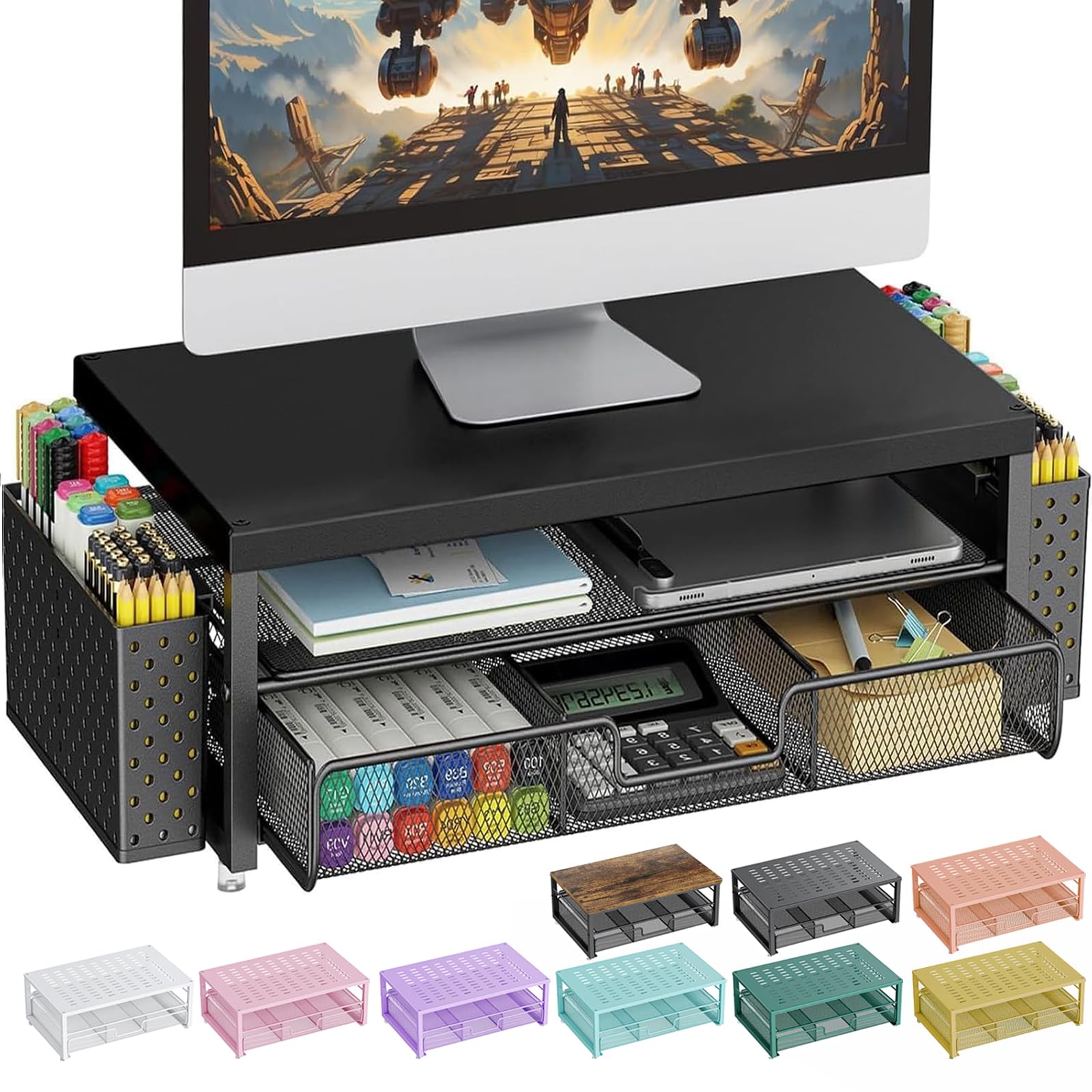 【Organized Storage】This desk monitor stand/organizer features two tiers of storage for files and notes. Equipped with two pen holders and a drawer , it effortlessly organizes pens, scissors, and other desk essentials, keeping everything within reach.