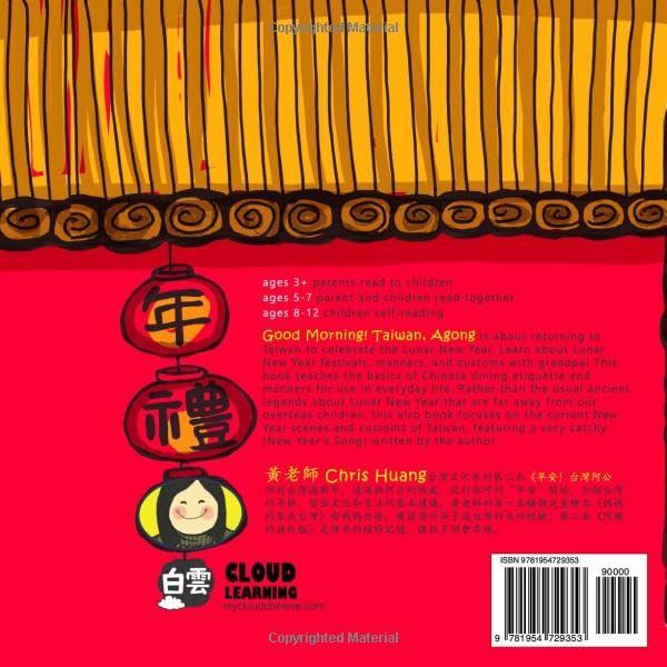 GOOD MORNING! TAIWAN, AGONG Good Morning! Taiwan, Agong《早安!台灣阿公》is about returning to Taiwan to celebrate the Lunar New Year. Learn about Taiwanese Lunar New Year festivals, manners, and customs with grandpa! This book teaches the basics of Chinese dining etiquette and manners for use in everyday life. Rather than the usual ancient legends about Lunar New Year that are far away from our overseas children, this also book focuses on the current New Year scenes and customs of Taiwan, featuring a very catchy [New Year's Song] written by the author. Good Morning! Taiwan, Agong《早安!台灣阿公》is written in Traditional Chinese characters, Zhuyin, Pinyin and English. Good Morning! Taiwan, Agong 《早安!台灣阿公》is perfect for both native and non-native Mandarin speakers. It is written and illustrated by bilingual children’s book author and illustrator, Chris Huang. Huang’s fun, cute, creative and original illustrations easily capture children’s learning interests. Pinyin and English will help you and your child read and learn without being fluent in Chinese. This book is suitable for parents to read to children ages 3 and up, for parents and children 3-5 years old to read together, and for self-reading children ages 6-12. 請大家支持海外繁體、注音、拼音、中英雙語兒童原著繪本。 我們海外的孩子,常給人一種“沒禮貌”的印象,這歸咎於不同成長環境的文化衝突。《早安!台灣阿公》是孩子回到台灣過新年,從與阿公打招呼的“早安”開始,透過瞭解台灣的年節習俗文化,更進一步讓孩子學習各種生活禮節,包括食衣住行的基本禮節,還有最重要的餐桌禮儀。不同於其他遙遠的年節古老故事,或是完全不搭嘎的生活文化,《早安!台灣阿公》專注在現下可見的台灣人的年節樣景。繪本最後包括之前撰寫【新年歌】,分有三個階程,附有影音連結,内容非常朗朗上口。 《早安!台灣阿公》内有許多習俗部分是刻意沒有寫下細節,一來是保有文字的通暢,以免讓年幼的孩子覺得教條無趣,二來是給家長們有機會和孩子們深談背後的原由,拉近和孩子的距離。 繪作者黃老師 Chris Huang 定居芝加哥30年,擁有深厚美術設計經驗,及師範背景和豐富教學經驗。退休後投入僑教中文敎育,創辦白雲華語學苑。為了鼓勵學生學習中文,開啓了她一系列的兒童繪本及敎材創作。她的文字童趣十足,插畫風格鮮明活潑,筆觸自然,色彩豐富,深受家長和孩子們的喜歡。 深耕海外僑童教育的黃老師 Chris Huang, 雖然寫的和畫的是給孩童,但往往感動的是讀給孩子聽的家長。她寫下的隻字片語背後,一貫風格都具有深遠的傳承意義,所以建議家長與孩子一起共讀,也把家長的心裡話和孩子分享。 黃老師的第一本暢銷兒童繪本《媽媽的家在台灣》由媽媽出發,廣談海外孩子返台灣的美好經驗,第二本《阿嬤的滷肉飯》是傳承的縮時故事,讓孩子領會孝順。第三本《早安!台灣阿公》談台灣的習俗文化和禮節。敬請期待這系列海外孩子的台灣移民文化傳承的第四本!同樣是海外台灣兒童的必讀繪本,誠心建議家長們收藏及送禮。 文字:中英雙語、繁體注音、拼音。 適合閲讀年齡: 3-5歲陪讀,5-7歲共讀,8-12歲自讀
