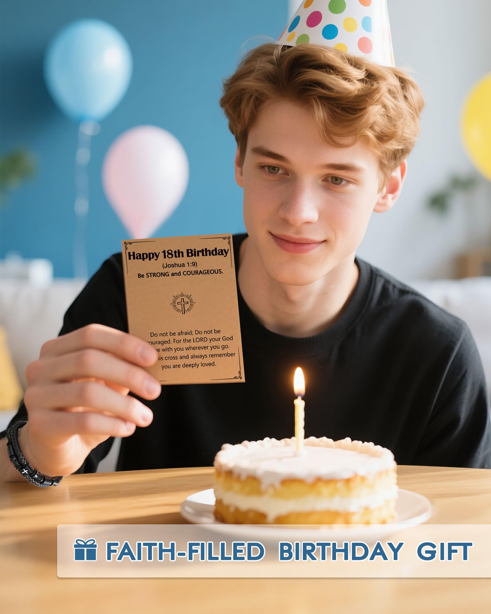 18th Birthday Faith & Courage: The cross symbolizes faith, strength, and courage, paired with a Joshua 1:9 birthday card celebrating his 18th birthday with "Be strong and courageous," inspiring his faith and reminding him he's deeply loved.