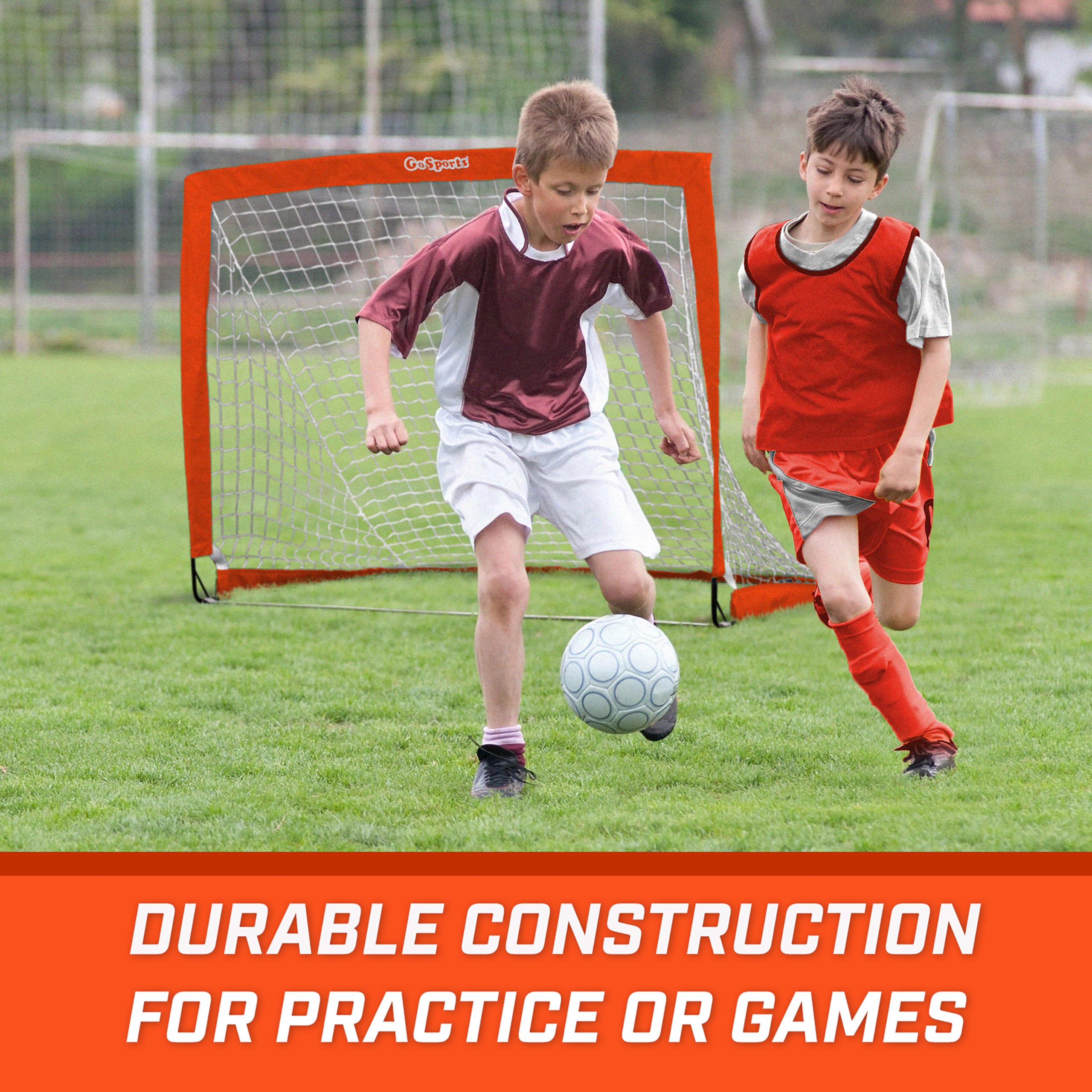 TRAIN AND PLAY: Build confidence in the backyard or use the goals on gameday; Includes 1 pop-up 4 ft x 3 ft soccer goal net and 3 metal stakes for stability; Perfectly sized for kids and youth sports, and great for budding soccer players