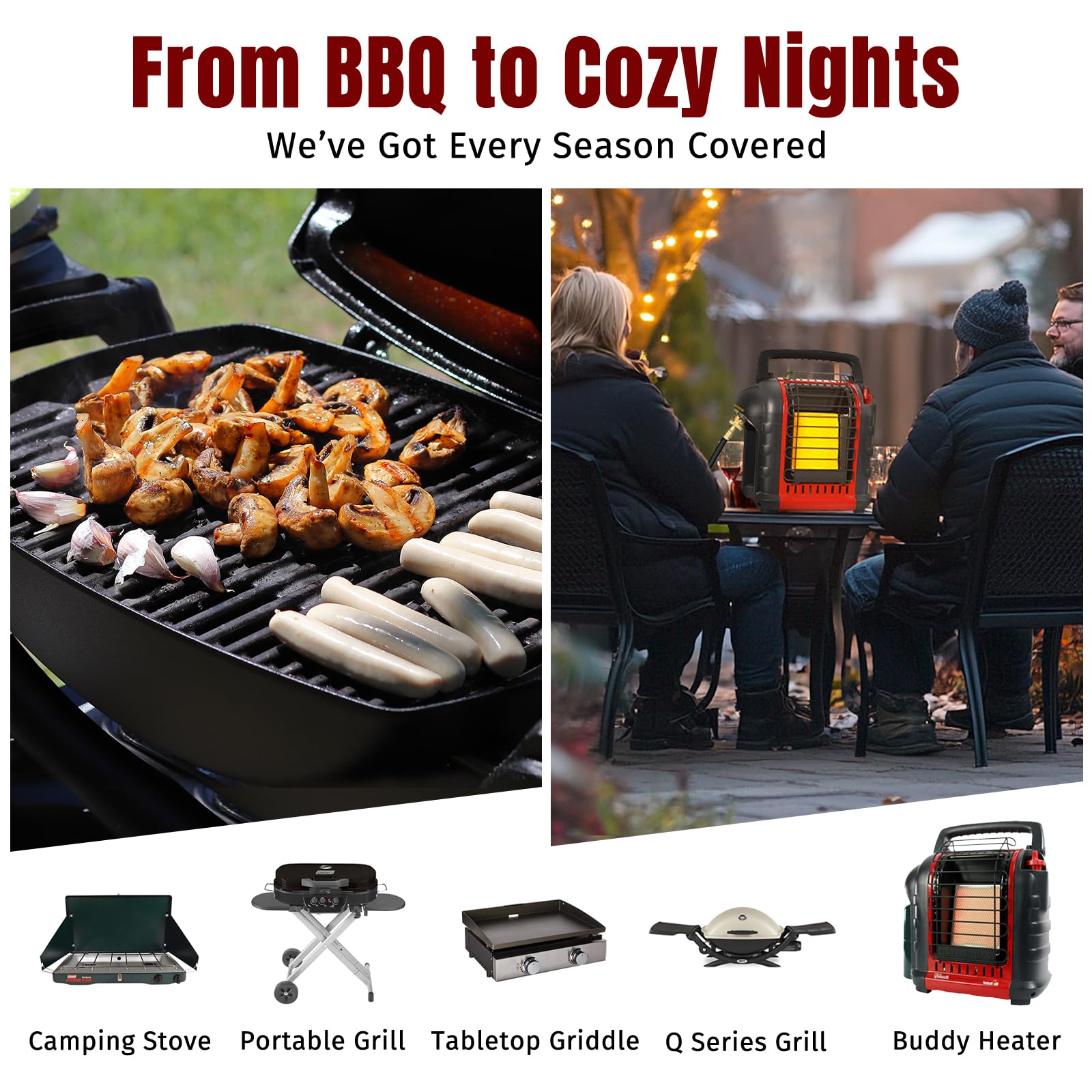 Versatile Compatibility: Compatible with a wide range of appliances, including Mr. Heater buddy heater, Weber Traveler Portable Grill, Weber Q grill, Coleman stove, Blackstone griddle, and more